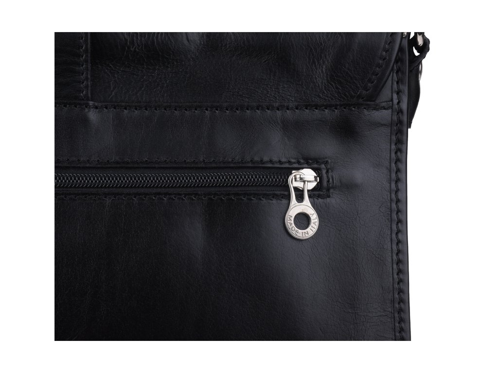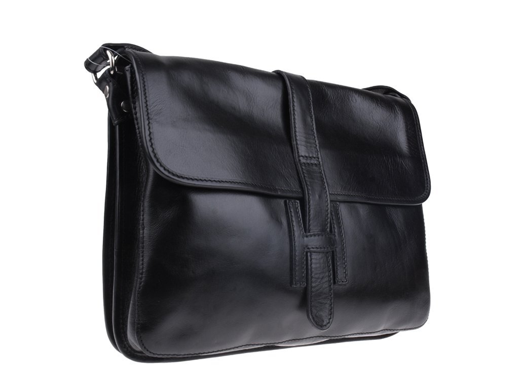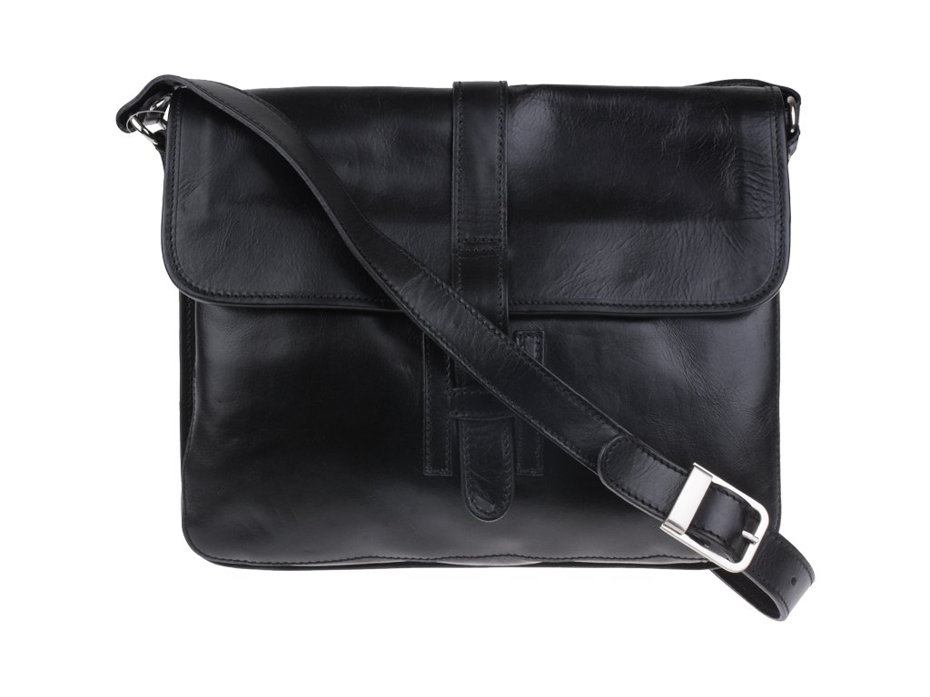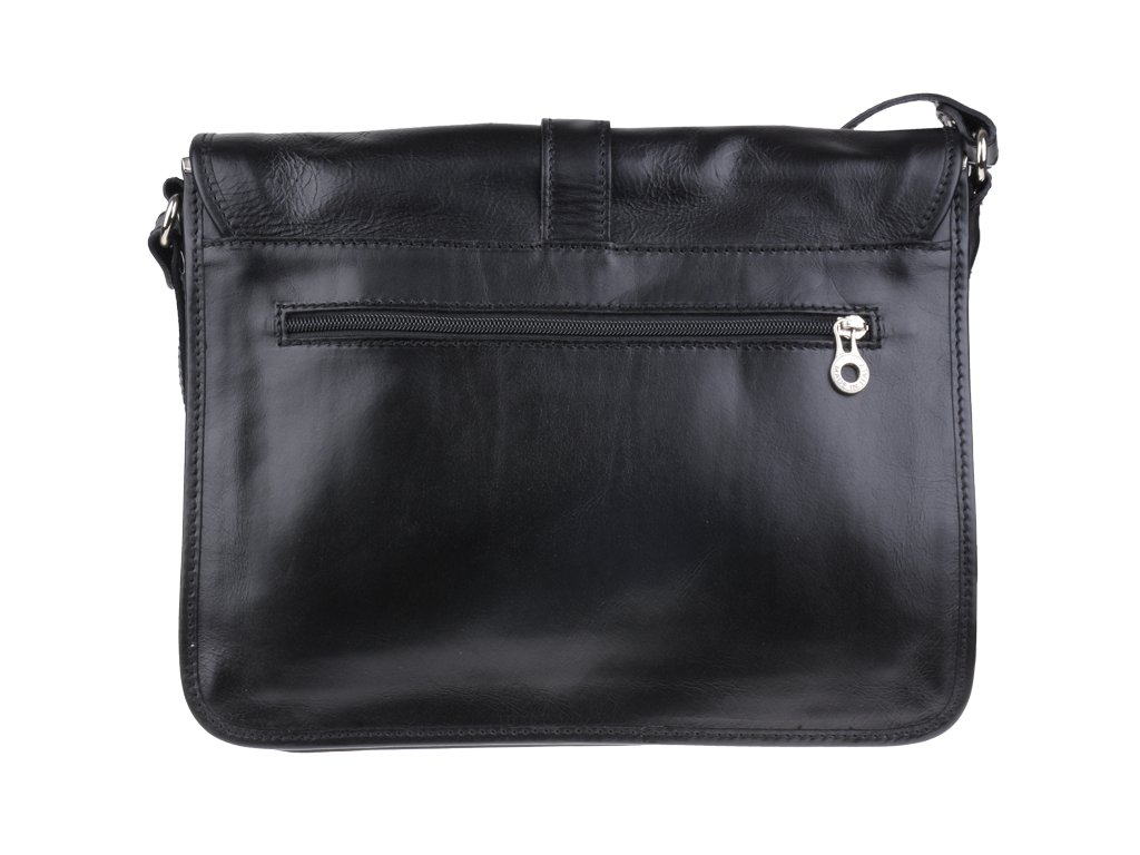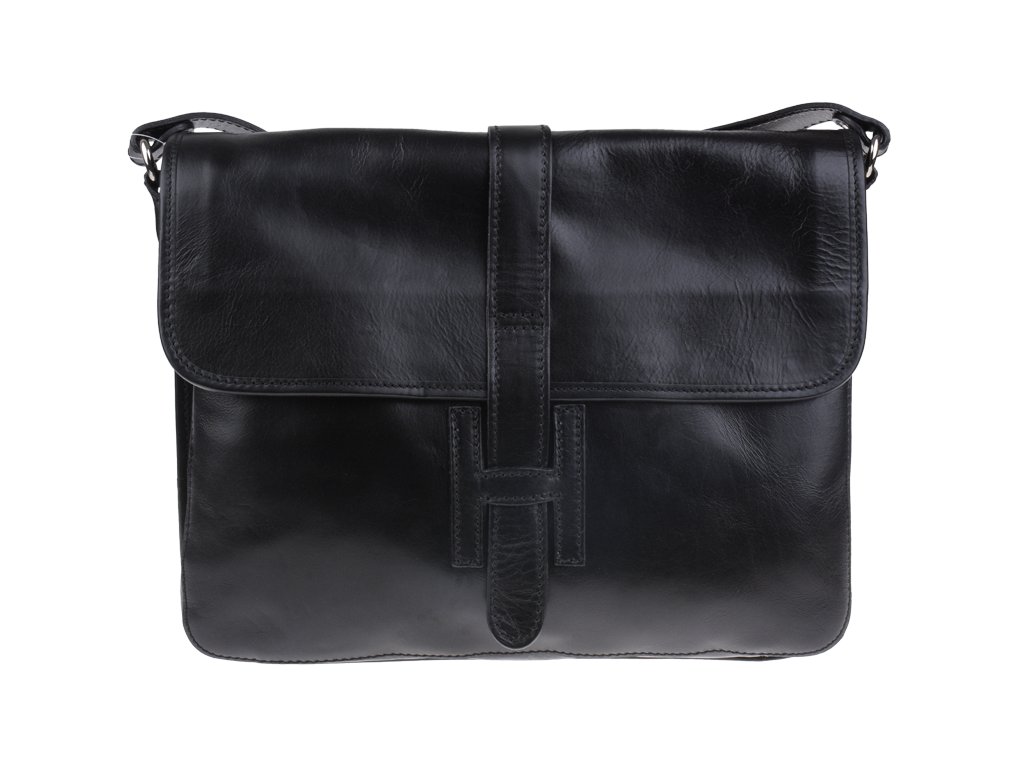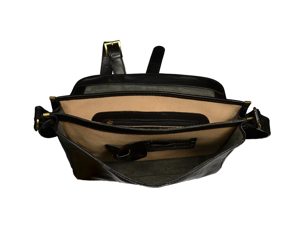 Nádherná kožená vintage kabelka v černé barvě s jedinečným nápaditým zapínáním. Vnitřek kabelky je rozdělen na dvě části a disponuje malou kapsou na zip a koženými doplňky na uchycení psacích potřeb.
