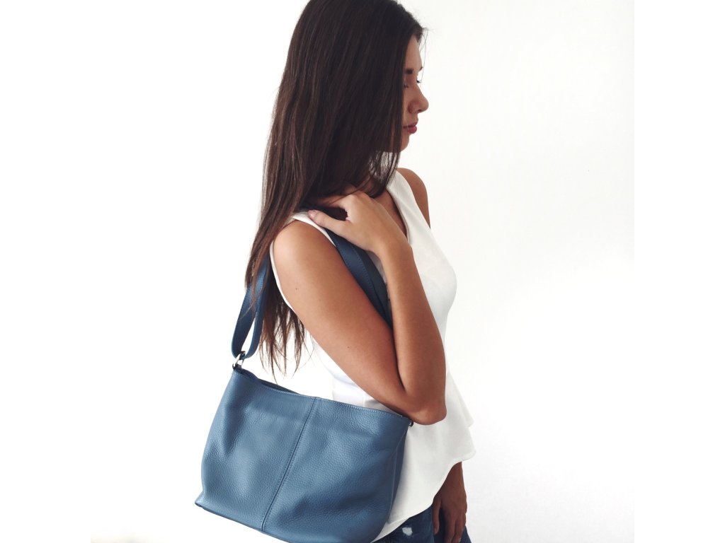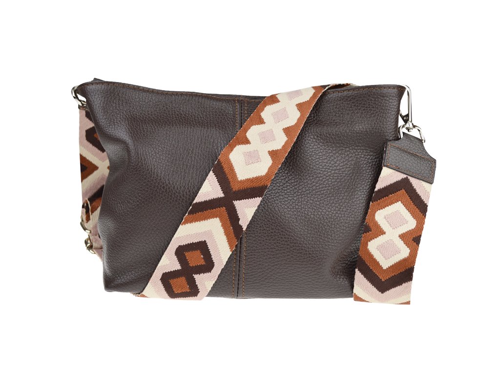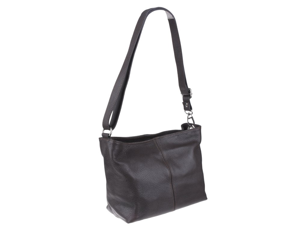 Kabelka nositelná přes rameno či cross-body (křížem). Hnědá kožená kabelka je uzavíratelná na zip. Uvnitř kabelky najdeme přepážku uprostřed, která zároveň slouží jako kapsa na zip, a na boční stěně pak kapsu na zip. Hloubka jejího dna je 13 cm. Kabelka má navíc nastavitelný popruh s maximální délkou cca 120 cm.