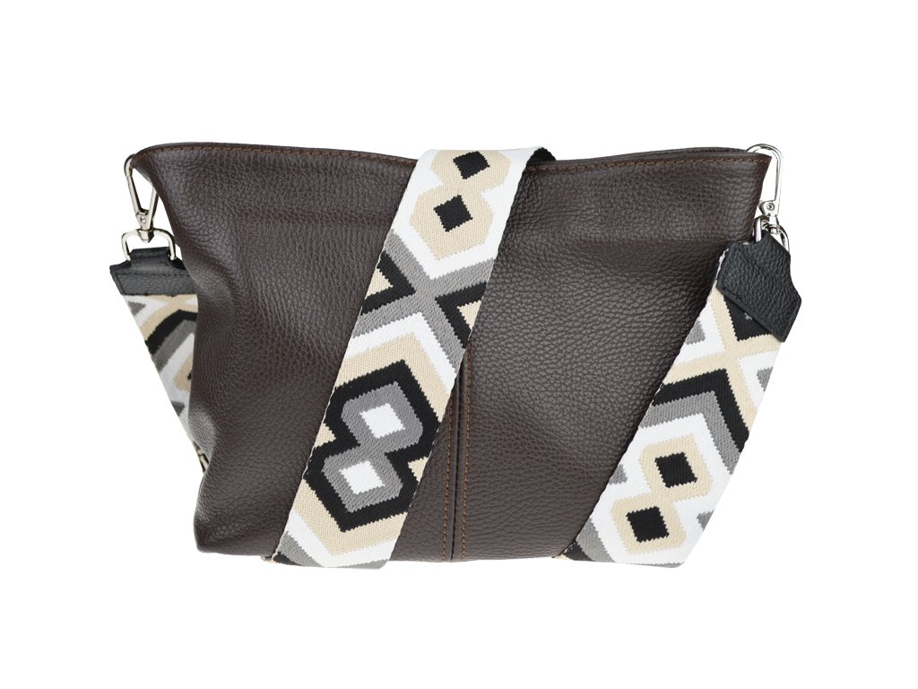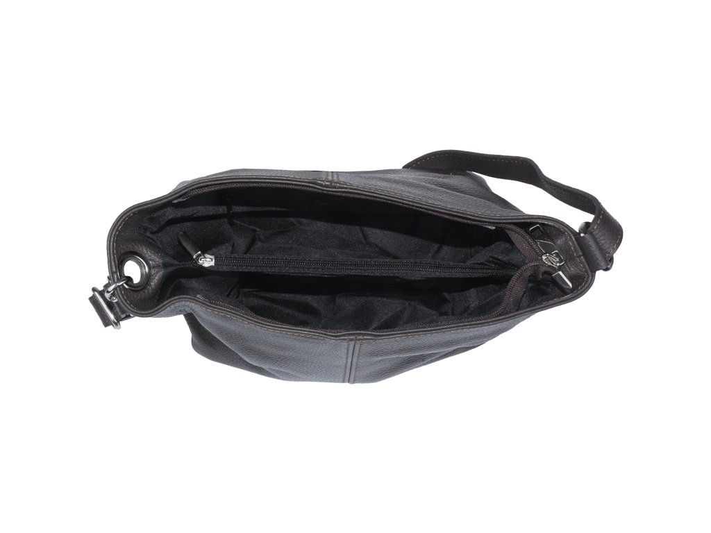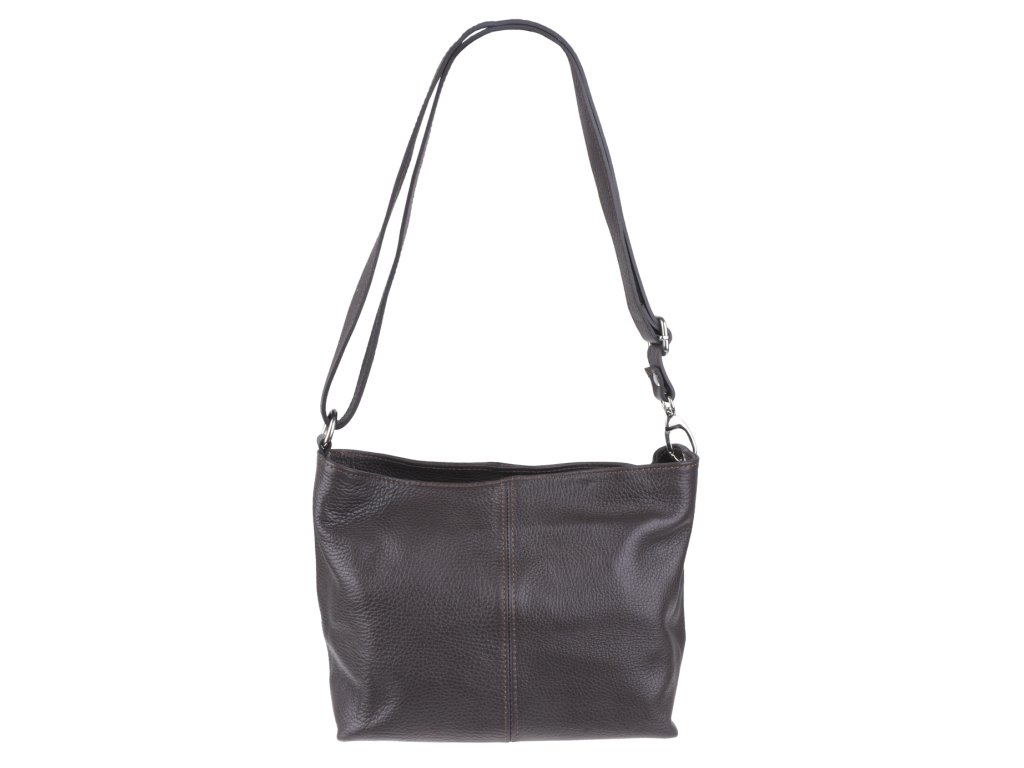 Kabelka nositelná přes rameno či cross-body (křížem). Hnědá kožená kabelka je uzavíratelná na zip. Uvnitř kabelky najdeme přepážku uprostřed, která zároveň slouží jako kapsa na zip, a na boční stěně pak kapsu na zip. Hloubka jejího dna je 13 cm. Kabelka má navíc nastavitelný popruh s maximální délkou cca 120 cm.