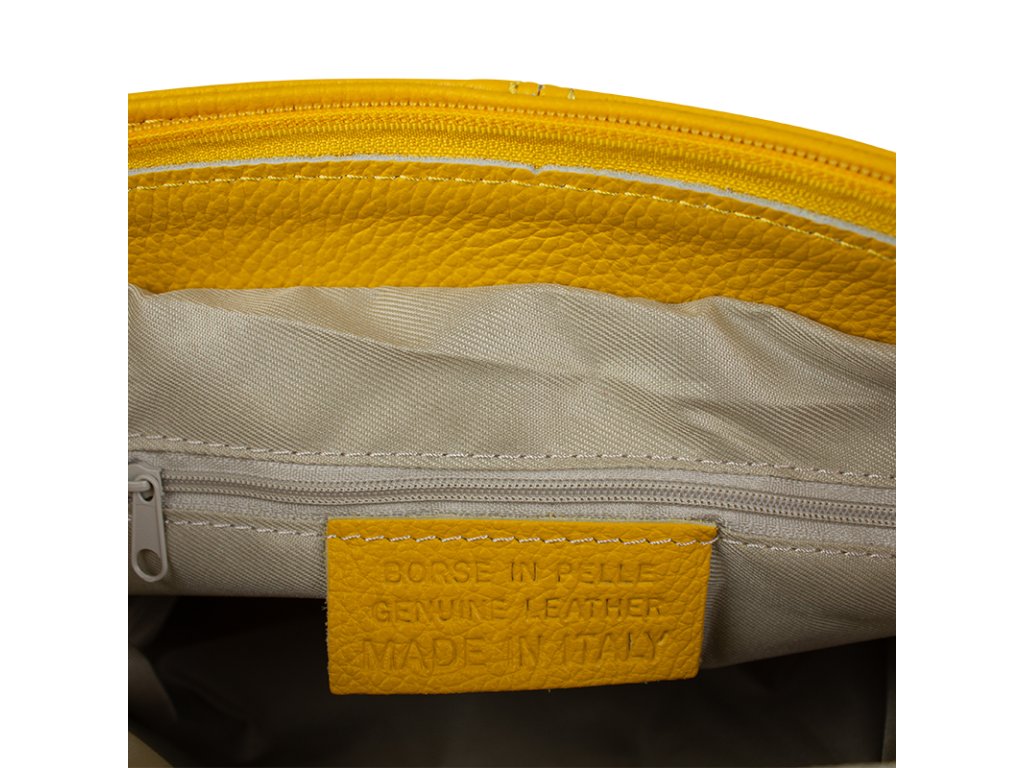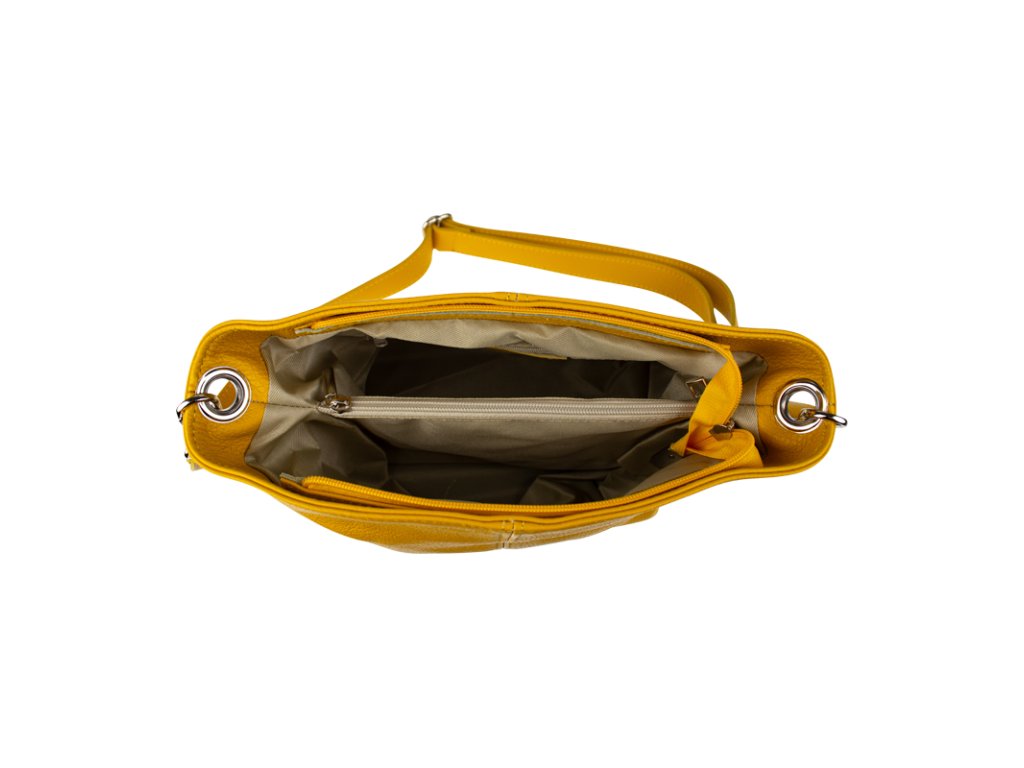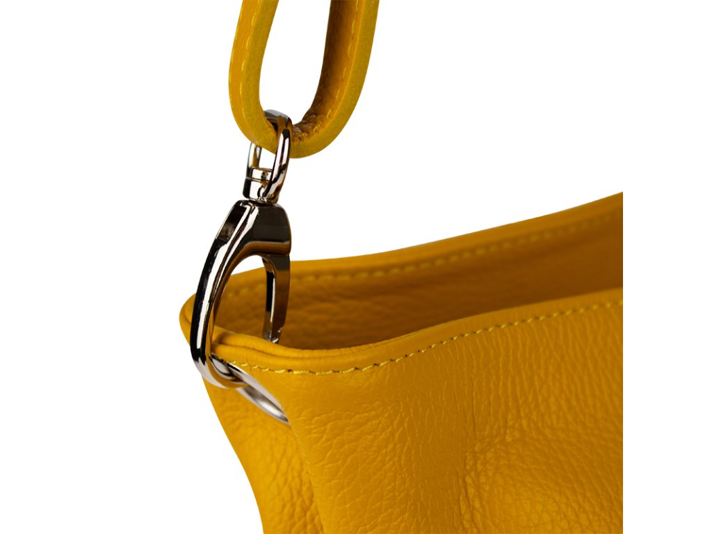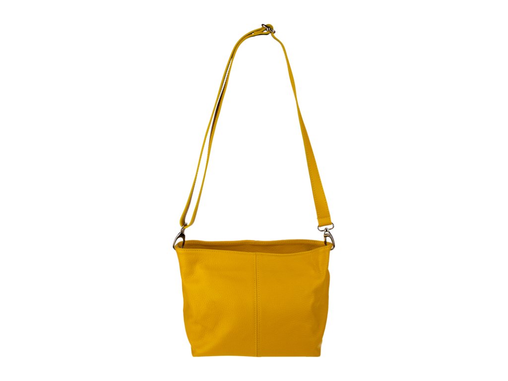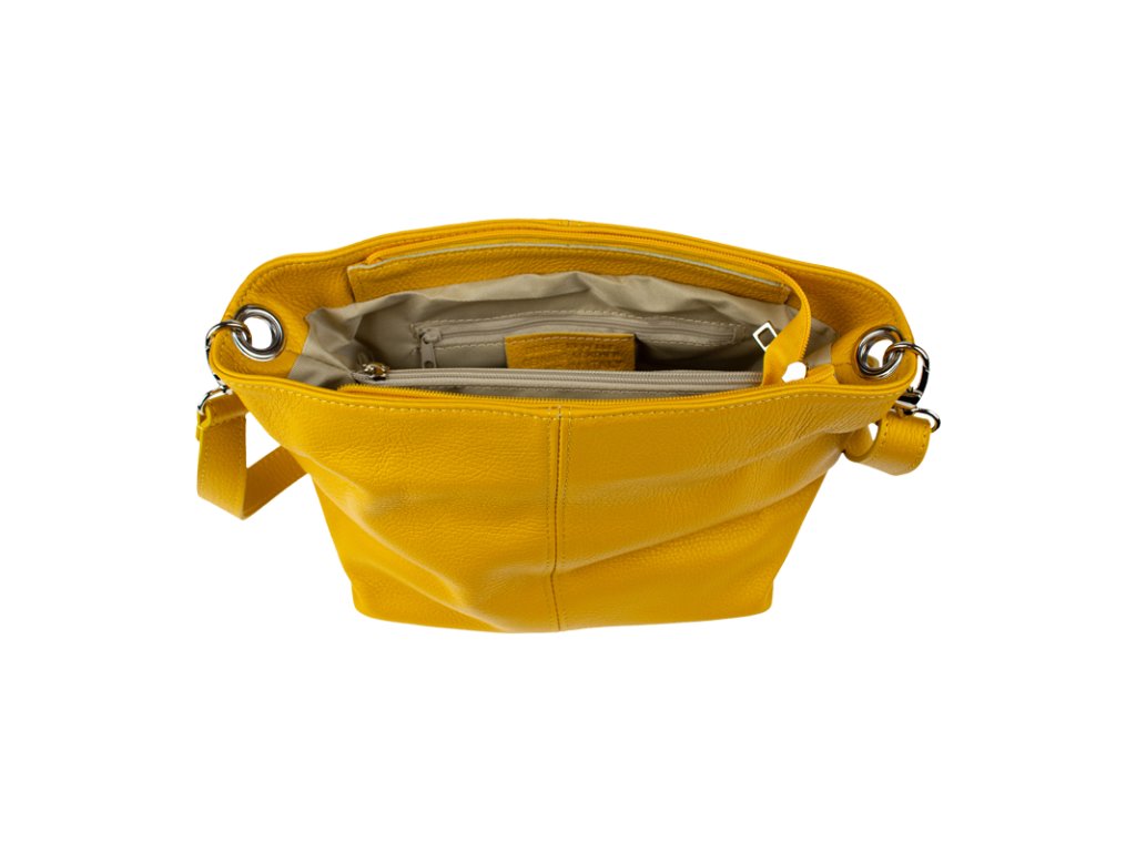 Žlutá kabelka nositelná přes rameno či cross-body (křížem). Tato kožená kabelka je uzavíratelná na zip. Uvnitř kabelky najdeme přepážku uprostřed, která zároveň slouží jako kapsa na zip, a na boční stěně pak kapsu na zip. Hloubka jejího dna je 13 cm. Kabelka má navíc nastavitelný popruh s maximální délkou cca 120 cm.