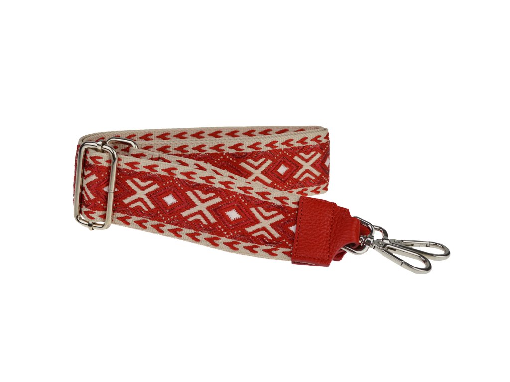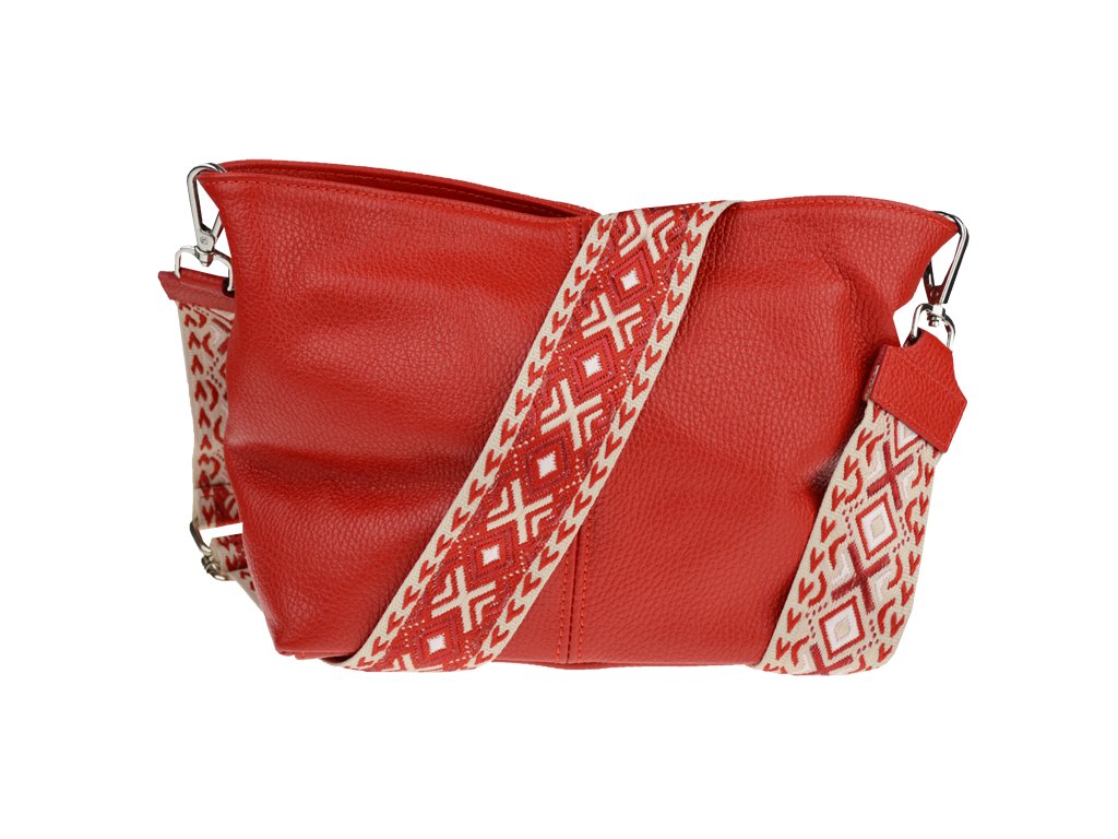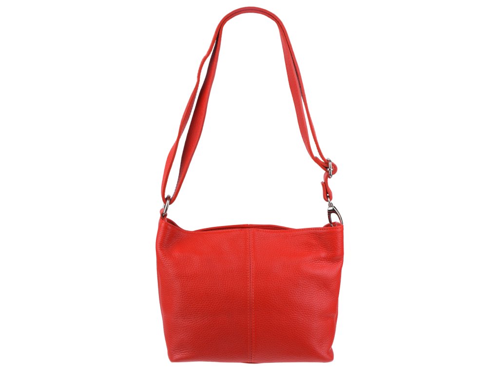 Červená kabelka nositelná přes rameno či cross-body (křížem). Tato kožená kabelka je uzavíratelná na zip. Uvnitř kabelky najdeme přepážku uprostřed, která zároveň slouží jako kapsa na zip, a na boční stěně pak kapsu na zip. Hloubka jejího dna je 13 cm. Kabelka má navíc nastavitelný popruh s maximální délkou cca 120 cm.