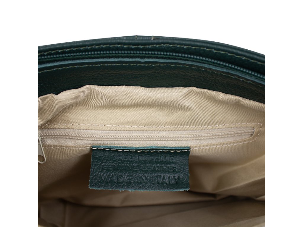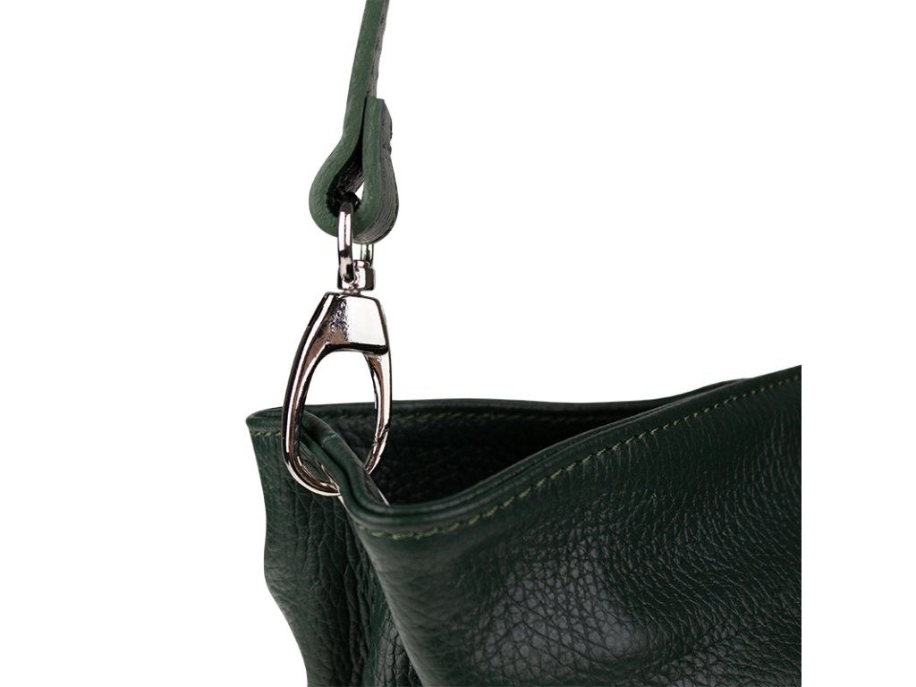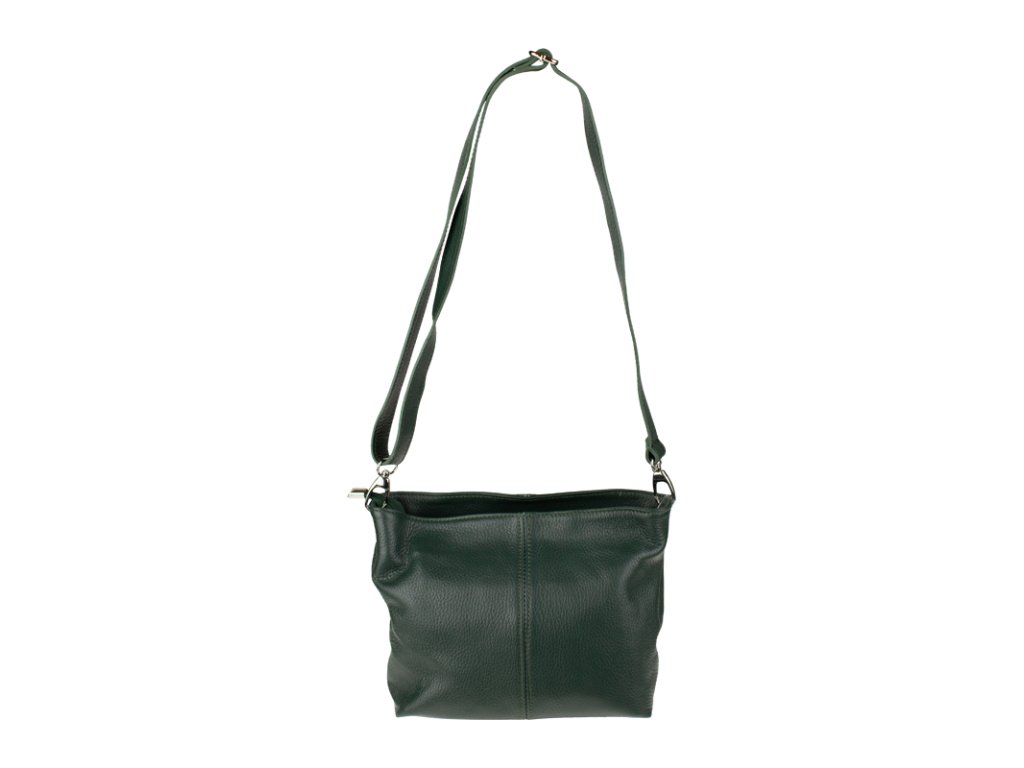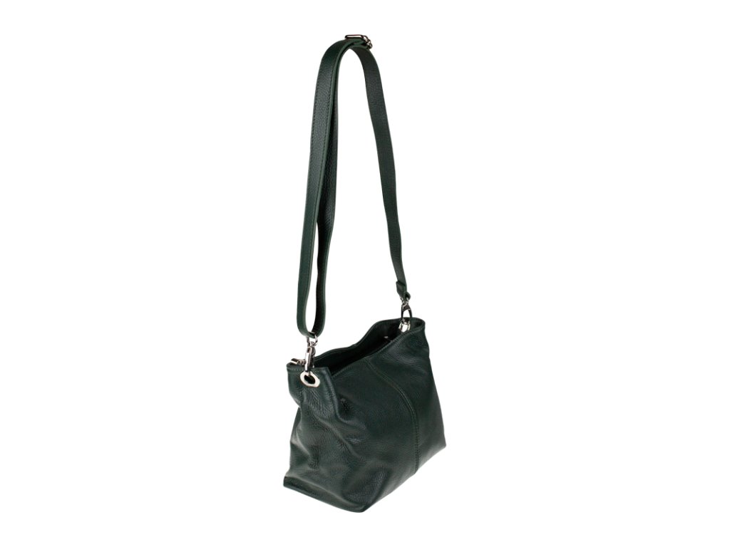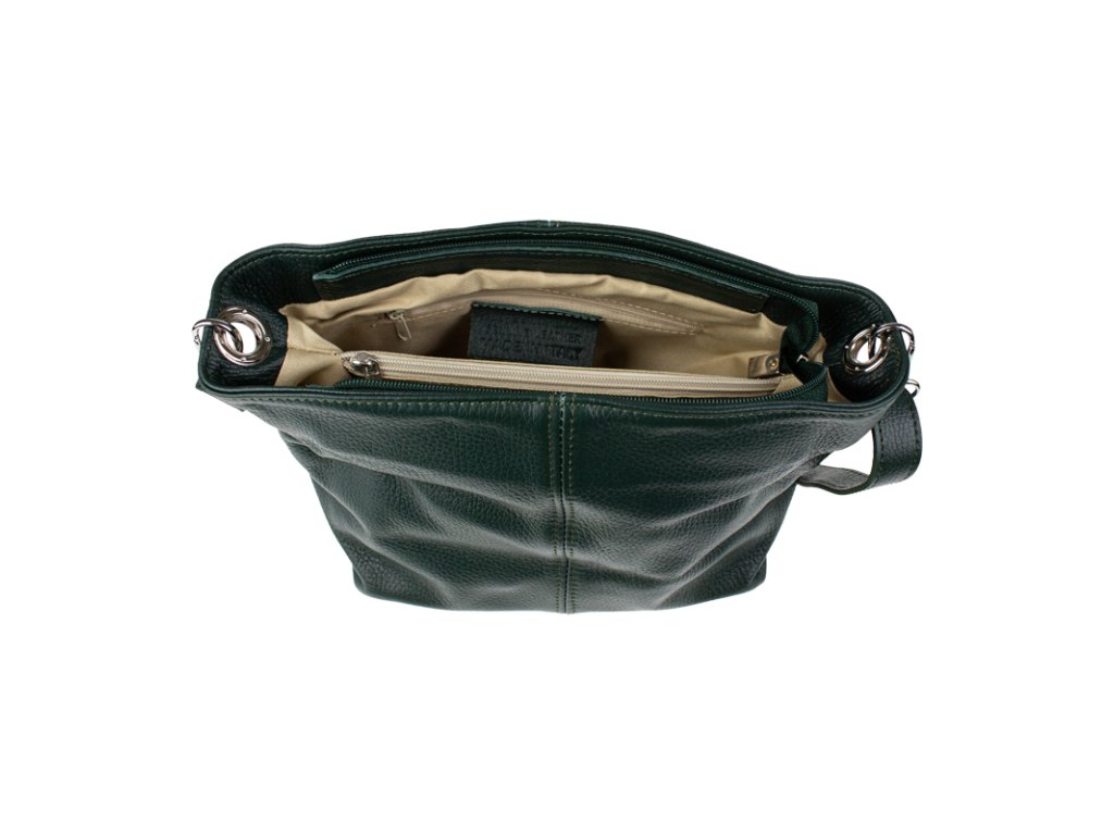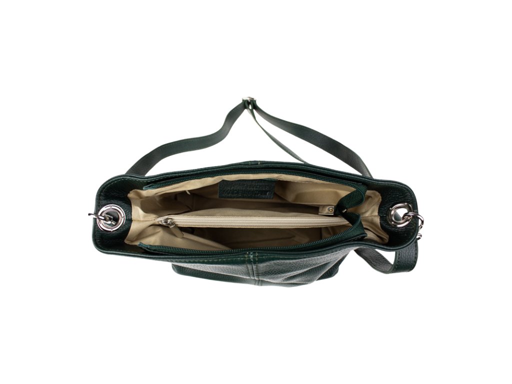 Kabelka nositelná přes rameno či cross-body (křížem). Zelená kožená kabelka je uzavíratelná na zip. Uvnitř kabelky najdeme přepážku uprostřed, která zároveň slouží jako kapsa na zip, a na boční stěně pak kapsu na zip. Hloubka jejího dna je 13 cm. Kabelka má navíc nastavitelný popruh s maximální délkou cca 120 cm.