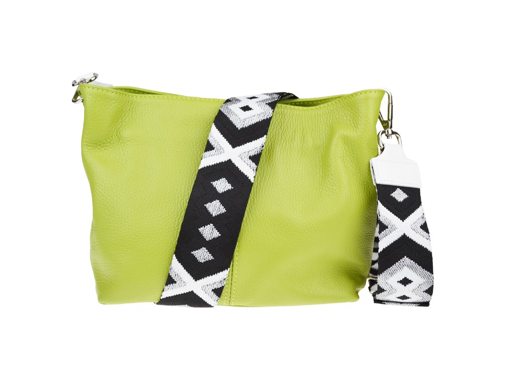 Kabelka nositelná přes rameno či cross-body (křížem). Zelená kožená kabelka je uzavíratelná na zip. Uvnitř kabelky najdeme přepážku uprostřed, která zároveň slouží jako kapsa na zip, a na boční stěně pak kapsu na zip. Hloubka jejího dna je 13 cm. Kabelka má navíc nastavitelný popruh s maximální délkou cca 120 cm.