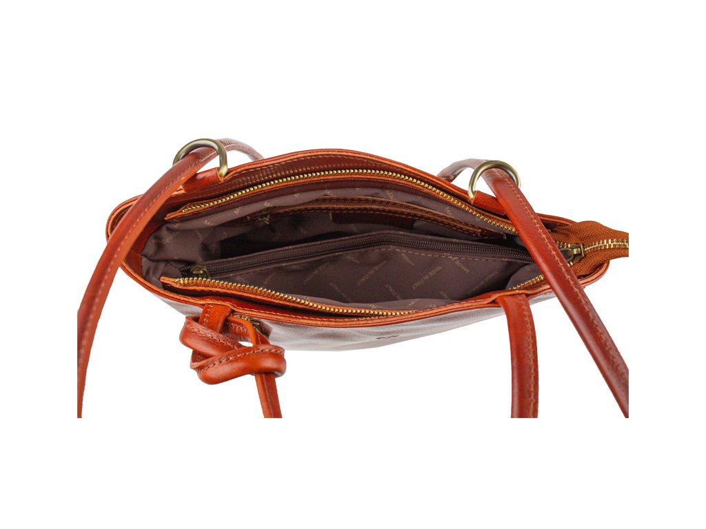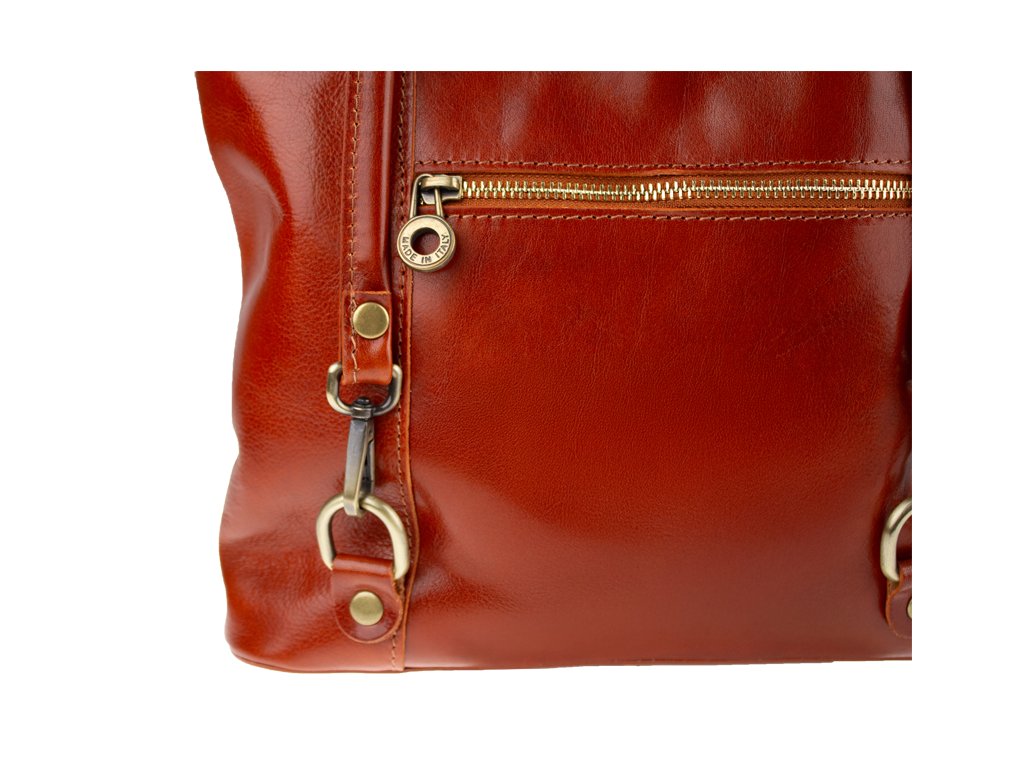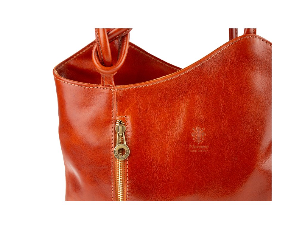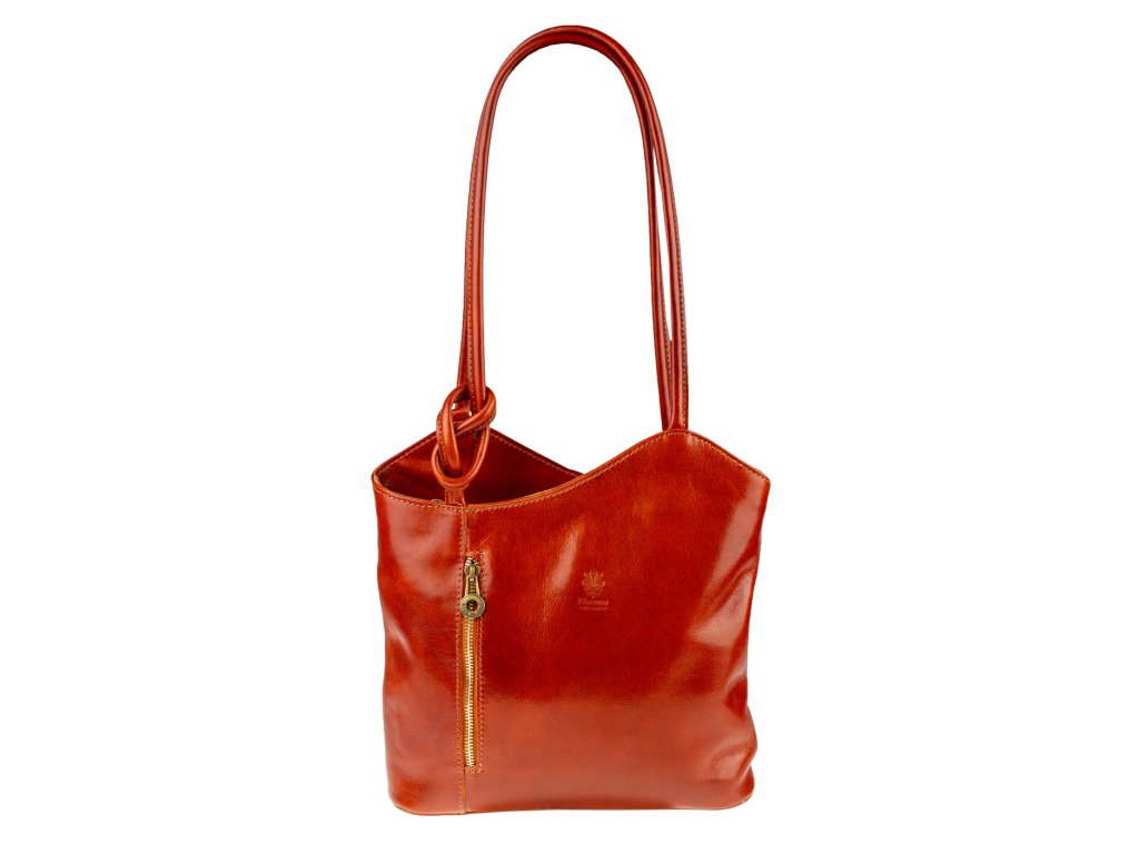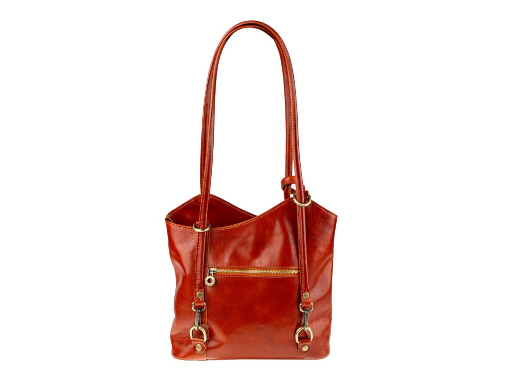 Krásná kožená kabelka v červené barvě. Výhodou této kabelky je, že ji lze nosit přes rameno, stejně tak jako batůžek. Je uzavíratelná na zip. Uvnitř má látkovou přepážku s kapsou, dále pak kapsičku na straně, obě také uzavíratelné na zip. Na druhé vnitřní straně jsou dvě otevřené kapsičky, například na telefon. Kabelka je vyrobena z hladké, pevné hovězí kůže. Hloubka dna je 8,5 cm.