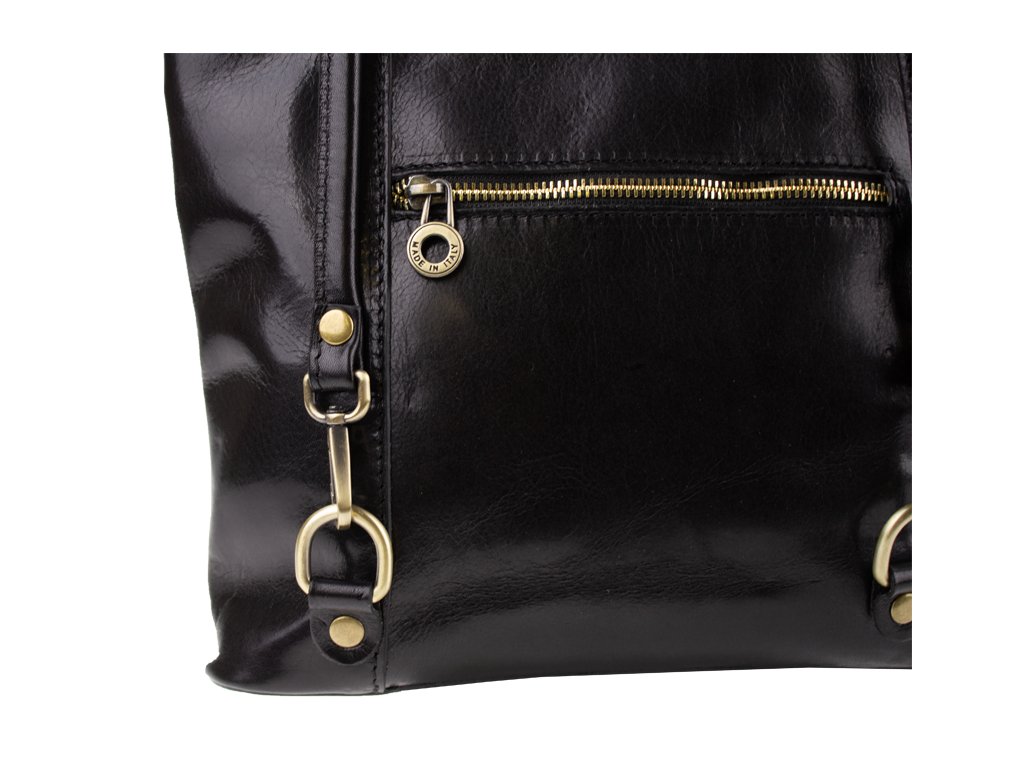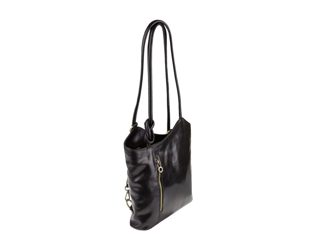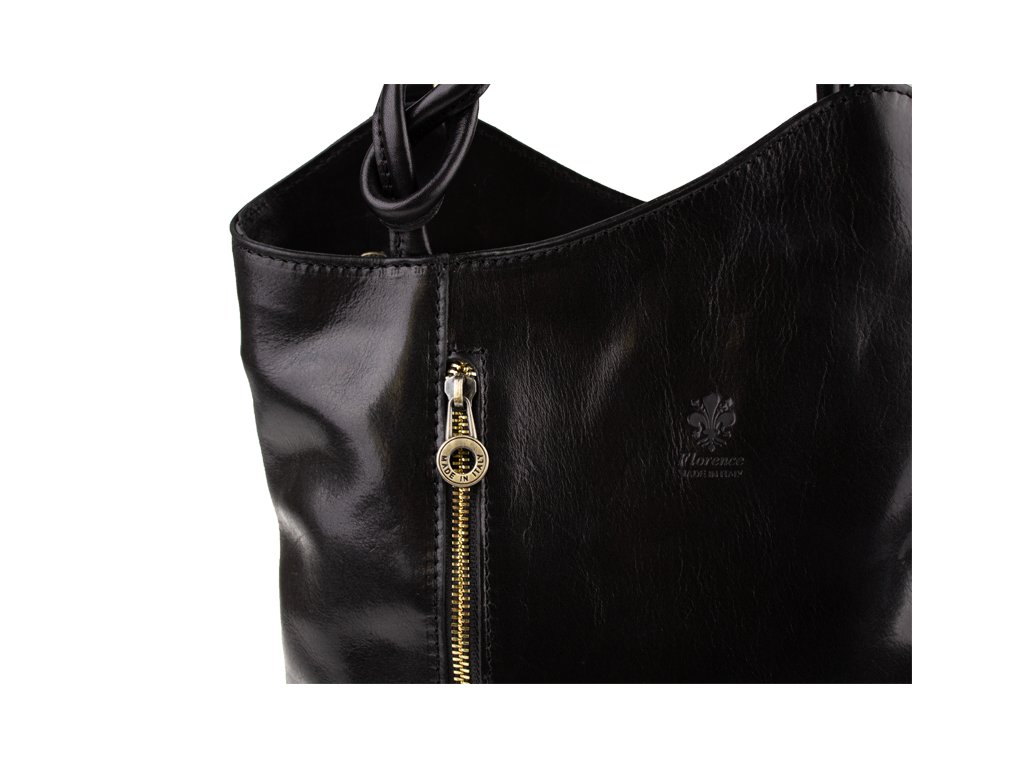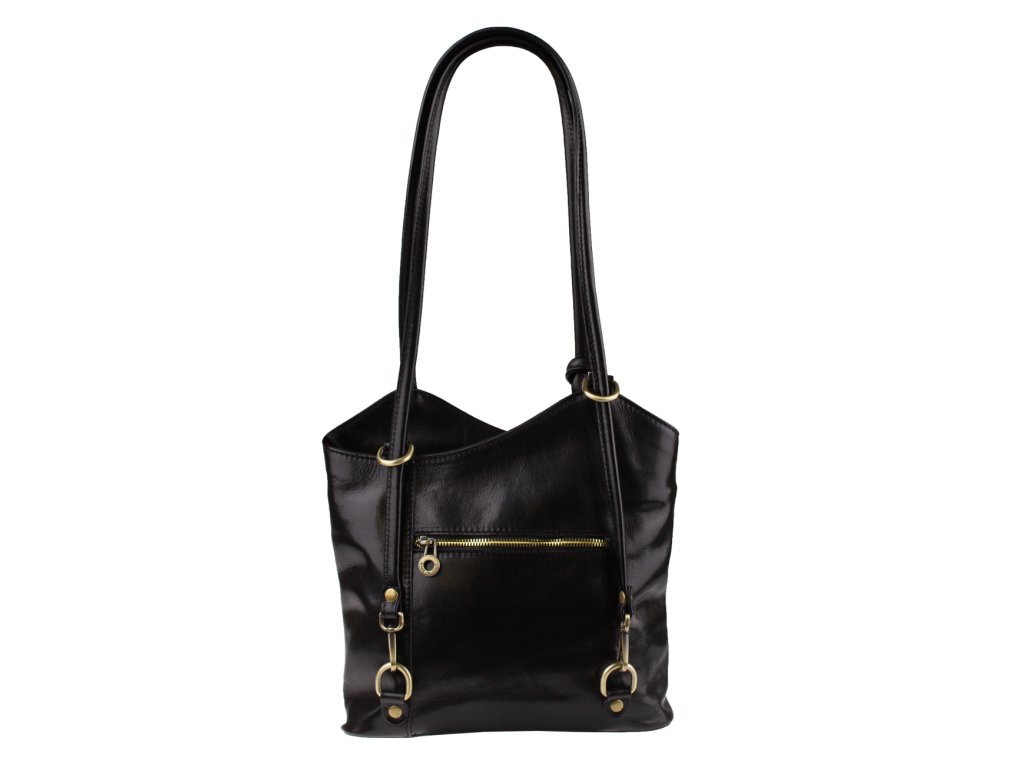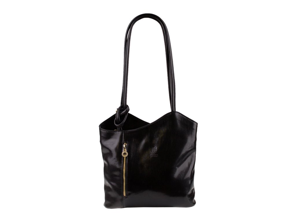 Krásná kožená kabelka v červené barvě. Výhodou této kabelky je, že ji lze nosit přes rameno, stejně tak jako batůžek. Je uzavíratelná na zip. Uvnitř má látkovou přepážku s kapsou, dále pak kapsičku na straně, obě také uzavíratelné na zip. Na druhé vnitřní straně jsou dvě otevřené kapsičky, například na telefon. Kabelka je vyrobena z hladké, pevné hovězí kůže. Hloubka dna je 8,5 cm.