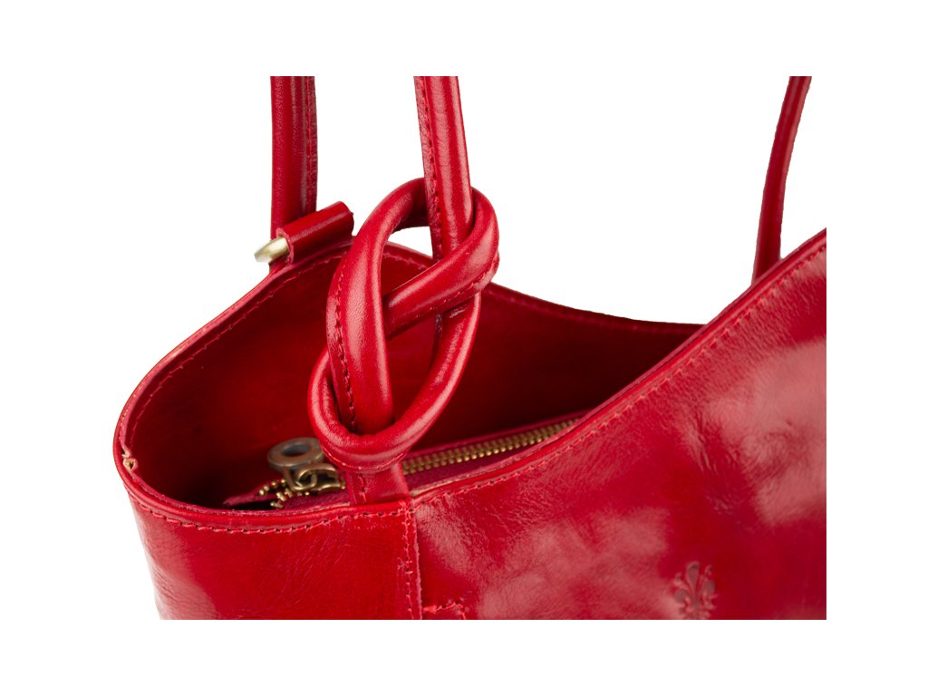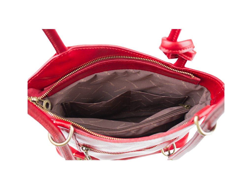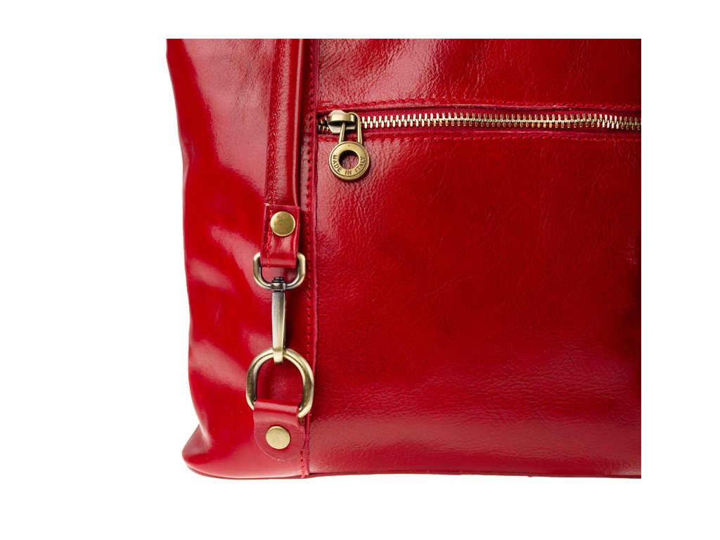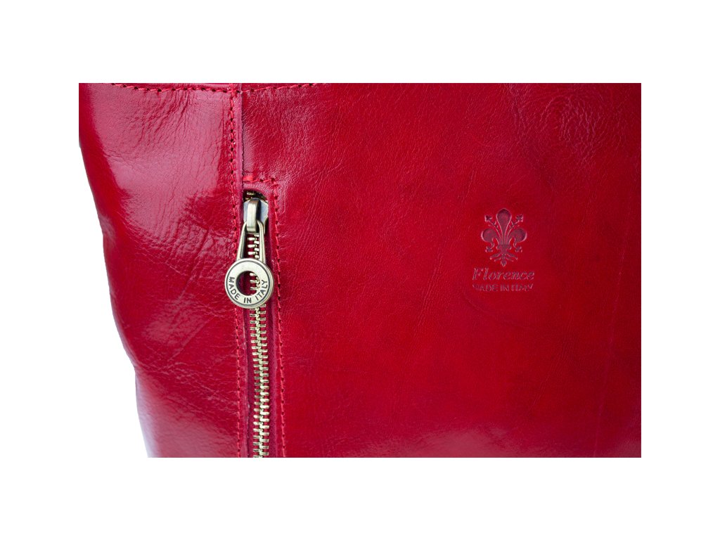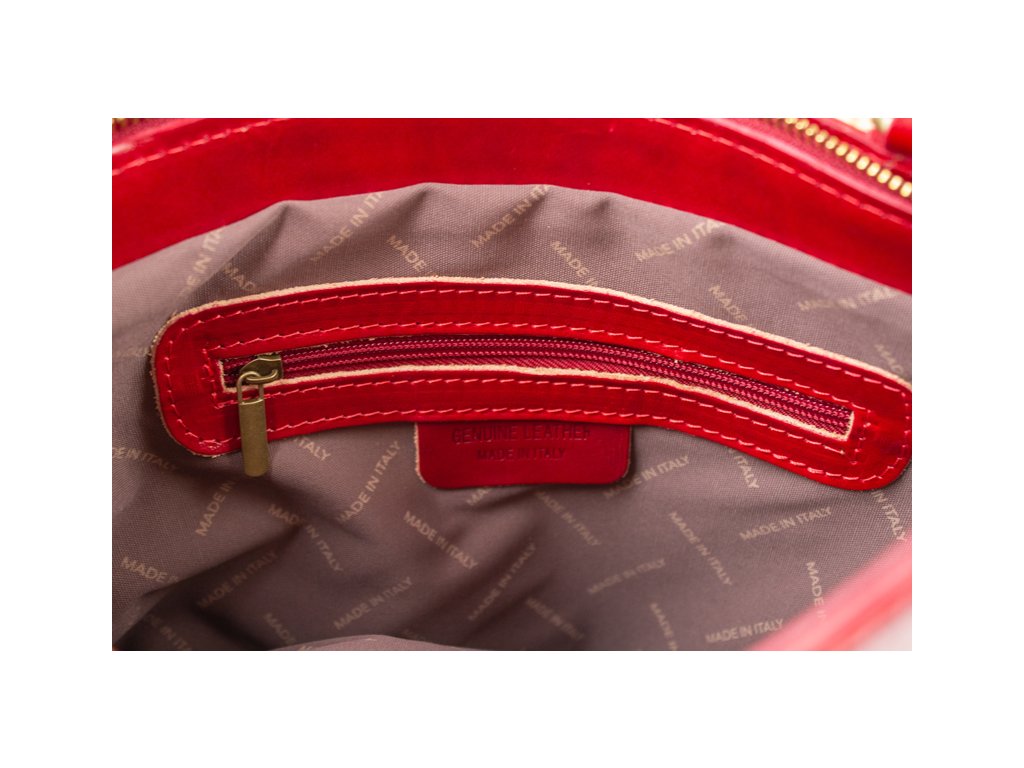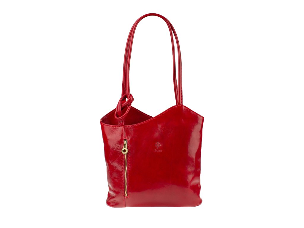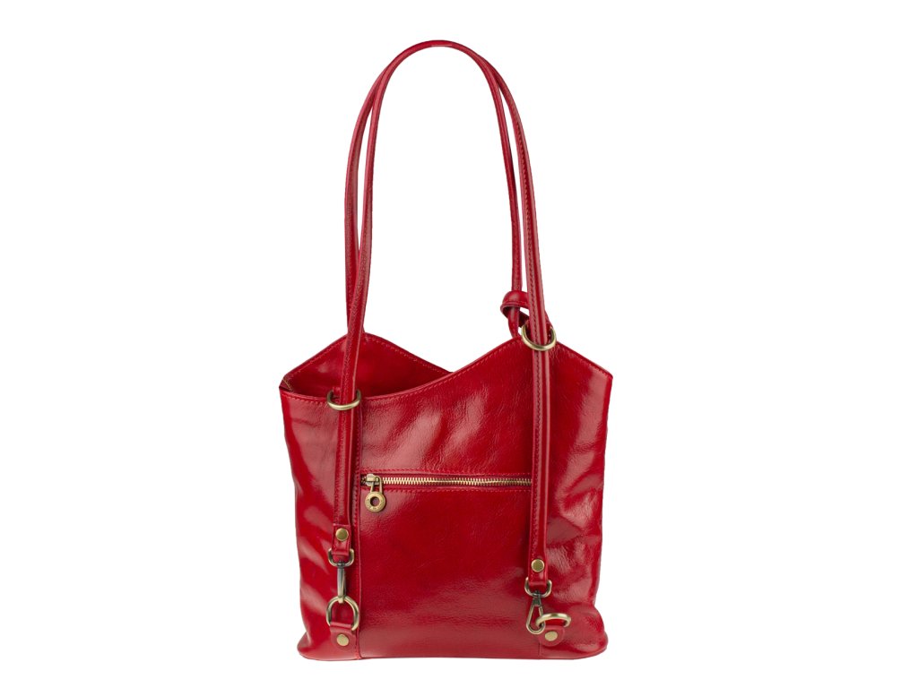 Krásná kožená kabelka v červené barvě. Výhodou této kabelky je, že ji lze nosit přes rameno, stejně tak jako batůžek. Je uzavíratelná na zip. Uvnitř má látkovou přepážku s kapsou, dále pak kapsičku na straně, obě také uzavíratelné na zip. Na druhé vnitřní straně jsou dvě otevřené kapsičky, například na telefon. Kabelka je vyrobena z hladké, pevné hovězí kůže. Hloubka dna je 8,5 cm.