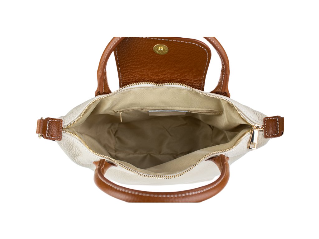 Praktická a prostorná kožená kabelka v hnědé barvě. Jednoduché provedení a velký prostor dělá tuto kabelku neobyčejně praktickou pro denní nošení. Vnitřek kabelky je vybaven kapsou na zip a dvěma malými přihrádkami.