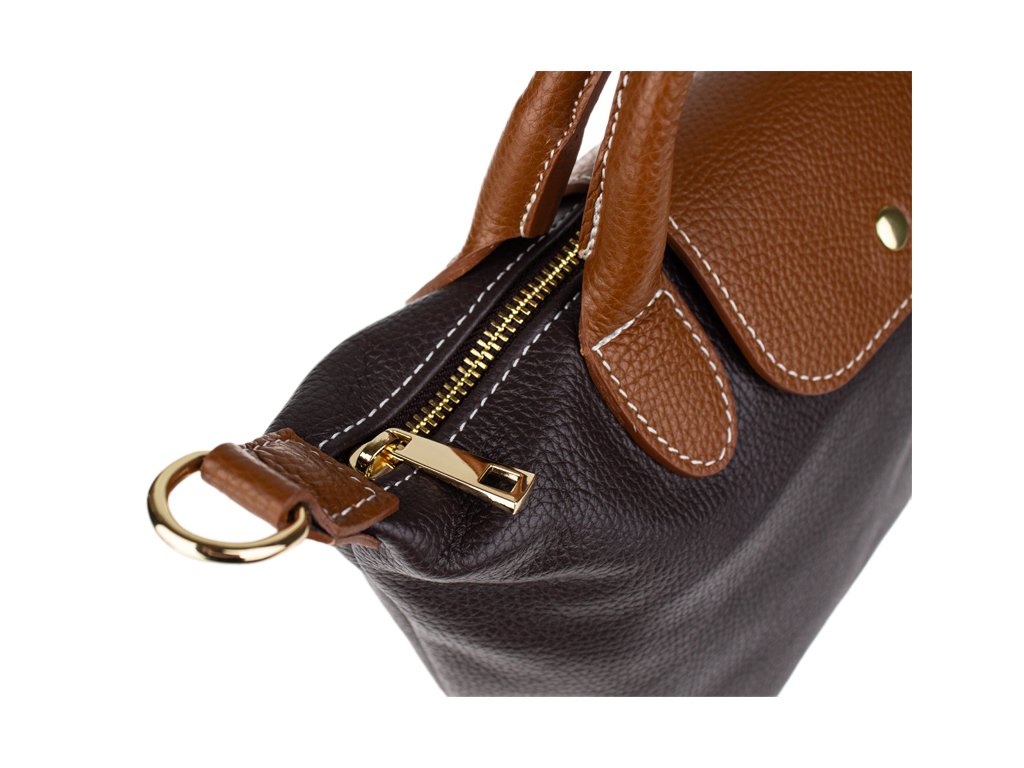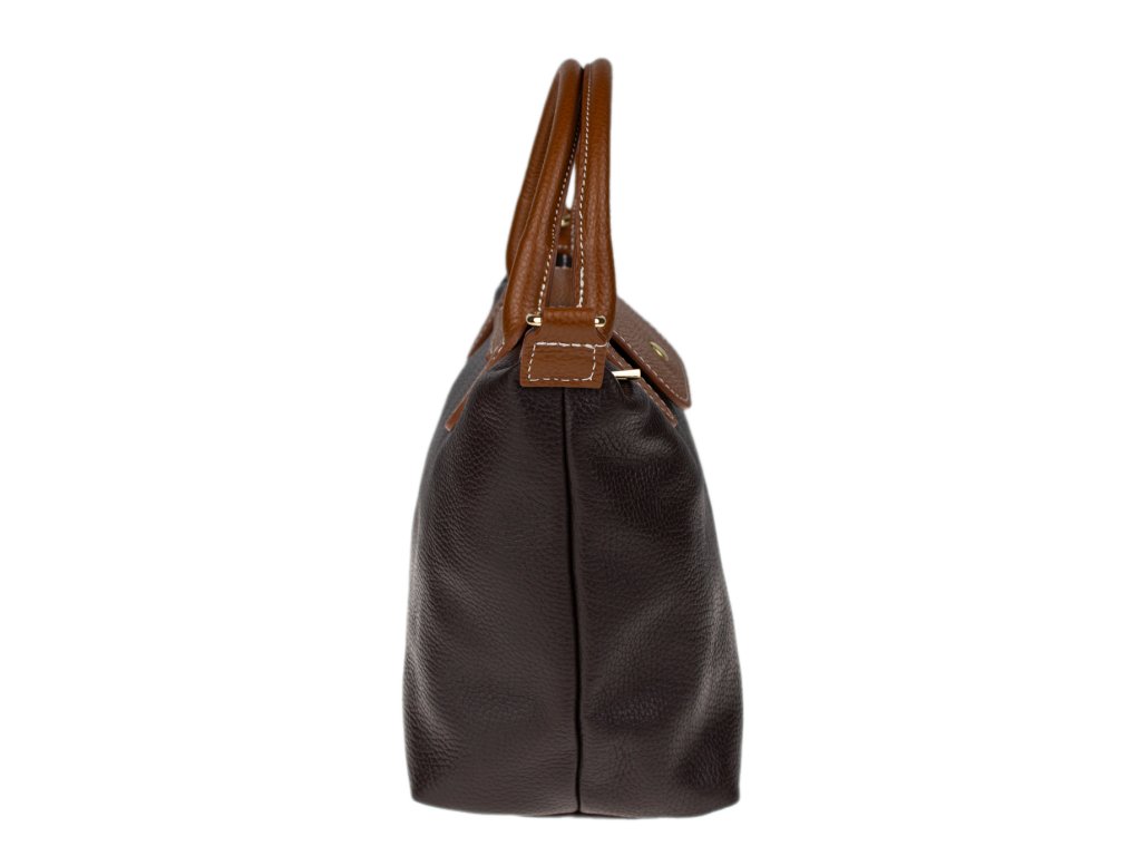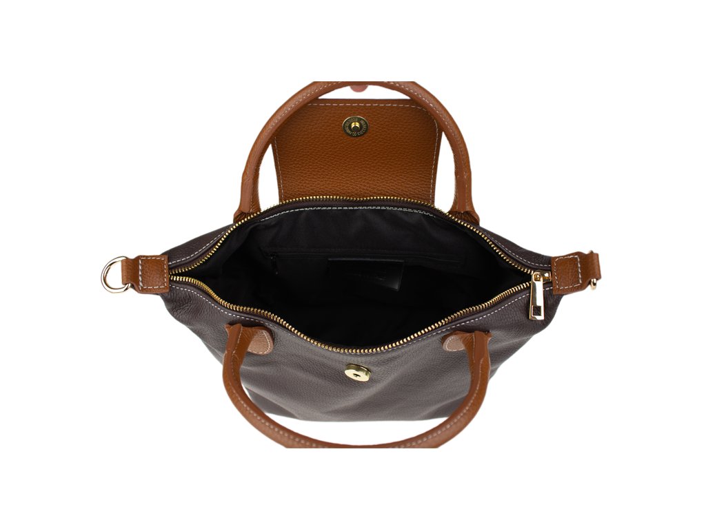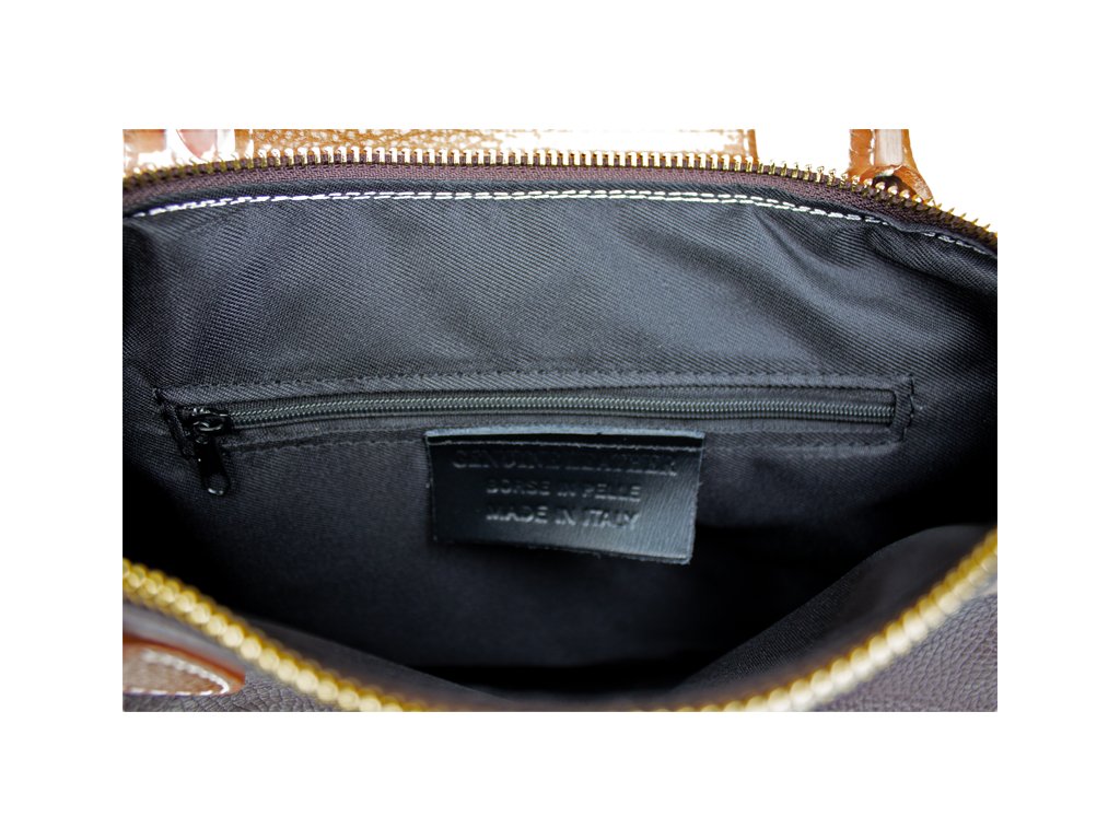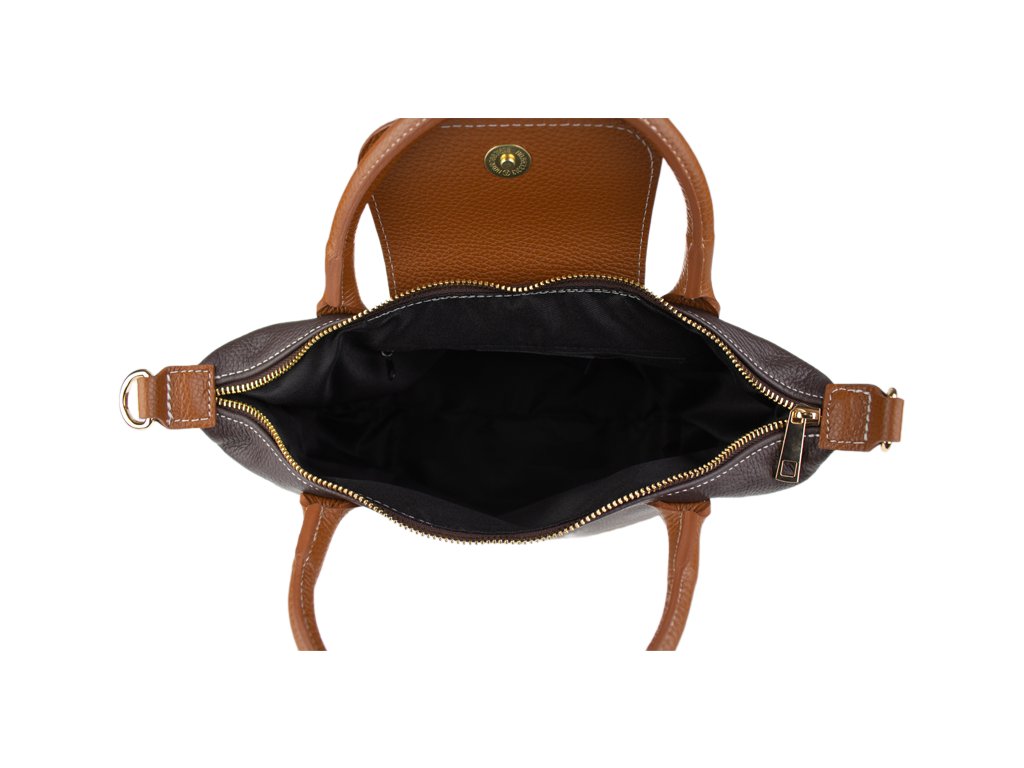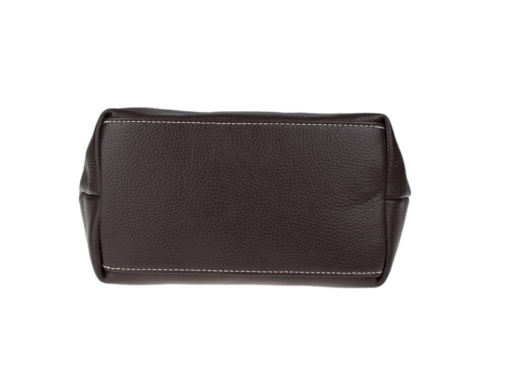 Praktická a prostorná kožená kabelka v hnědé barvě. Jednoduché provedení a velký prostor dělá tuto kabelku neobyčejně praktickou pro denní nošení. Vnitřek kabelky je vybaven kapsou na zip a dvěma malými přihrádkami.