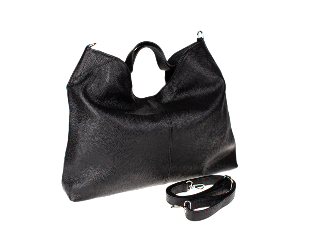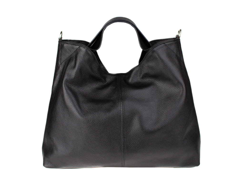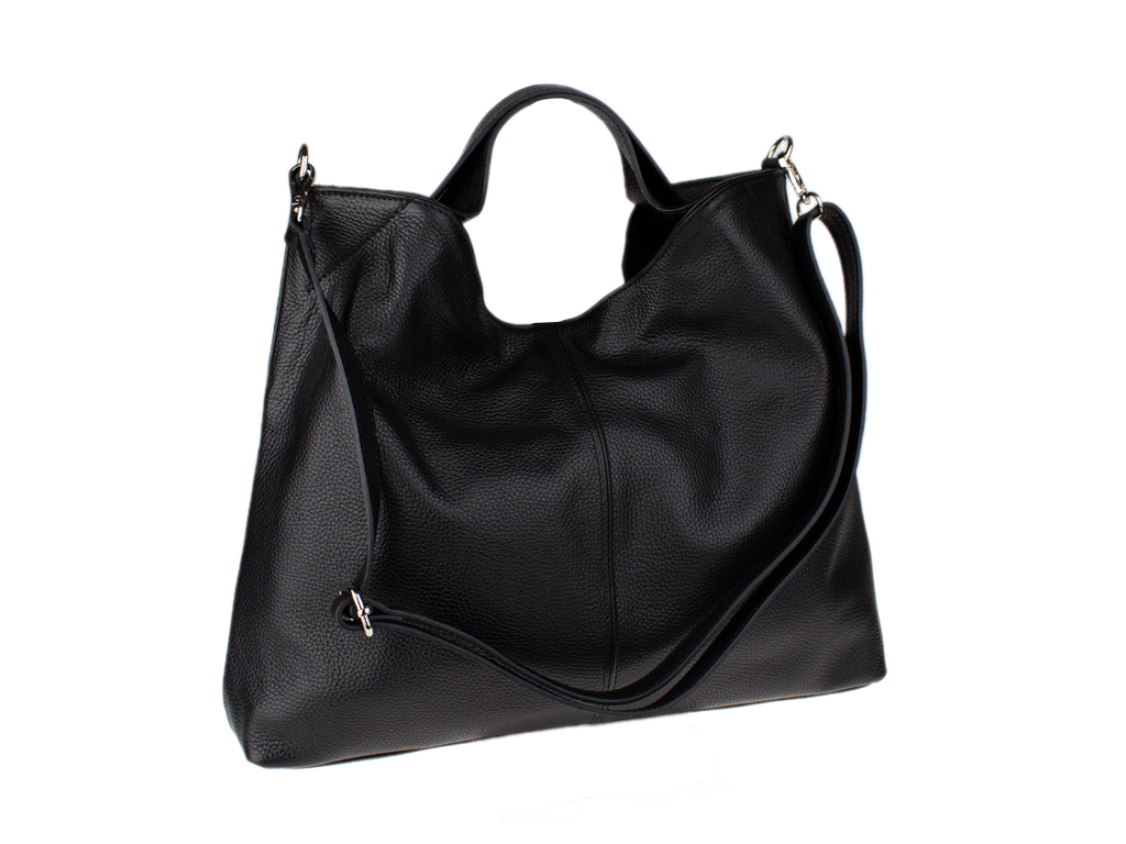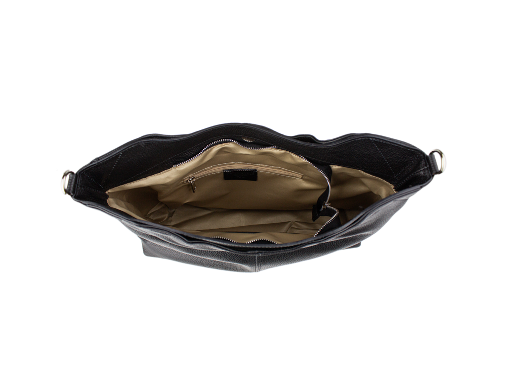 Krásná praktická kabelka vhodná i pro volný čas má nastavitelná ucha a je nositelná přes rameno; je vyrobena z kvalitní měkké kůže v černé barvě. Tato kožená kabelka je uzavíratelná na magnetický patentek. Uvnitř kabelky najdeme přepážku uprostřed, která zároveň slouží jako kapsa na zip a na bočních stěnách pak kapsu na zip a 2 malé kapsy. Hloubka její dna je 12 cm.