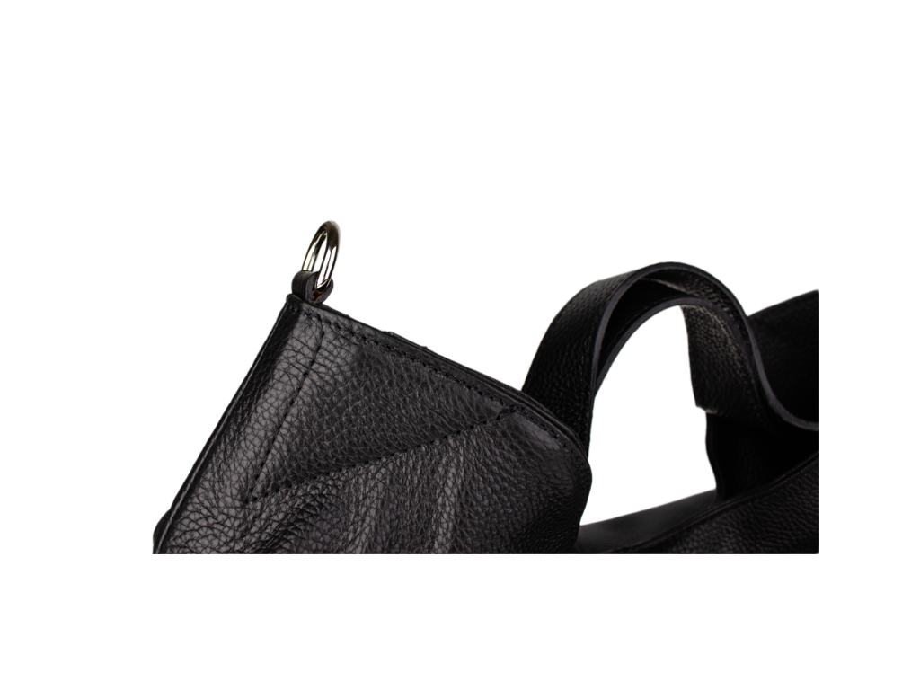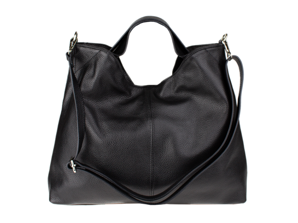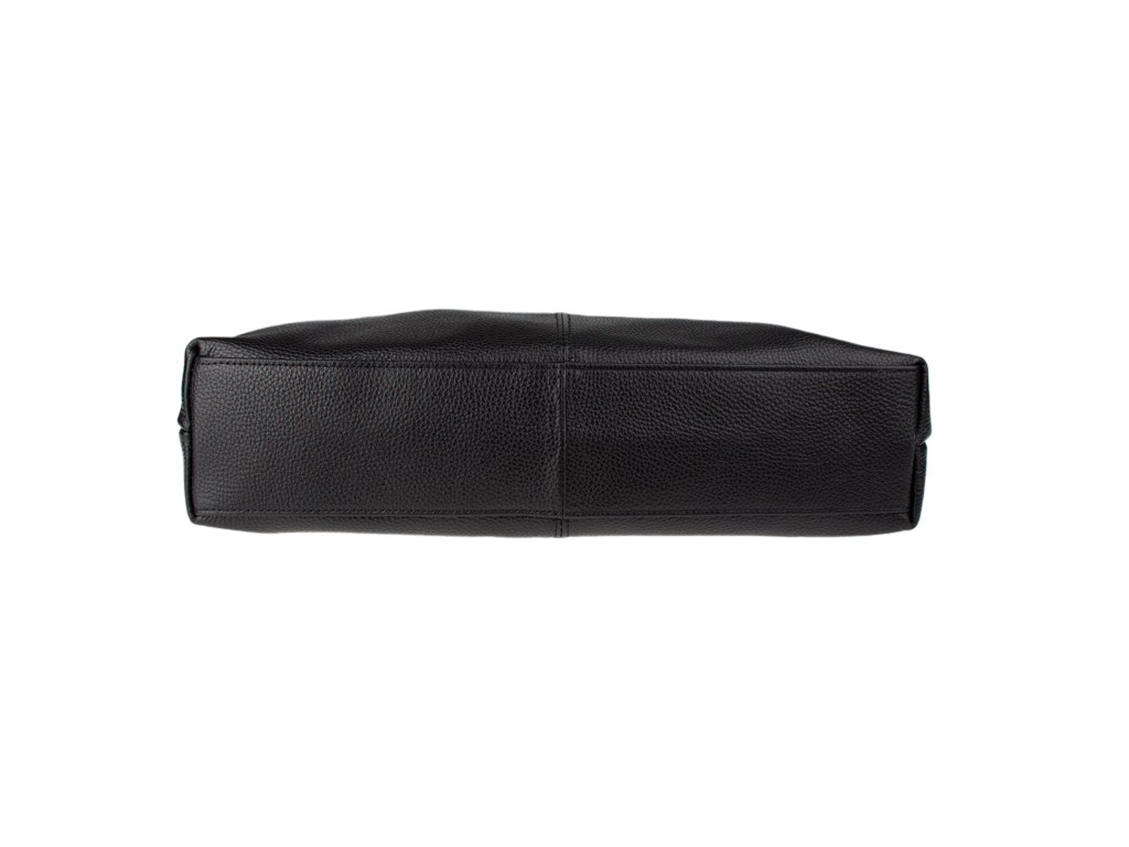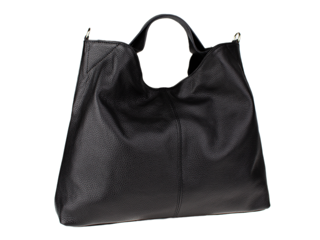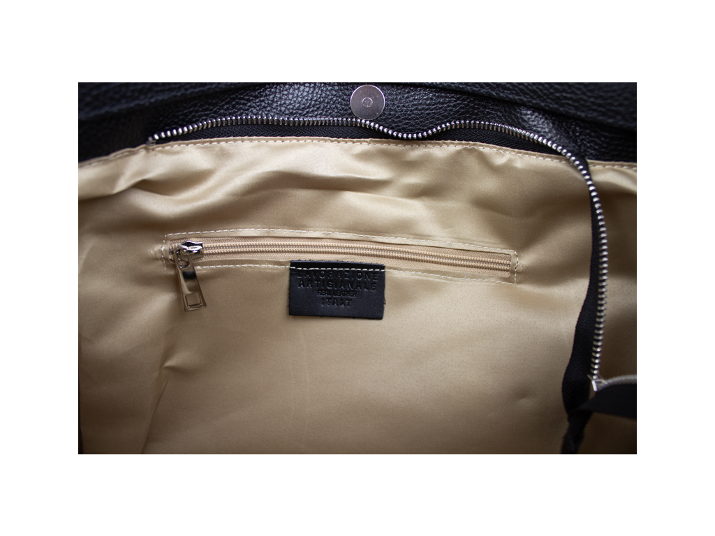 Krásná praktická kabelka vhodná i pro volný čas má nastavitelná ucha a je nositelná přes rameno; je vyrobena z kvalitní měkké kůže v černé barvě. Tato kožená kabelka je uzavíratelná na magnetický patentek. Uvnitř kabelky najdeme přepážku uprostřed, která zároveň slouží jako kapsa na zip a na bočních stěnách pak kapsu na zip a 2 malé kapsy. Hloubka její dna je 12 cm.