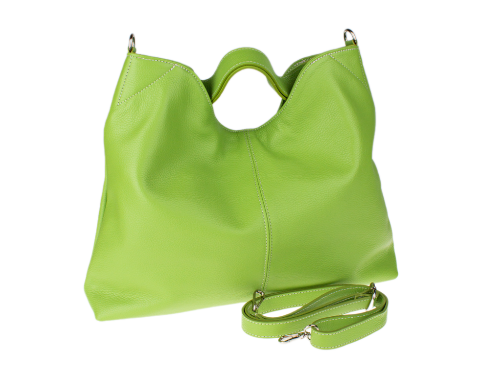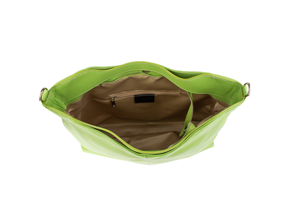 Krásná praktická kabelka vhodná i pro volný čas má nastavitelná ucha a je nositelná přes rameno; je vyrobena z kvalitní měkké kůže v černé barvě. Tato kožená kabelka je uzavíratelná na magnetický patentek. Uvnitř kabelky najdeme přepážku uprostřed, která zároveň slouží jako kapsa na zip a na bočních stěnách pak kapsu na zip a 2 malé kapsy. Hloubka její dna je 12 cm.