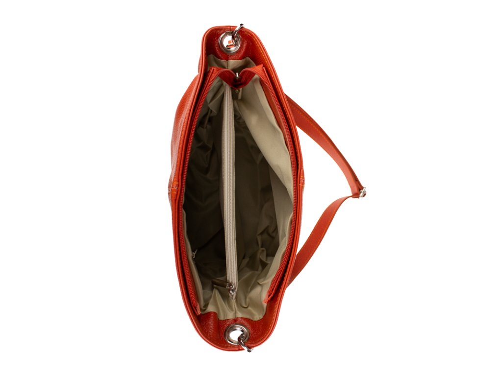 Šedá kabelka nositelná přes rameno či cross-body (křížem). Tato kožená kabelka je uzavíratelná na zip. Uvnitř kabelky najdeme přepážku uprostřed, která zároveň slouží jako kapsa na zip, a na boční stěně pak kapsu na zip. Hloubka jejího dna je 13 cm. Kabelka má navíc nastavitelný popruh s maximální délkou cca 120 cm.