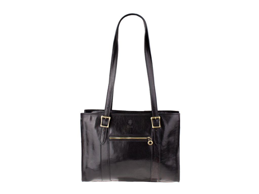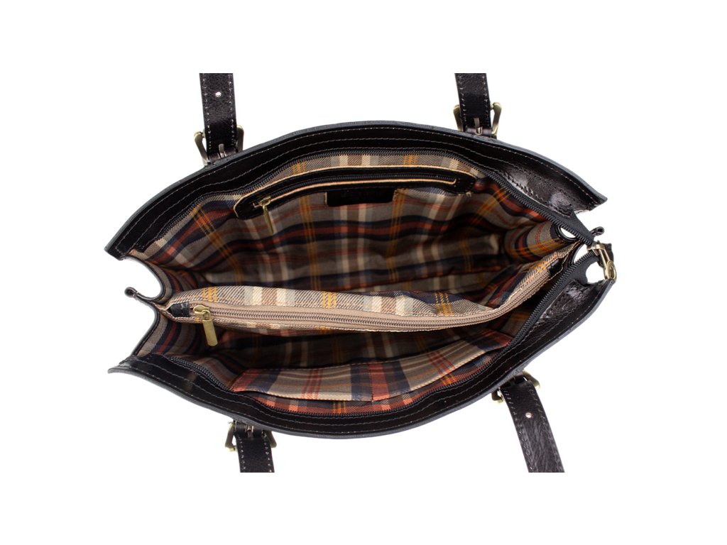 Klasická kožená kabelka v černé barvě. Tato prostorná kabelka je uvnitř rozdělena přepážkou uzavíratelnou na zip. Kabelka je vhodná pro nošení přes rameno nebo v ruce.
