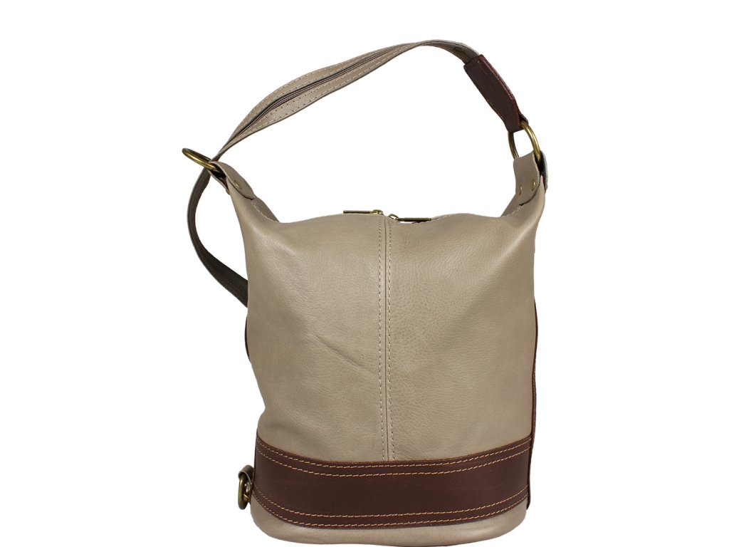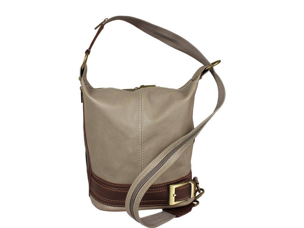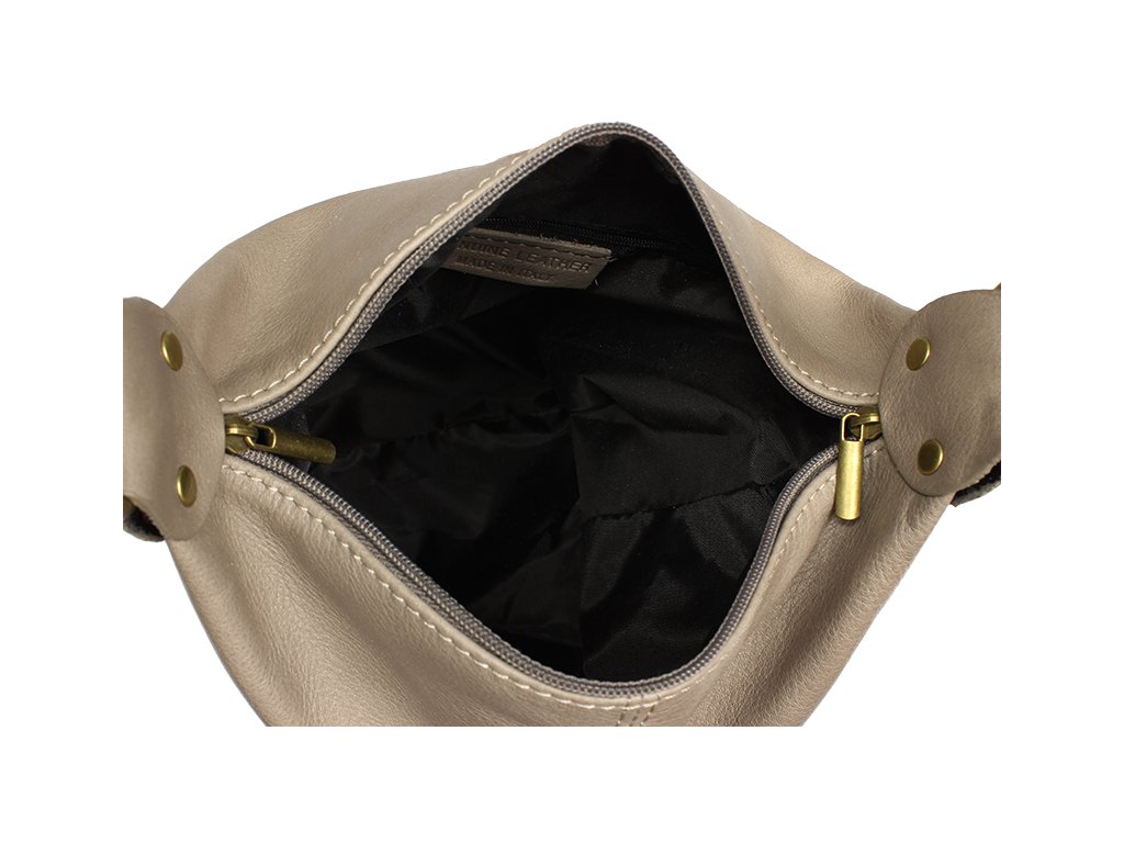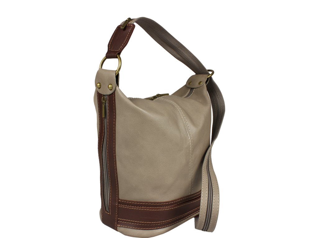 Velmi oblíbená praktická kabelka šedivé barvy s nekonvenčním designem, kterému dodává "šmrnc" ozdobný pásek po jejím obvodu v dolní části. Kabelka je uzavíratelná na zip a je vyrobena z pravé kůže. Díky celkem 3 polohám jejího pásku je ji možné nosit za ramenem, přes rameno a dokonce i jako batůžek, jelikož její velké ucho disponující zipem je rozpínací. Kabelka má k tomu všemu navíc kapsu na zip na vnější zadní straně. Spodek kabelky, můžete vidět zde na odkazu. Délka popruhu je 96 cm.