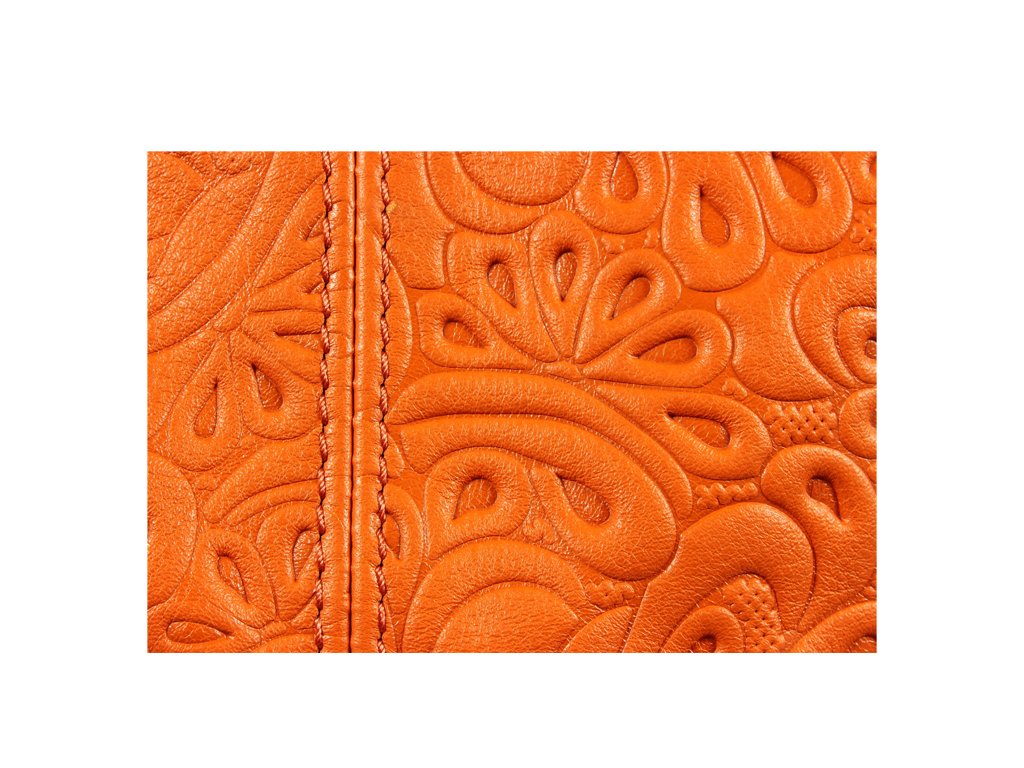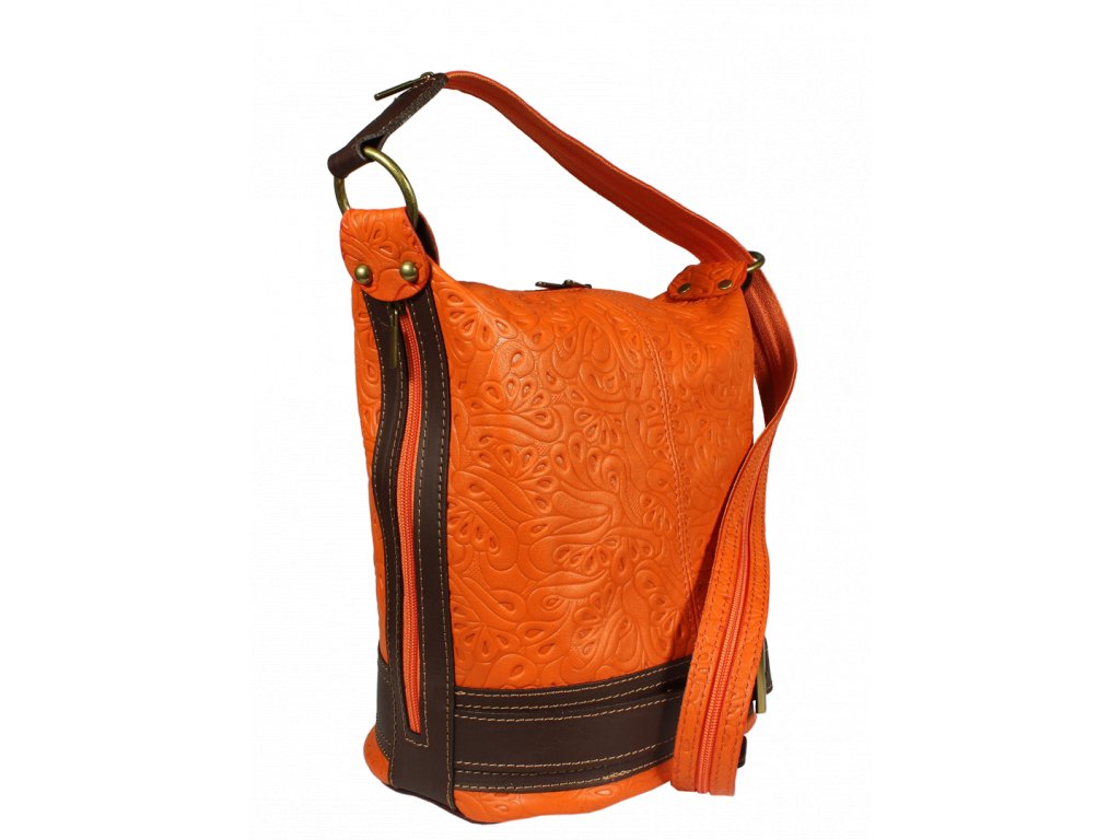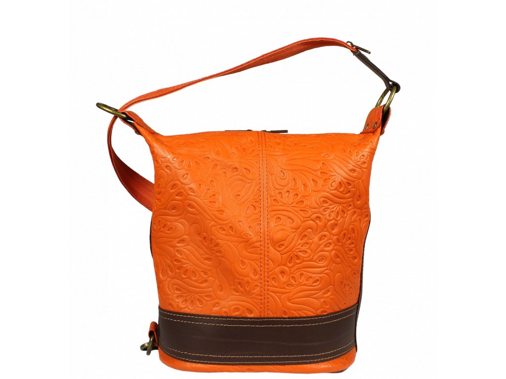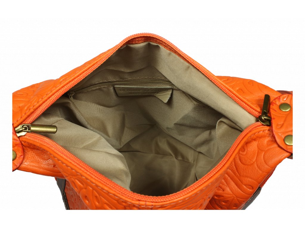 Velmi oblíbená praktická oranžová kabelka s nekonvenčním designem, kterému dodává "šmrnc" ozdobný pásek po jejím obvodu v dolní části. Kabelka je uzavíratelná na zip a je vyrobena z pravé kůže se vzorem květin. Díky celkem 3 polohám jejího pásku je ji možné nosit za ramenem, přes rameno a dokonce i jako batůžek, jelikož její velké ucho disponující zipem je rozpínací. Kabelka má k tomu všemu navíc kapsu na zip na vnější zadní straně. Spodek kabelky, můžete vidět zde na odkazu.