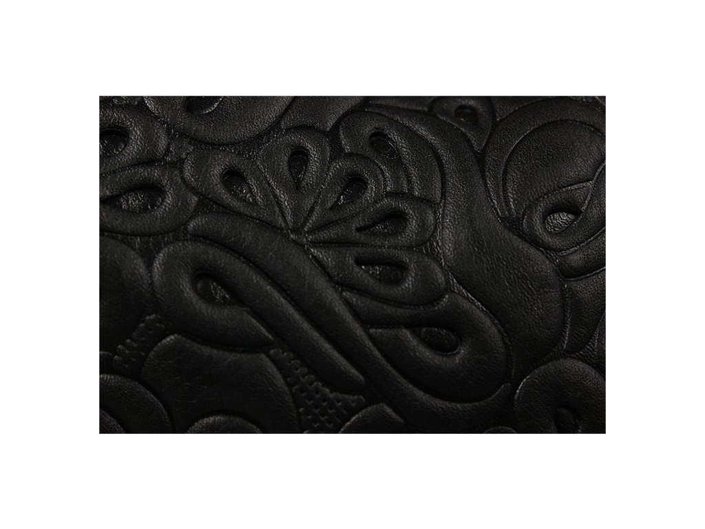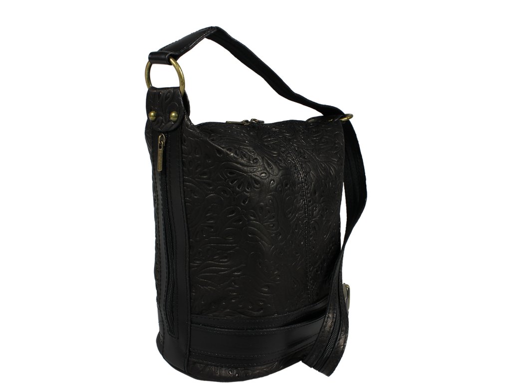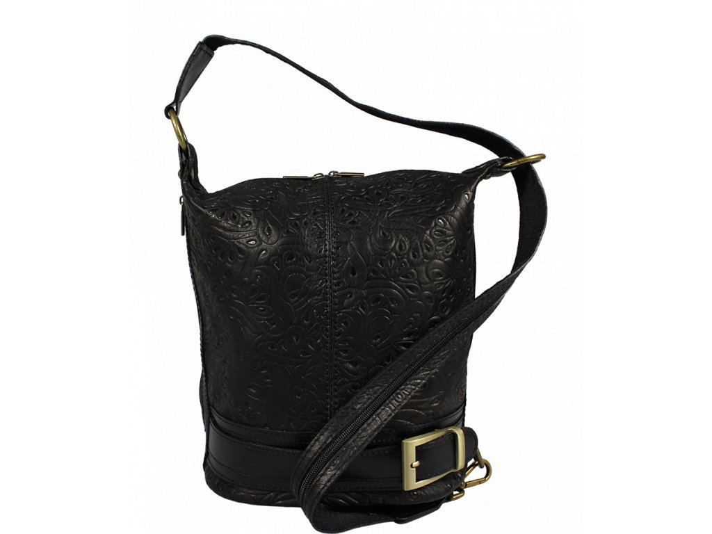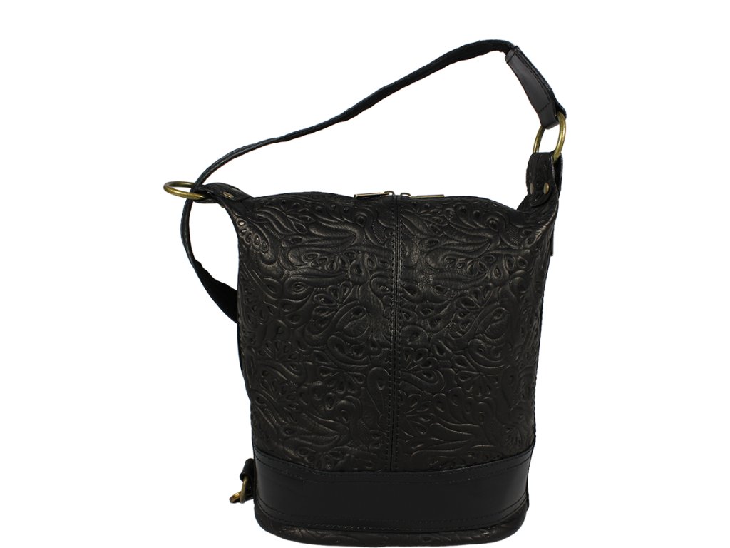 Velmi oblíbená praktická kabelka v černé barvě s nekonvenčním designem, kterému dodává "šmrnc" ozdobný pásek po jejím obvodu v dolní části. Kabelka je uzavíratelná na zip a je vyrobena z pravé kůže se vzorem květin. Díky celkem 3 polohám jejího pásku je ji možné nosit za ramenem, přes rameno a dokonce i jako batůžek, jelikož její velké ucho disponující zipem je rozpínací. Kabelka má k tomu všemu navíc kapsu na zip na vnější zadní straně. Spodek kabelky, můžete vidět zde na odkazu. Délka popruhu je 96 cm.