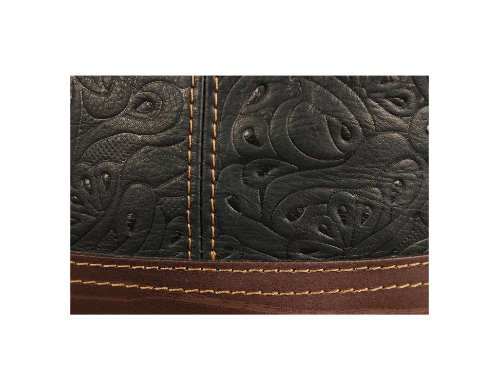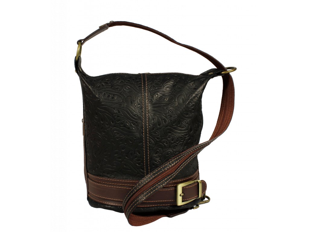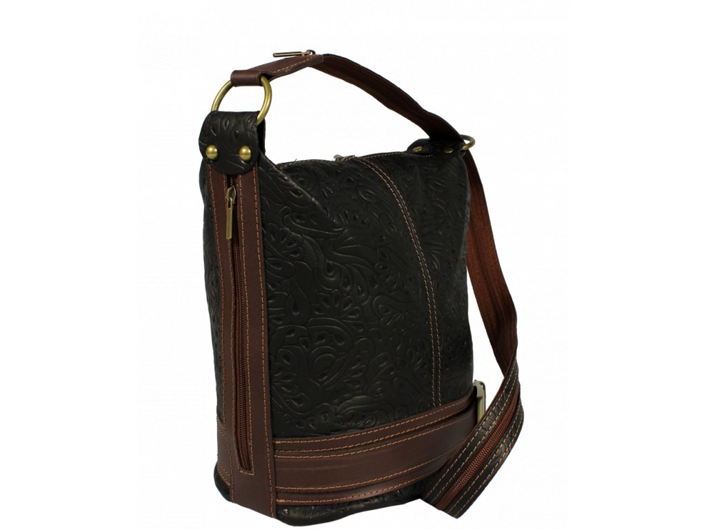 Velmi oblíbená praktická kabelka v černé barvě s nekonvenčním designem, kterému dodává "šmrnc" ozdobný pásek po jejím obvodu v dolní části. Kabelka je uzavíratelná na zip a je vyrobena z pravé kůže se vzorem květin. Díky celkem 3 polohám jejího pásku je ji možné nosit za ramenem, přes rameno a dokonce i jako batůžek, jelikož její velké ucho disponující zipem je rozpínací. Kabelka má k tomu všemu navíc kapsu na zip na vnější zadní straně. Spodek kabelky, můžete vidět zde na odkazu.