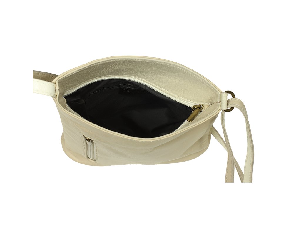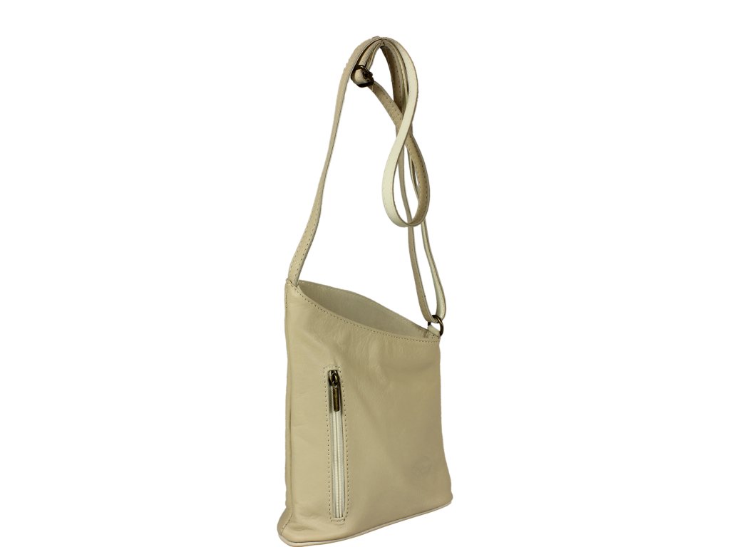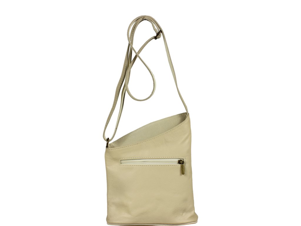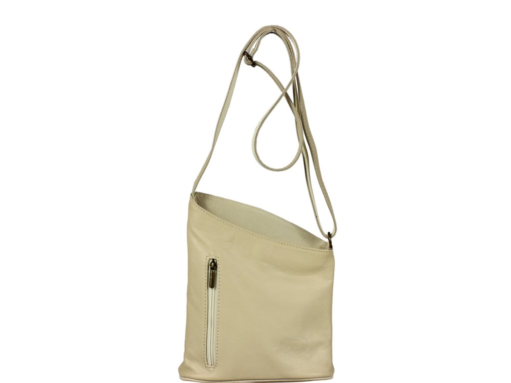Malá a velmi praktická kabelka pro každodenní nošení, která Vás osloví zejména svou jednoduchostí a zajímavým tvarem. Je vyrobena z pravé hladké kůže ve světle béžové barvě a uzavírá se pomocí zipu. Díky nastavitelnému popruhu je možné kabelku nosit přes rameno nebo cross-body (křížem). Z vnější strany nabízí dvě kapsy na zip. Kapsa na přední straně se uzavírá vertikálně a na zadní straně horizontálně. Uvnitř kabelka disponuje ještě jednou malou kapsou na zip, vhodným například pro Váš mobil nebo klíče. Délka popruhu je max. cca 110 cm.