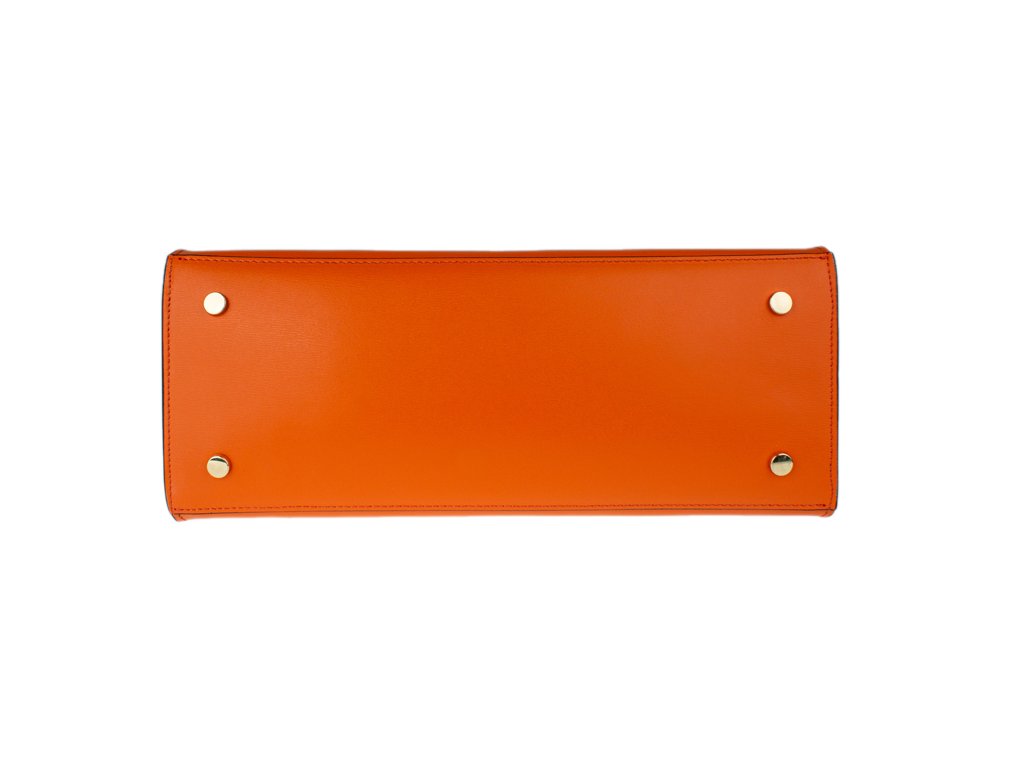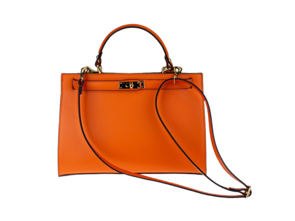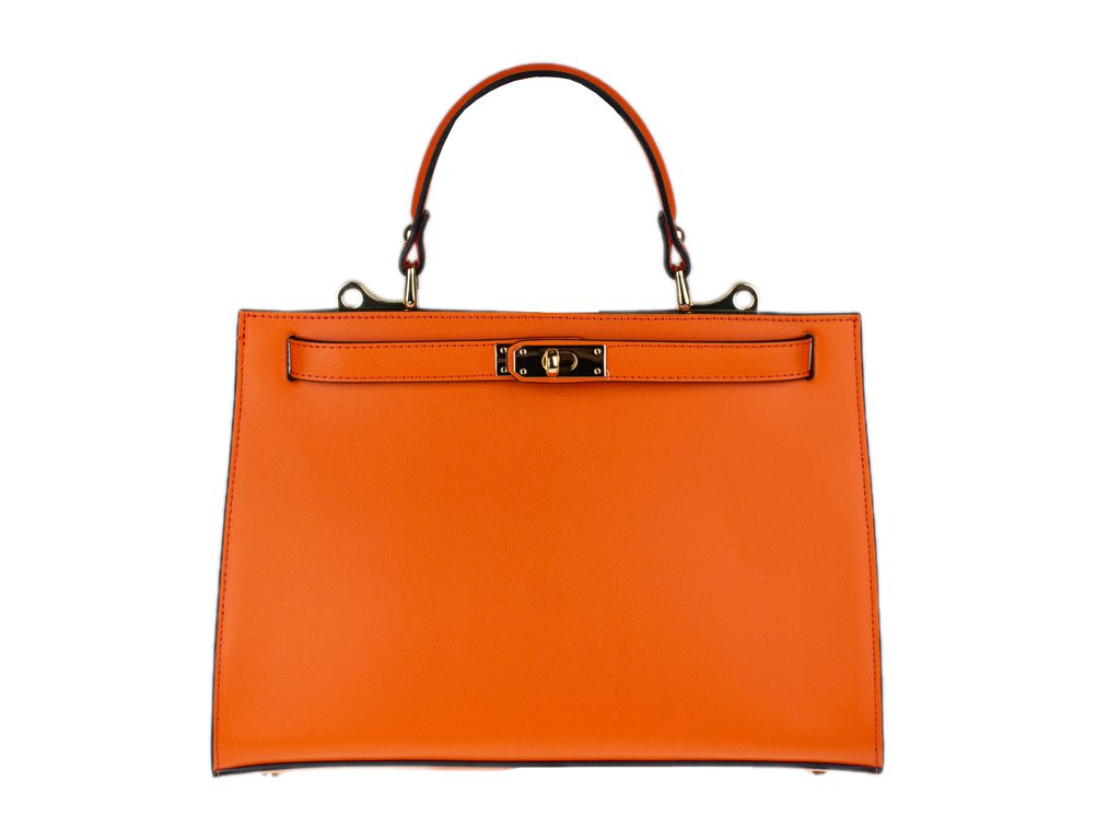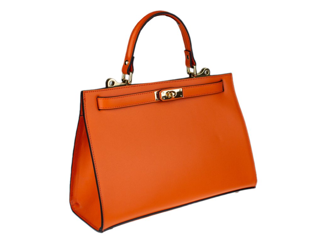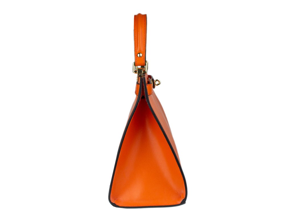 Krásná kabelka z pevné kůže v oranžové barvě. Kabelku lze nosit v ruce nebo přes rameno. Max. délka přídavného pásku je 115 cm. Kabelka je vybavena důmyslným a elegantním zapínáním. Uvnitř kabelky nalezneme kapsu na mobil či klíče.