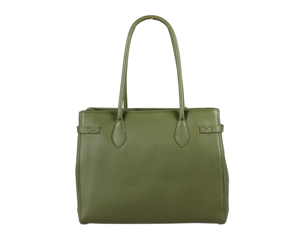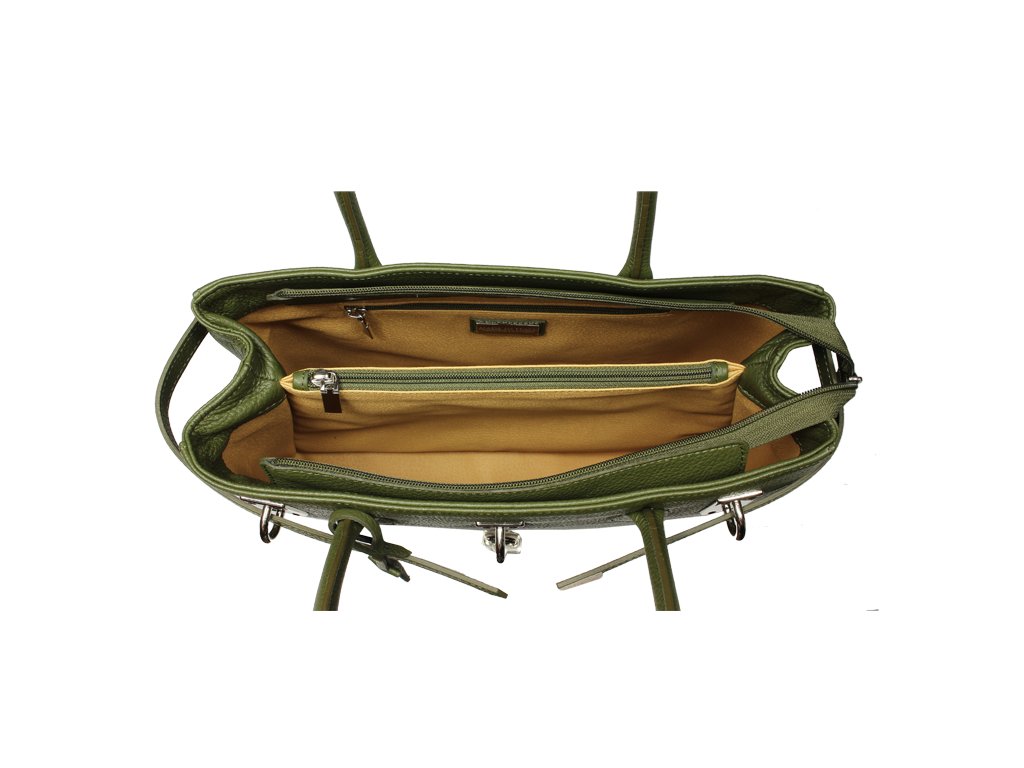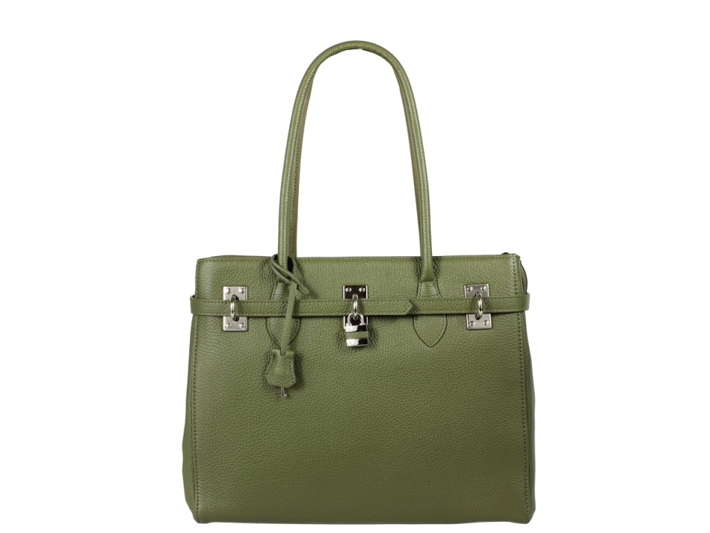 Velká kabelka nositelná přes rameno propracovaného designu s dekoračním zámečkem. Tato zelená kožená kabelka je uzavíratelná na zip. Vyrobena z pravé poctivé kůže. Uvnitř disponuje kapsou na zip a 2 malými kapsami vhodnými např. pro Váš mobil a peněženku. Hloubka jejího dna činí 10,5 cm.