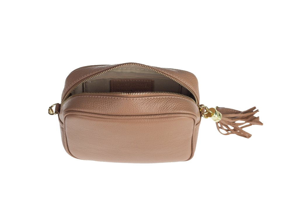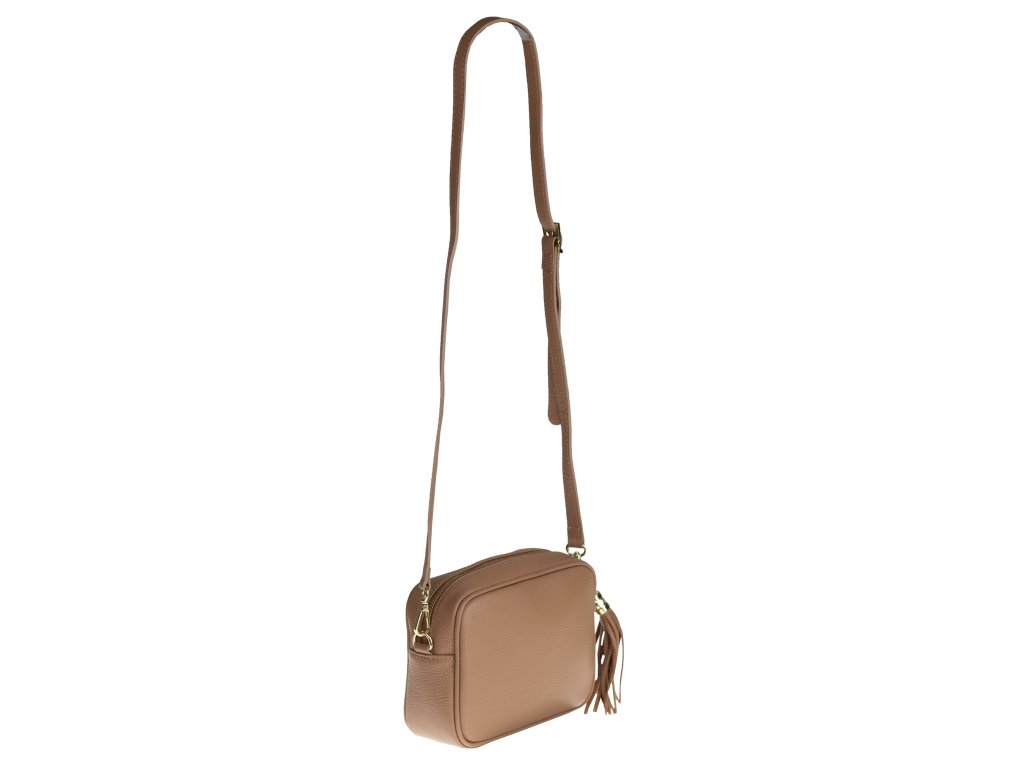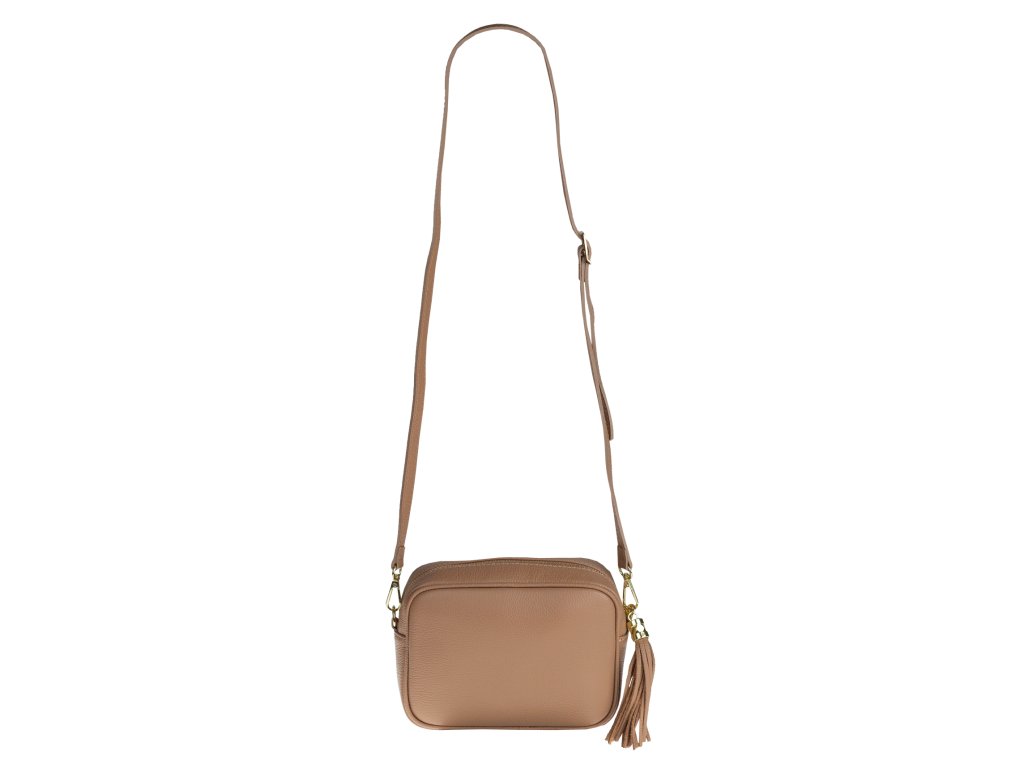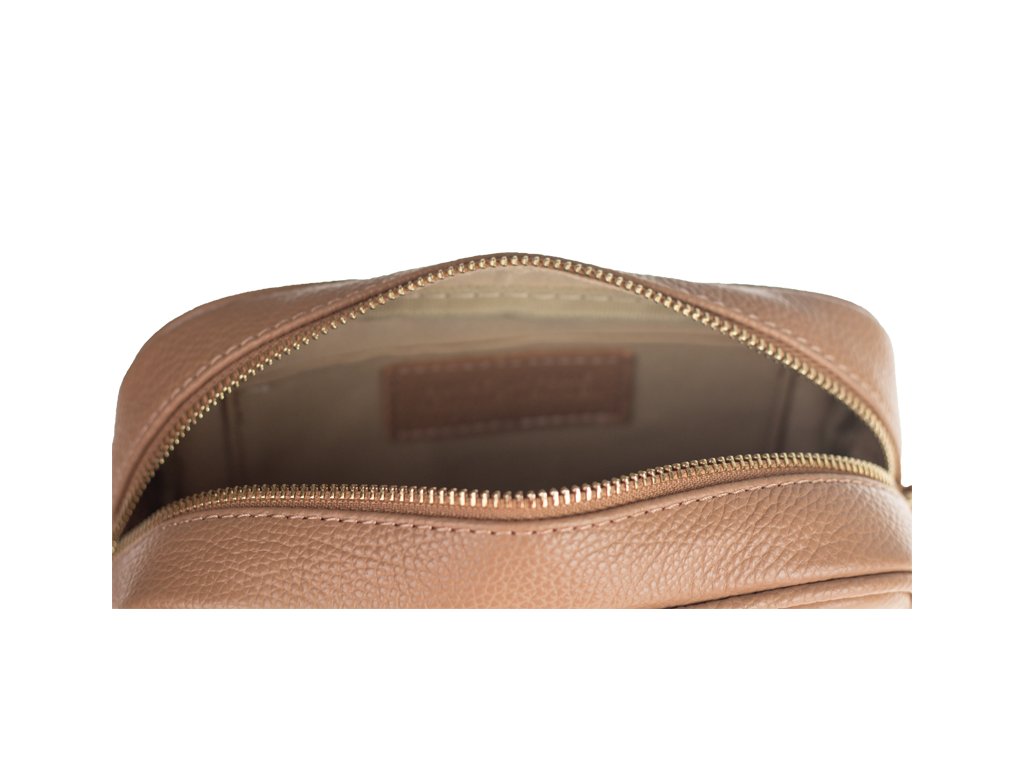 Malá praktická kožená kabelka, kterou lze nosit přes rameno nebo cross-body (křížem). Kabelka se uzavírá pomocí zipu a uvnitř najdeme přihrádku pro vše potřebné.