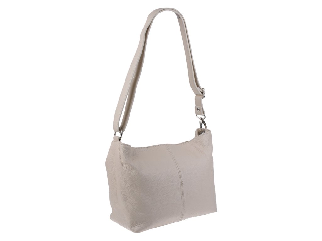 Béžová kabelka nositelná přes rameno či cross-body (křížem). Tato kožená kabelka je uzavíratelná na zip. Uvnitř kabelky najdeme přepážku uprostřed, která zároveň slouží jako kapsa na zip, a na boční stěně pak kapsu na zip. Hloubka jejího dna je 13 cm.