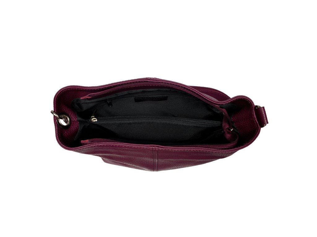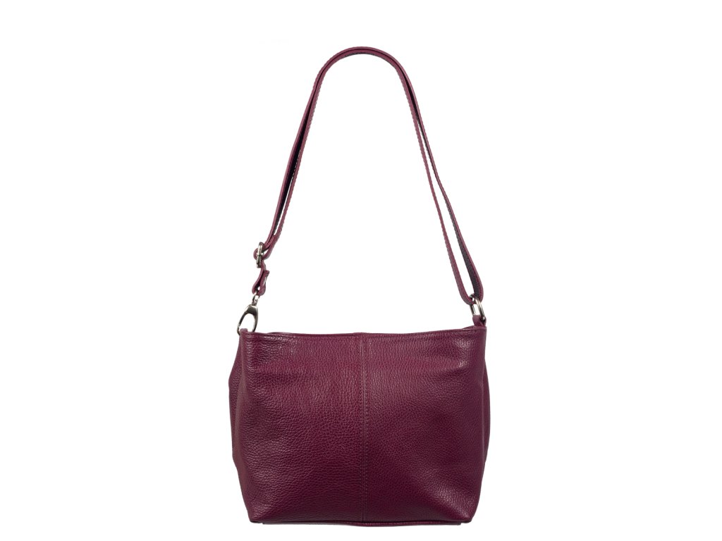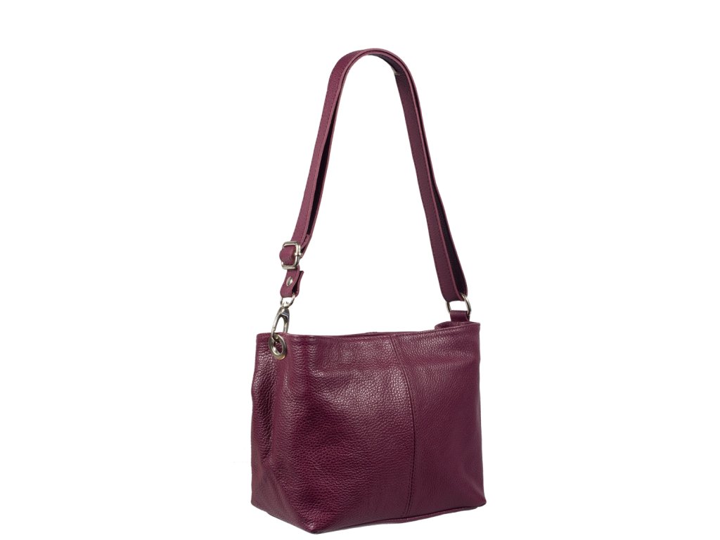 Vínová kabelka nositelná přes rameno či cross-body (křížem). Tato kožená kabelka je uzavíratelná na zip. Uvnitř kabelky najdeme přepážku uprostřed, která zároveň slouží jako kapsa na zip, a na boční stěně pak kapsu na zip. Hloubka jejího dna je 13 cm. Kabelka má navíc nastavitelný popruh s maximální délkou cca 120 cm.
