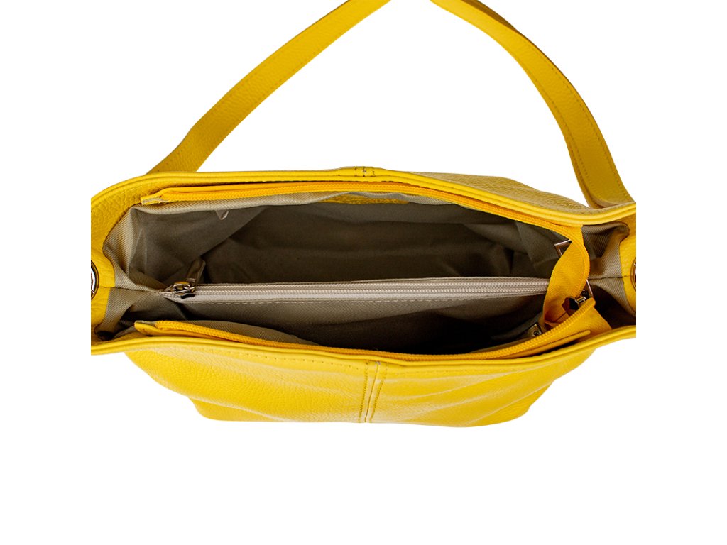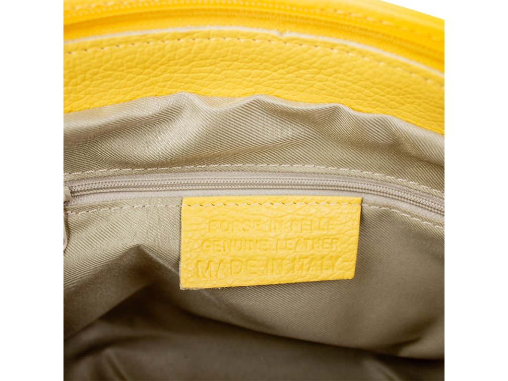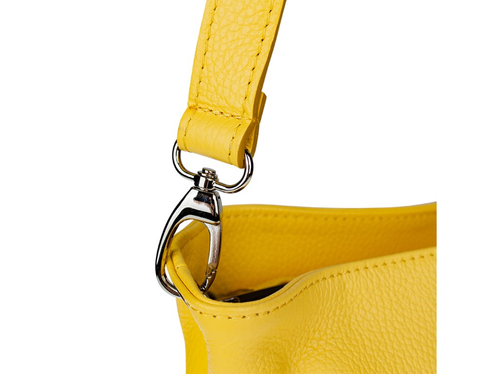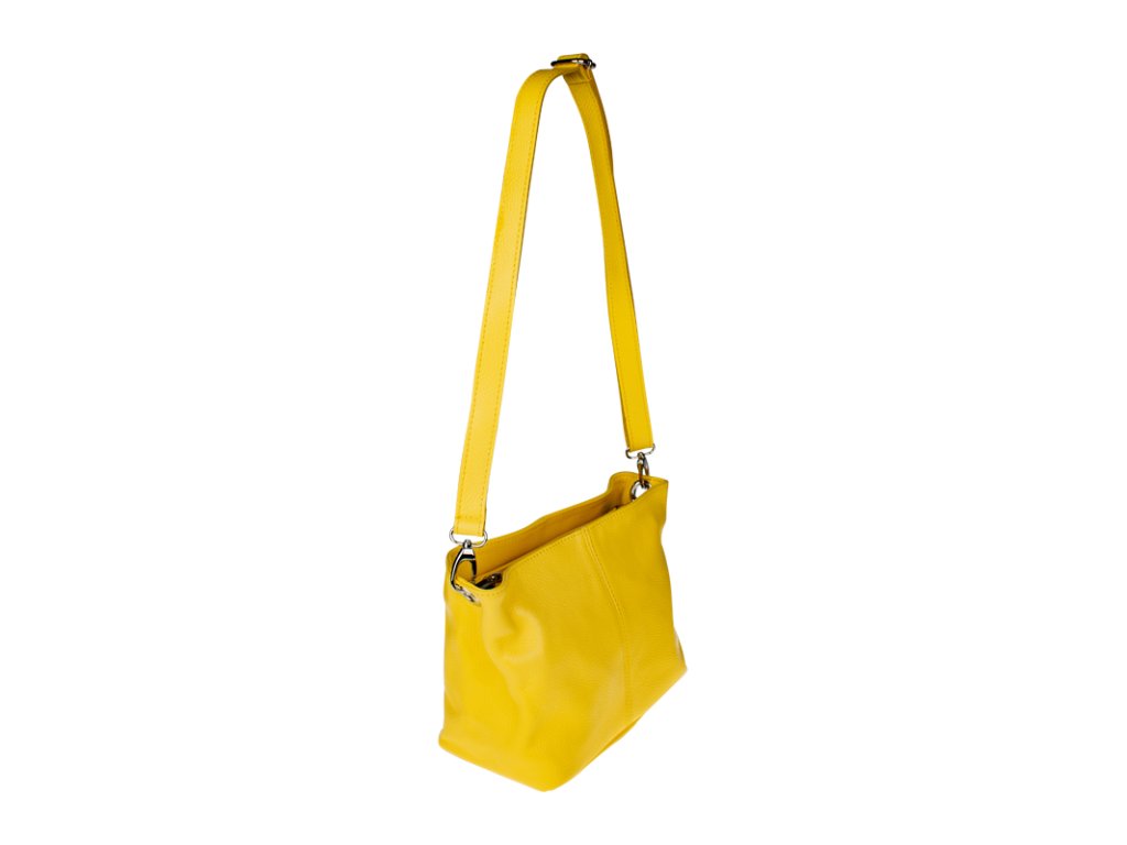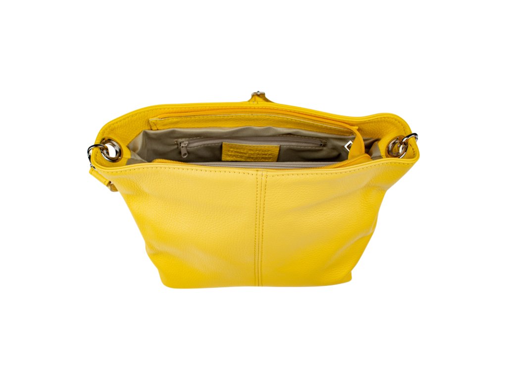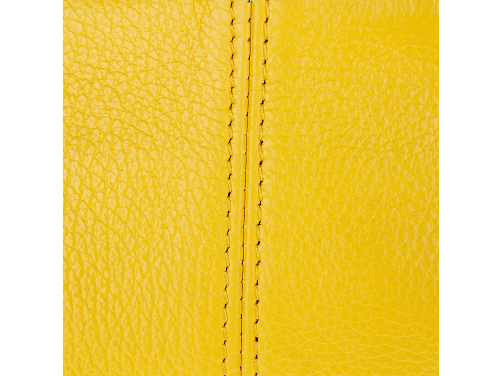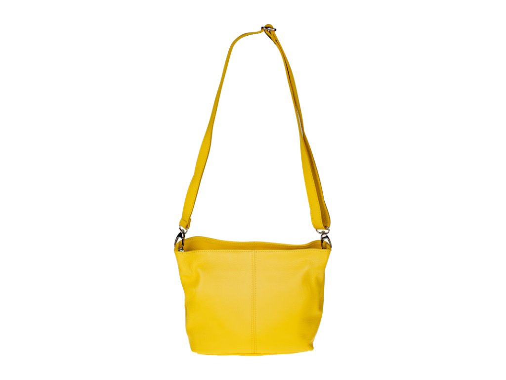 Kanárkově žlutá kabelka nositelná přes rameno či cross-body (křížem). Tato kožená kabelka je uzavíratelná na zip. Uvnitř kabelky najdeme přepážku uprostřed, která zároveň slouží jako kapsa na zip, a na boční stěně pak kapsu na zip. Hloubka jejího dna je 13 cm. Kabelka má navíc nastavitelný popruh s maximální délkou cca 120 cm.