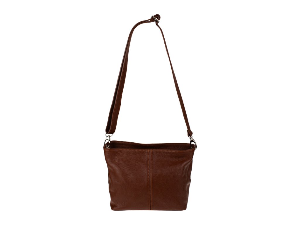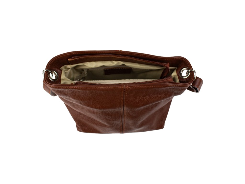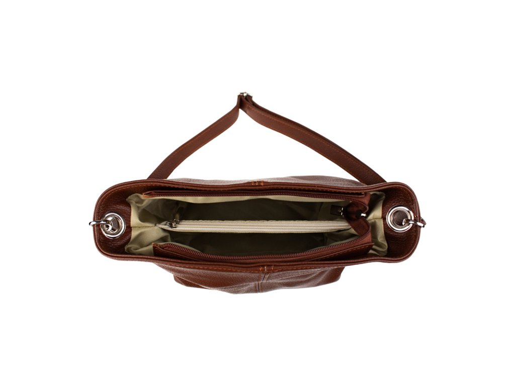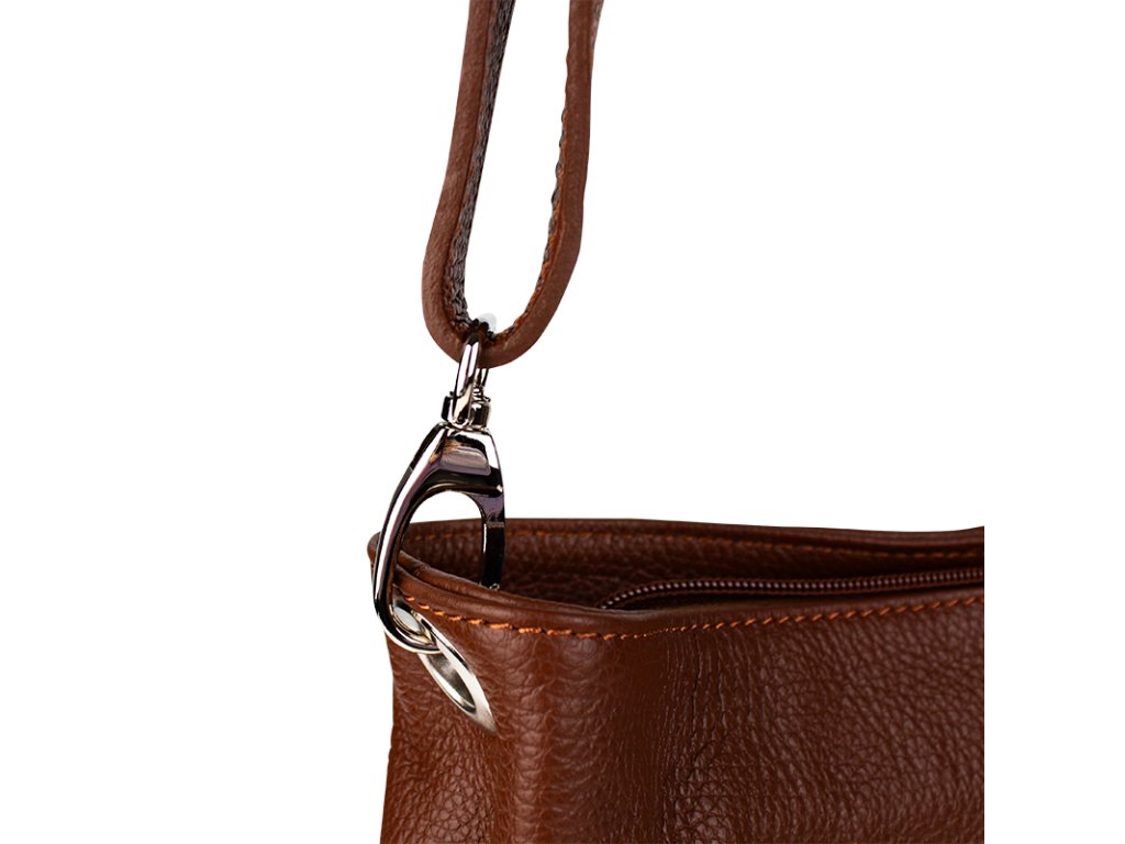 Kabelka nositelná přes rameno či cross-body (křížem) v moderní hnědé barvě. Tato kožená kabelka je uzavíratelná na zip. Uvnitř kabelky najdeme přepážku uprostřed, která zároveň slouží jako kapsa na zip, a na boční stěně pak kapsu na zip. Hloubka jejího dna je 13 cm. Kabelka má navíc nastavitelný popruh s maximální délkou cca 120 cm.