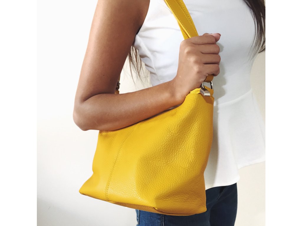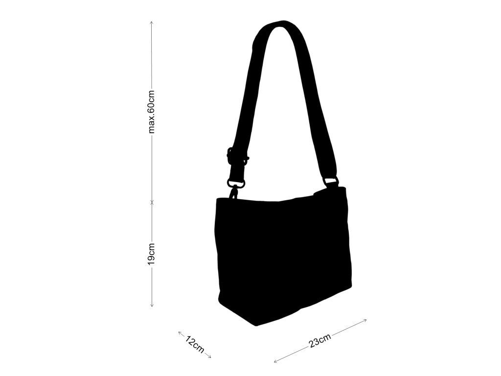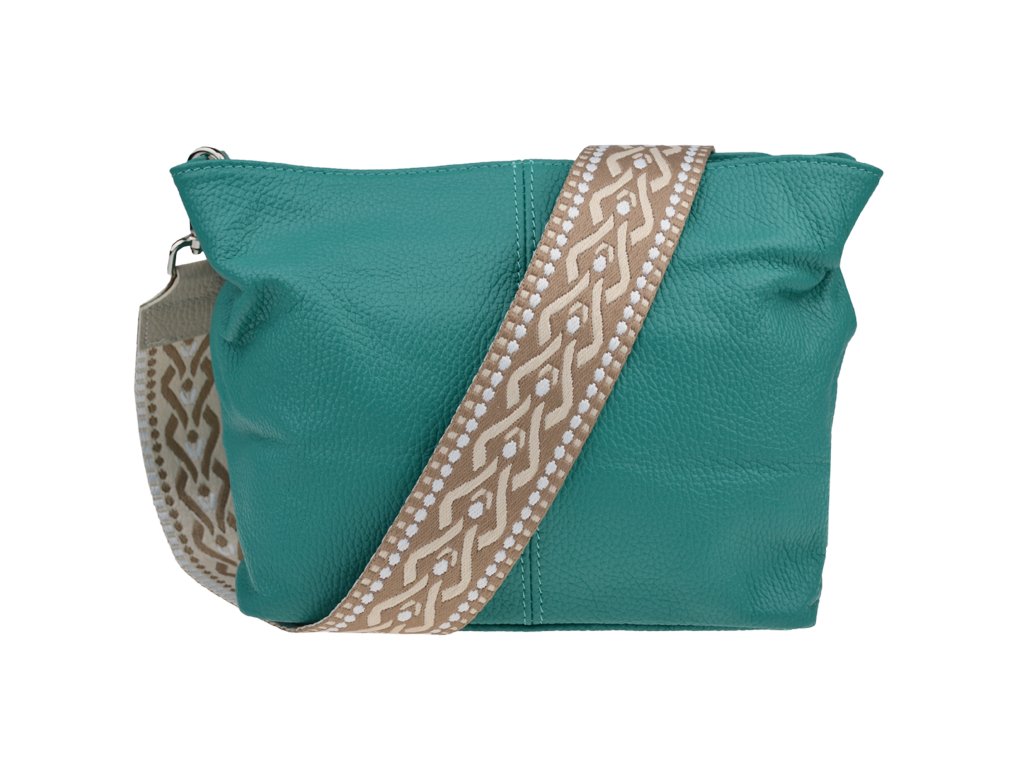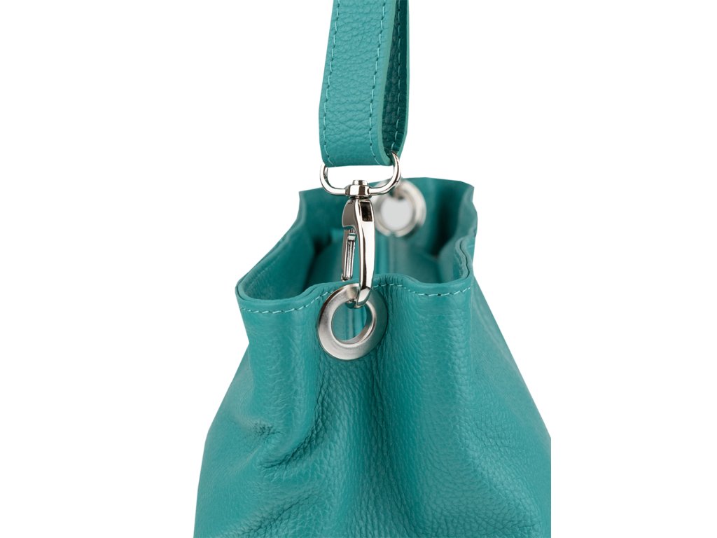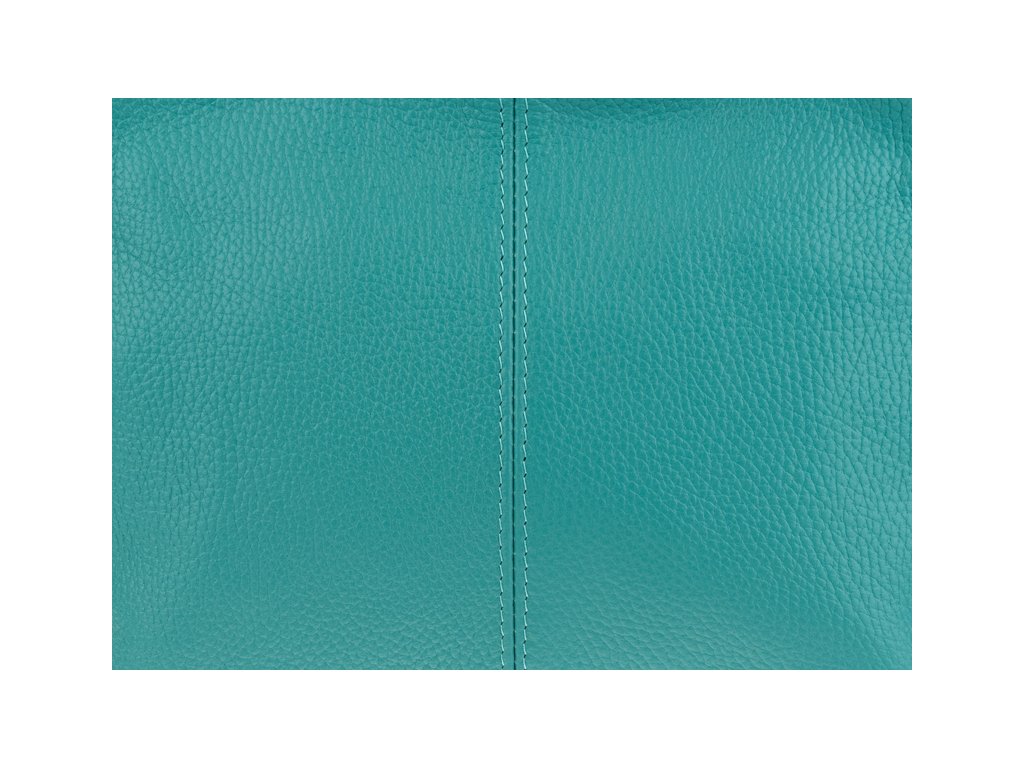 Tyrkysová kabelka nositelná přes rameno či cross-body (křížem). Tato kožená kabelka je uzavíratelná na zip. Uvnitř kabelky najdeme přepážku uprostřed, která zároveň slouží jako kapsa na zip, a na boční stěně pak kapsu na zip. Hloubka jejího dna je 13 cm.