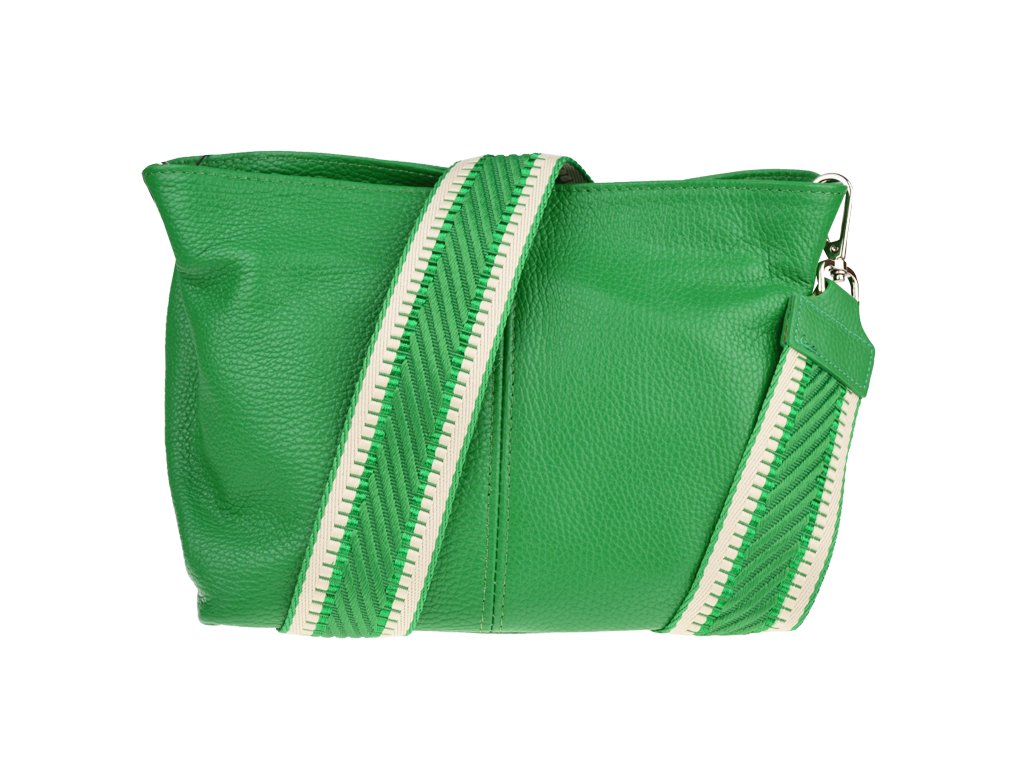 Zelená kabelka nositelná přes rameno či cross-body (křížem). Tato kožená kabelka je uzavíratelná na zip. Uvnitř kabelky najdeme přepážku uprostřed, která zároveň slouží jako kapsa na zip, a na boční stěně pak kapsu na zip. Hloubka jejího dna je 13 cm. Kabelka má navíc nastavitelný popruh s maximální délkou cca 120 cm.