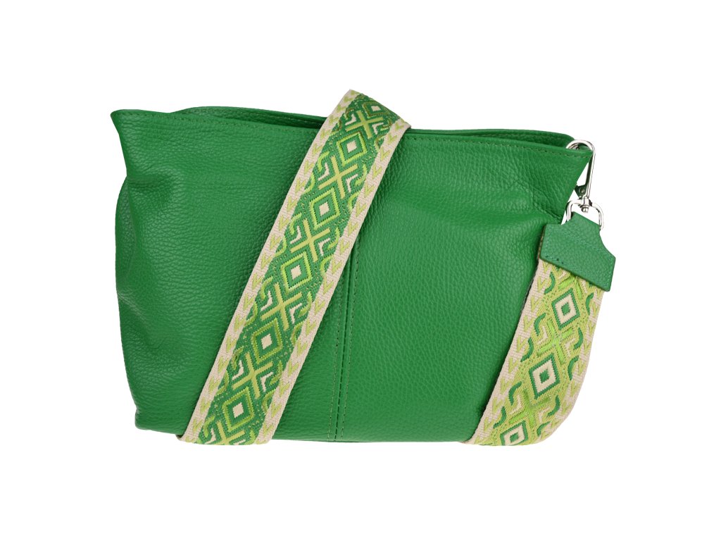Zelená kabelka nositelná přes rameno či cross-body (křížem). Tato kožená kabelka je uzavíratelná na zip. Uvnitř kabelky najdeme přepážku uprostřed, která zároveň slouží jako kapsa na zip, a na boční stěně pak kapsu na zip. Hloubka jejího dna je 13 cm. Kabelka má navíc nastavitelný popruh s maximální délkou cca 120 cm.