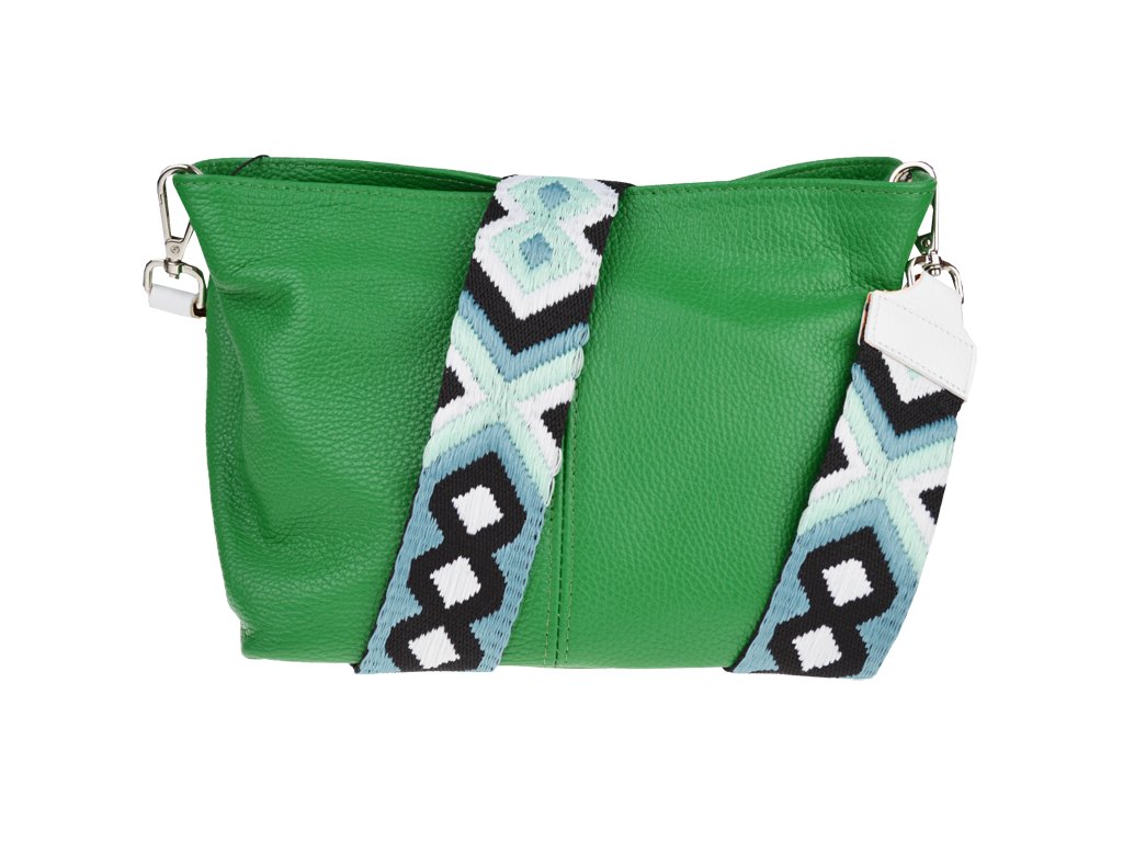 Zelená kabelka nositelná přes rameno či cross-body (křížem). Tato kožená kabelka je uzavíratelná na zip. Uvnitř kabelky najdeme přepážku uprostřed, která zároveň slouží jako kapsa na zip, a na boční stěně pak kapsu na zip. Hloubka jejího dna je 13 cm. Kabelka má navíc nastavitelný popruh s maximální délkou cca 120 cm.