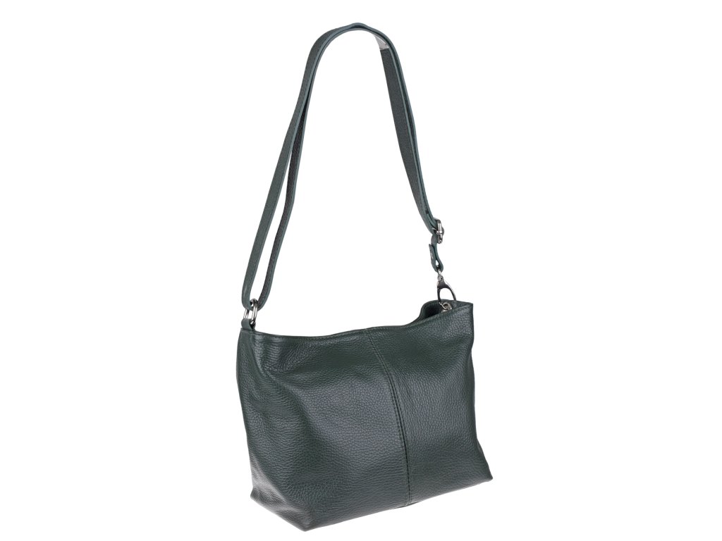 Kabelka nositelná přes rameno či cross-body (křížem). Zelená kožená kabelka je uzavíratelná na zip. Uvnitř kabelky najdeme přepážku uprostřed, která zároveň slouží jako kapsa na zip, a na boční stěně pak kapsu na zip. Hloubka jejího dna je 13 cm.