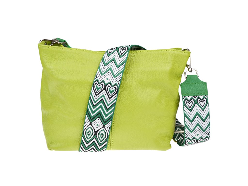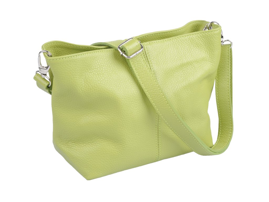 Kabelka nositelná přes rameno či cross-body (křížem). Zelená kožená kabelka je uzavíratelná na zip. Uvnitř kabelky najdeme přepážku uprostřed, která zároveň slouží jako kapsa na zip, a na boční stěně pak kapsu na zip. Hloubka jejího dna je 13 cm.