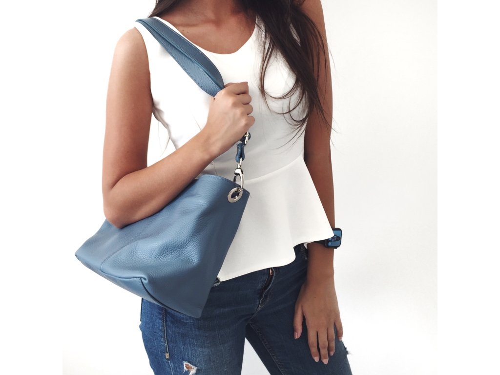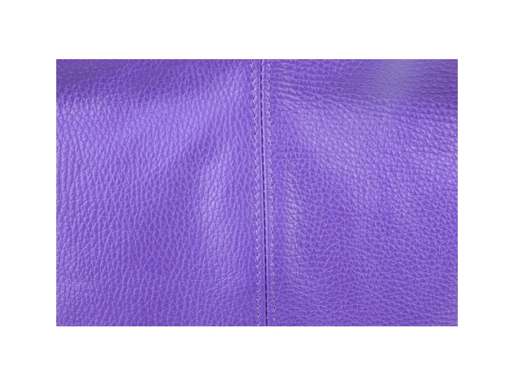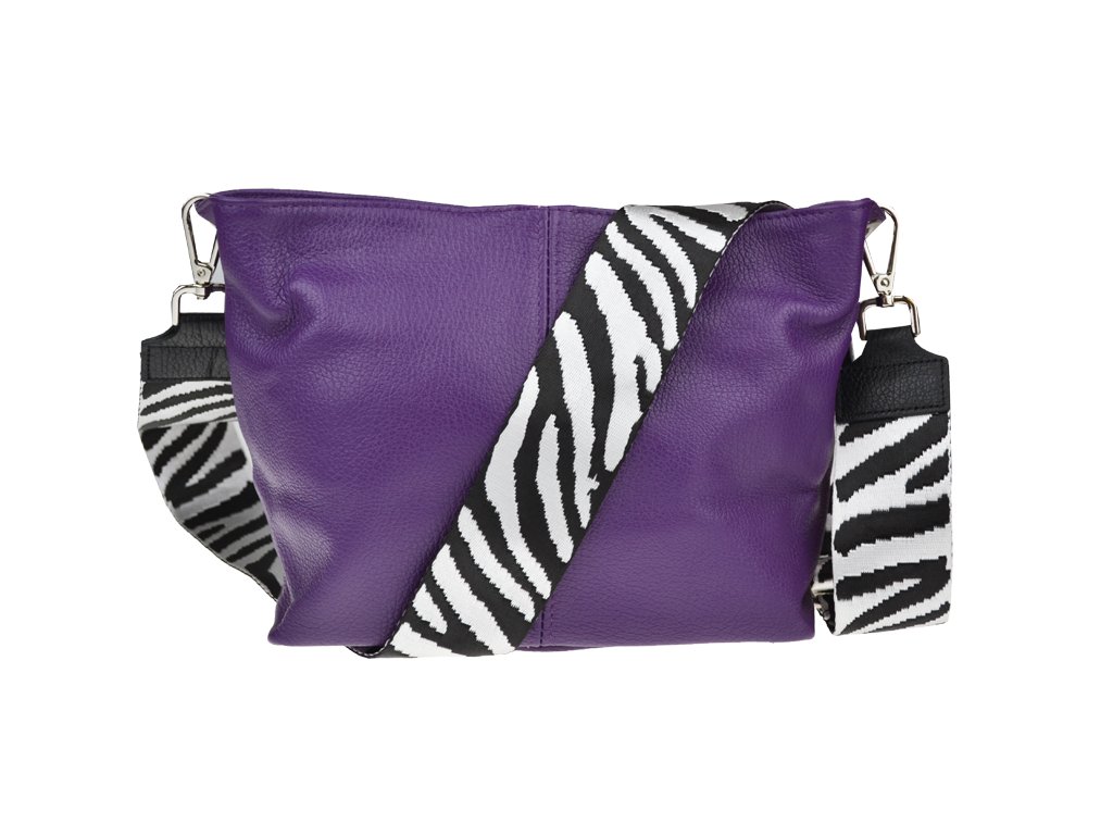 Fialová kabelka nositelná přes rameno či cross-body (křížem). Tato kožená kabelka je uzavíratelná na zip. Uvnitř kabelky najdeme přepážku uprostřed, která zároveň slouží jako kapsa na zip, a na boční stěně pak kapsu na zip. Hloubka jejího dna je 13 cm.