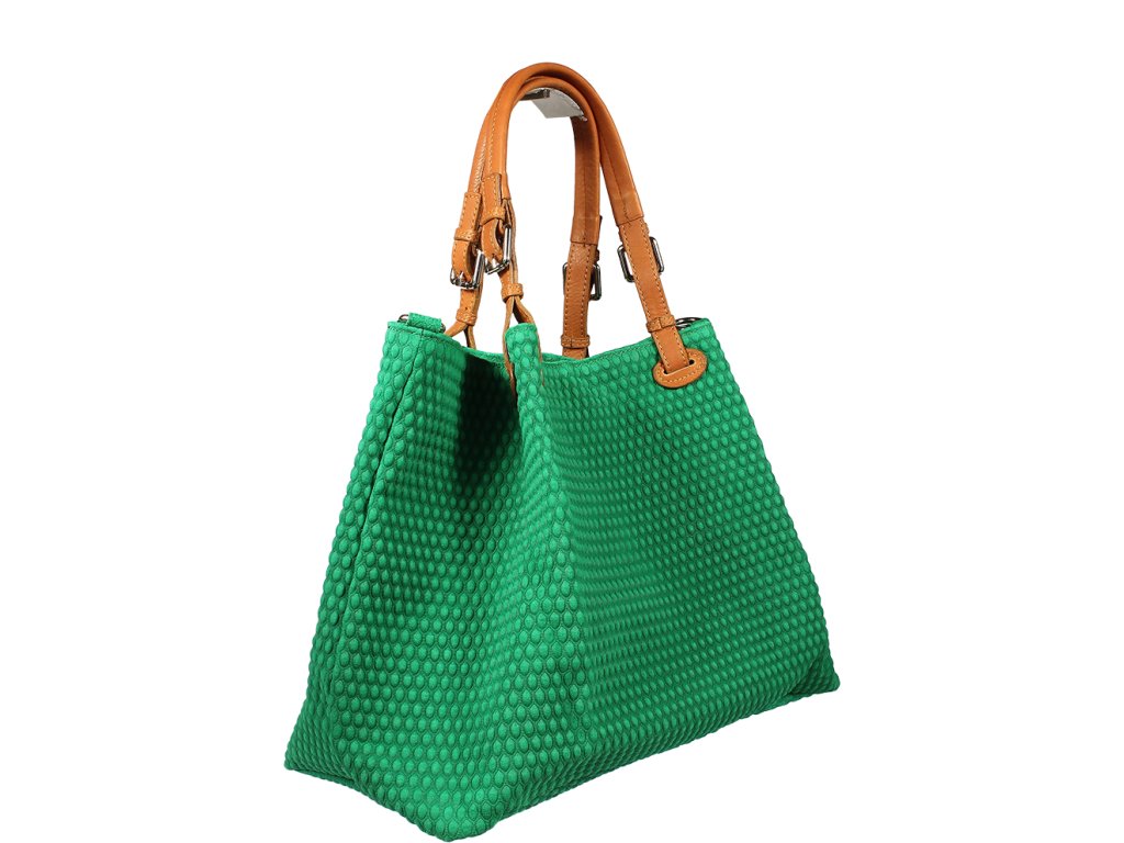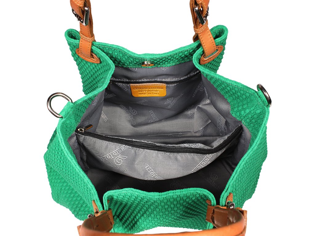 Moderní oblíbená kabelka s nekonvečním futuristickým designem v zelené barvě. Tato kožená kabelka je uzavíratelná pomocí magnetického patentku. Její materiálem je pravá kůže avšak se strukturovanou texturou. Disponuje nastavitelnými uchy, takže jí lze nosit přes rameno. Součástí balení je přídavný pásek v plné délce cca 105 cm. Uvnitř kabelky najdeme přepážku uprostřed, která zároveň slouží jako kapsa na zip, a na bočních stěnách pak kapsu na zip a na druhé straně další malou kapsu. Pohodlně se do ní vejdou dokumenty formátu A4.