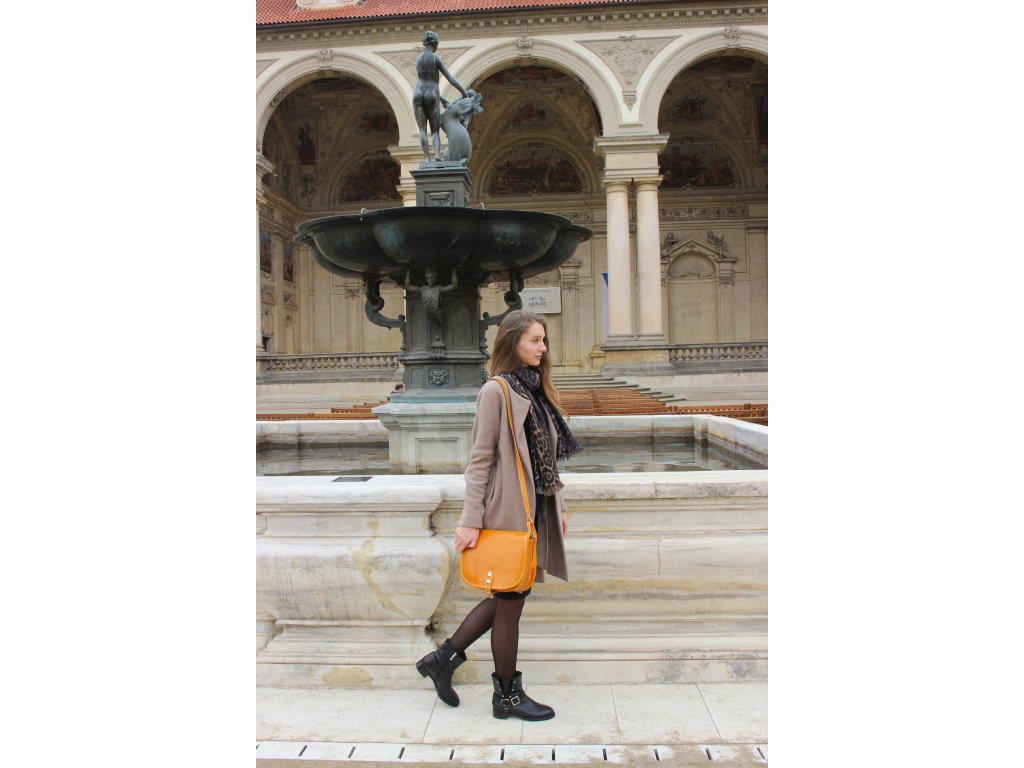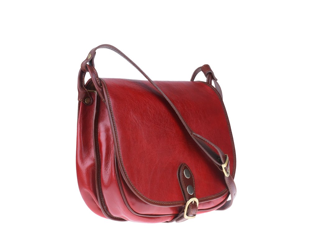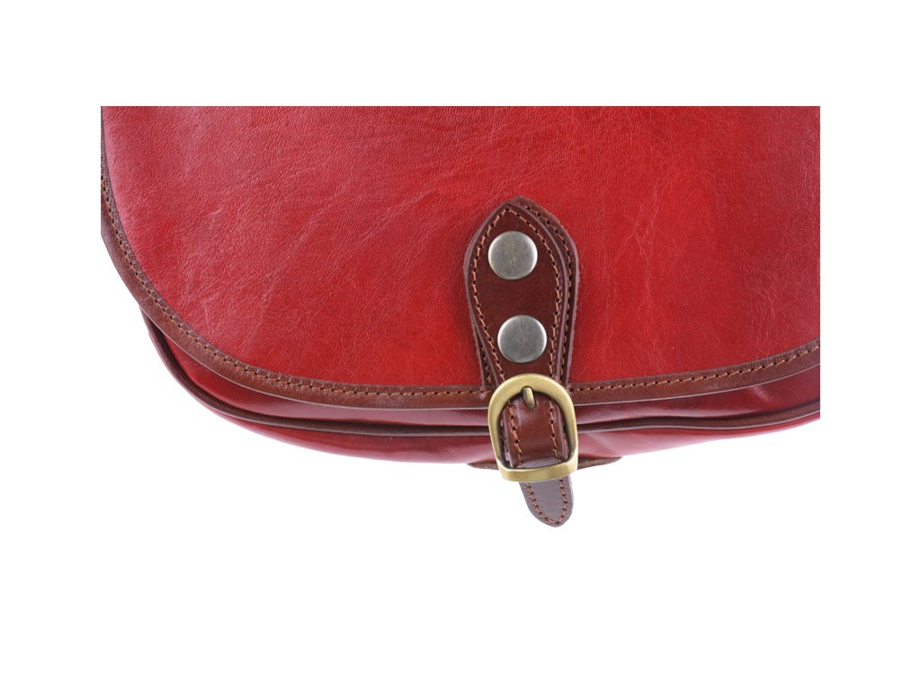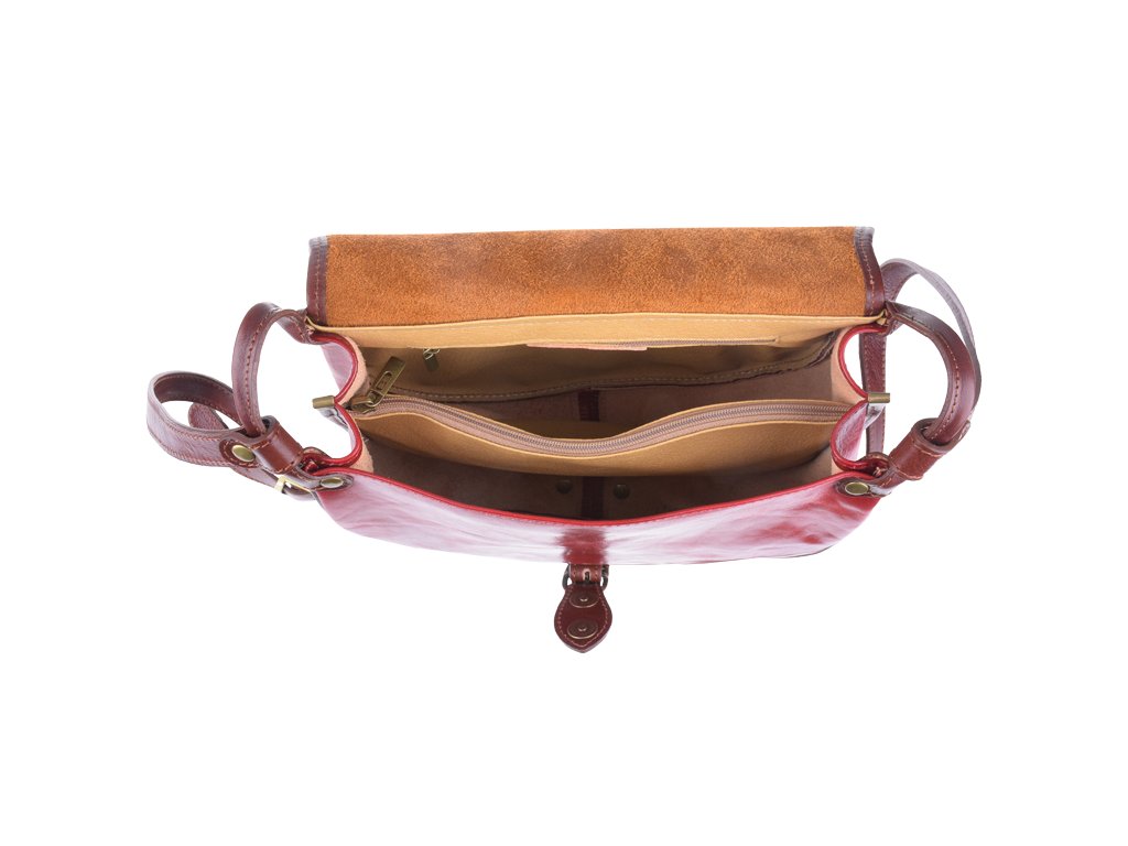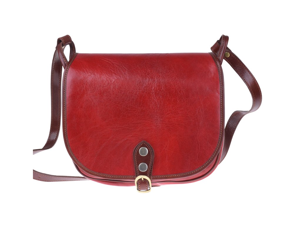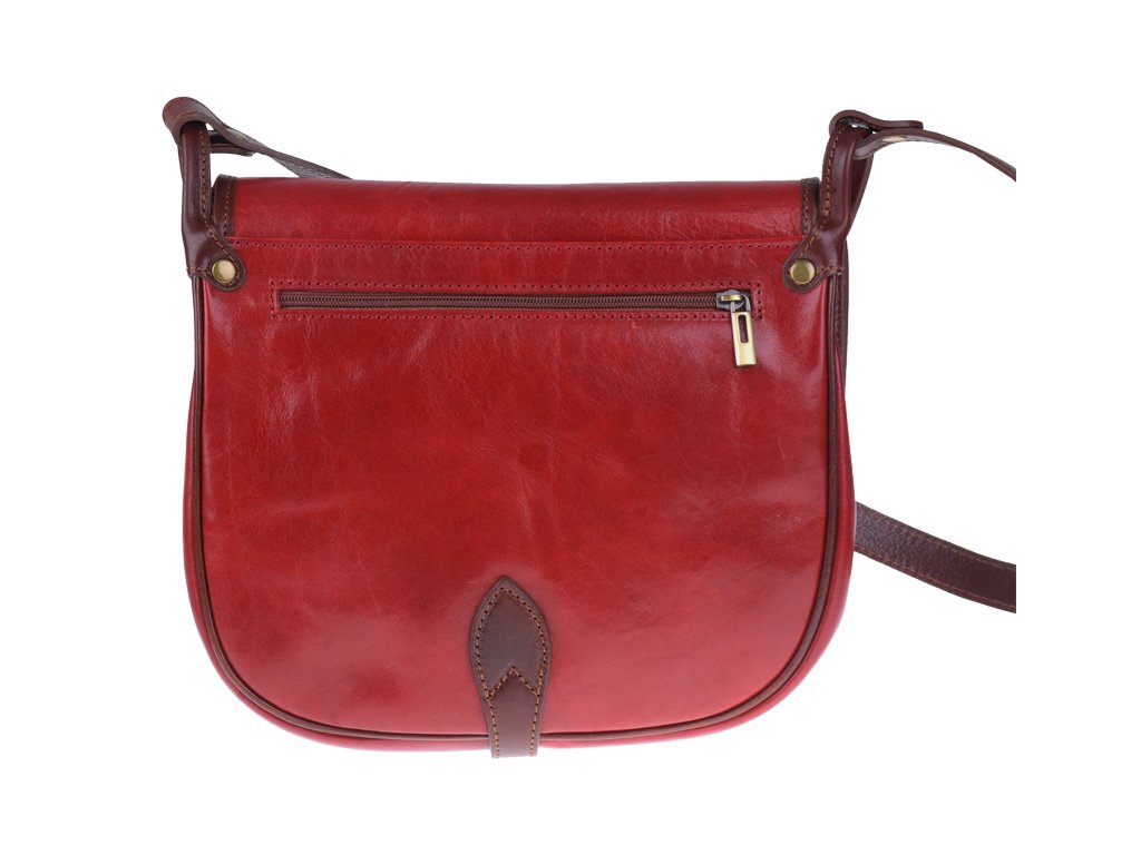 Speciální červená kabelka s klasickým loveckým designem uzavíratelná pomocí důmyslného poklopu na patentky - jeho pásek je pouze ozdobou. Nosí se přes rameno nebo cross-body (křížem). Uvnitř kabelky najdeme přepážku uprostřed, která zároveň slouží jako kapsa na zip, a na bočních stěnách pak kapsu na zip a na druhé straně další malou kapsu. Kabelka má k tomu všemu navíc kapsu na zip na vnější zadní straně. Max. délka popruhu je 120 cm.
