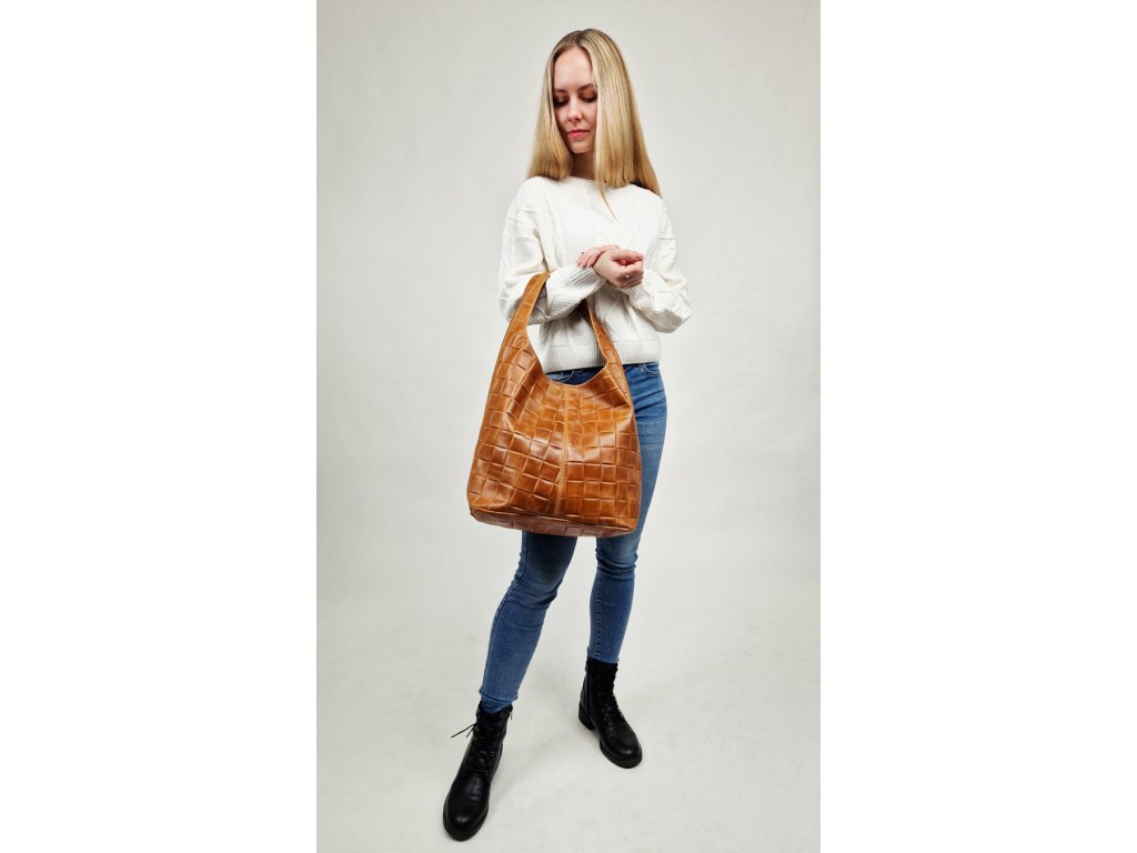 Praktická a prostorná kožená kabelka v camel barvě. Jednoduché provedení a velký prostor dělá tuto kabelku neobyčejně praktickou pro denní nošení.
