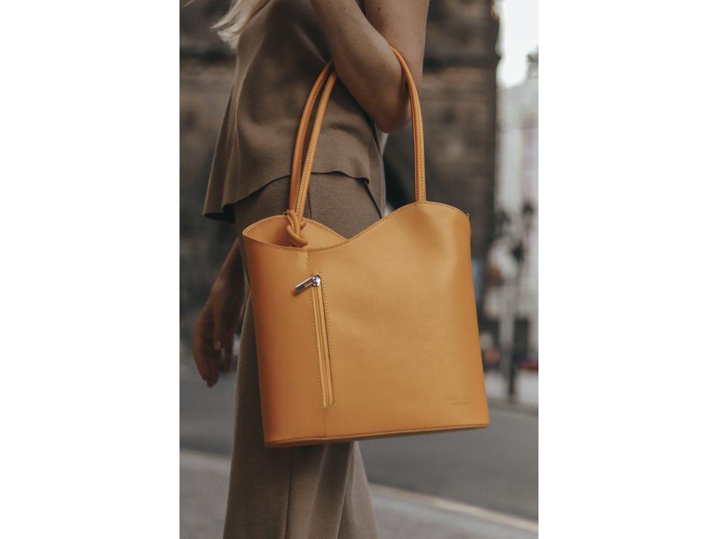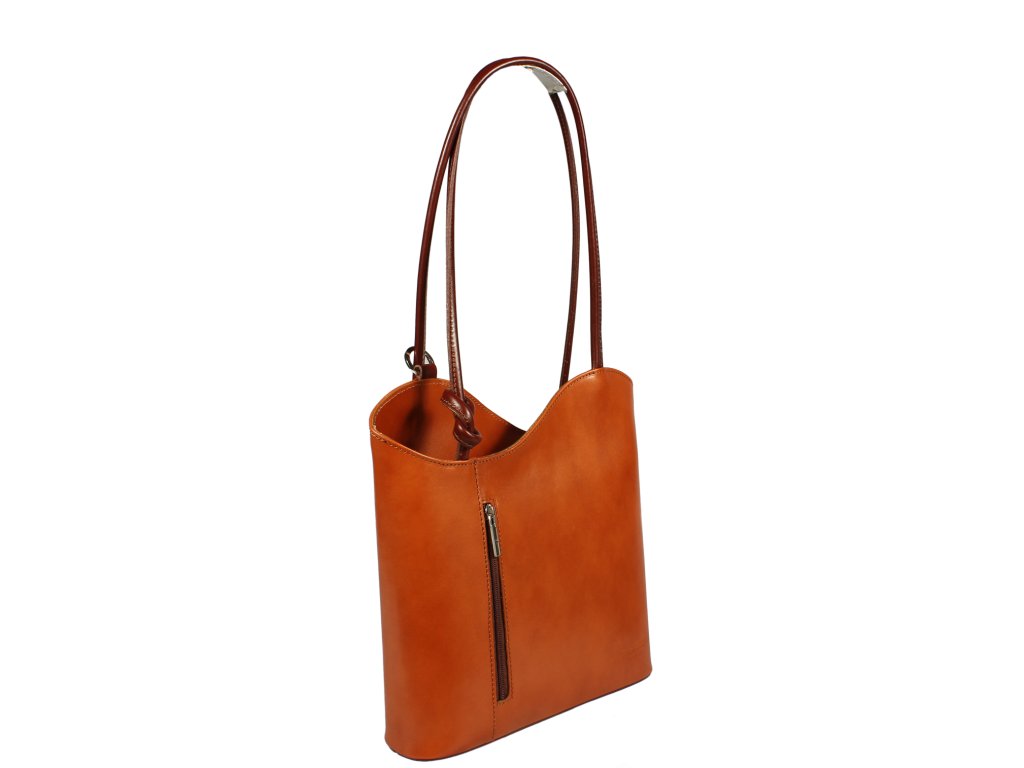 Krásná kožená kabelka v barvě camel s hnědými uchy. Výhodou této kabelky je, že ji lze nosit přes rameno, stejně tak jako batůžek. Je uzavíratelná na zip. Uvnitř má látkovou přepážku s kapsou, dále pak kapsičku na straně, obě také uzavíratelné na zip. Na druhé vnitřní straně jsou dvě otevřené kapsičky, například na telefon. Kabelka je vyrobena z hladké, pevné hovězí kůže. Hloubka dna je 8,5 cm.