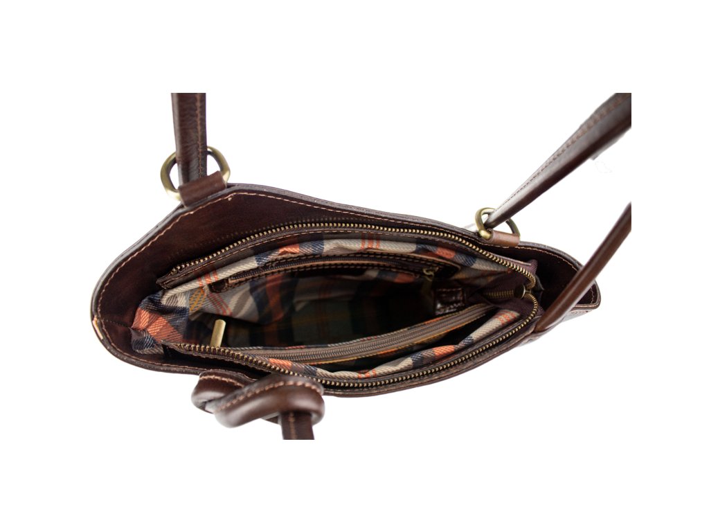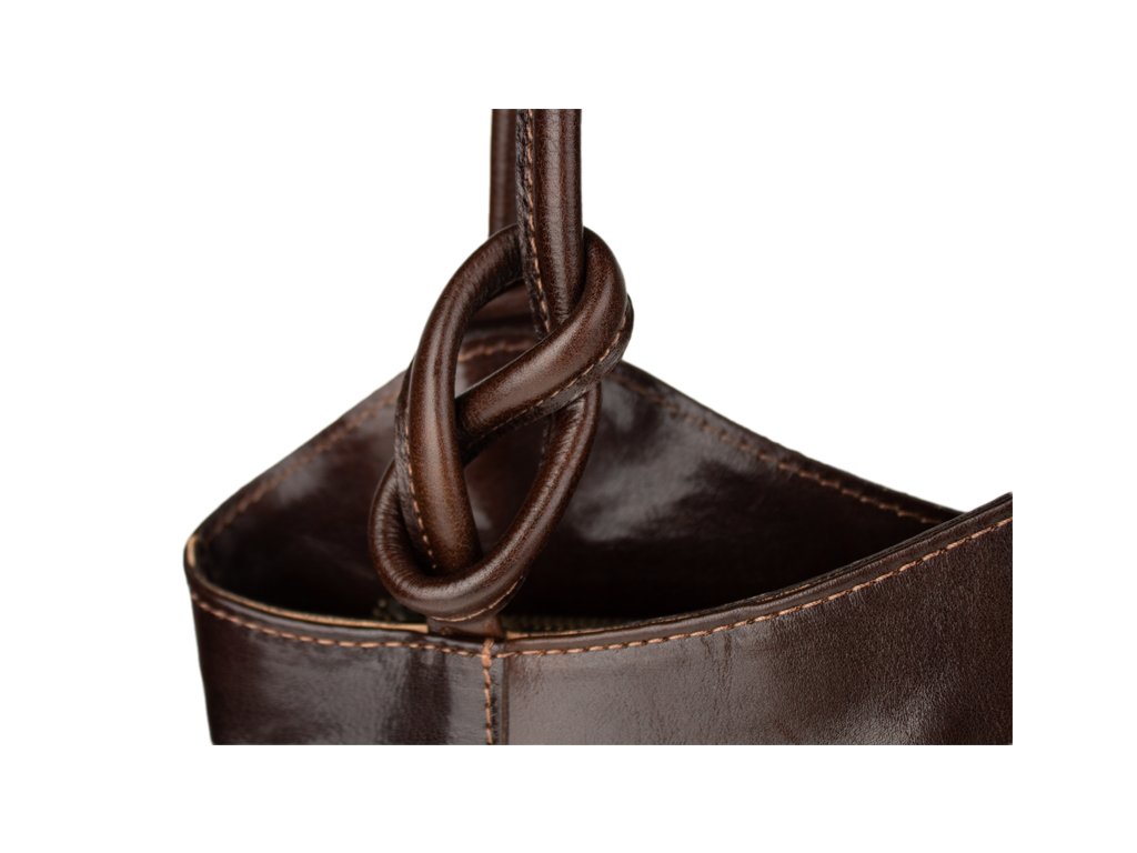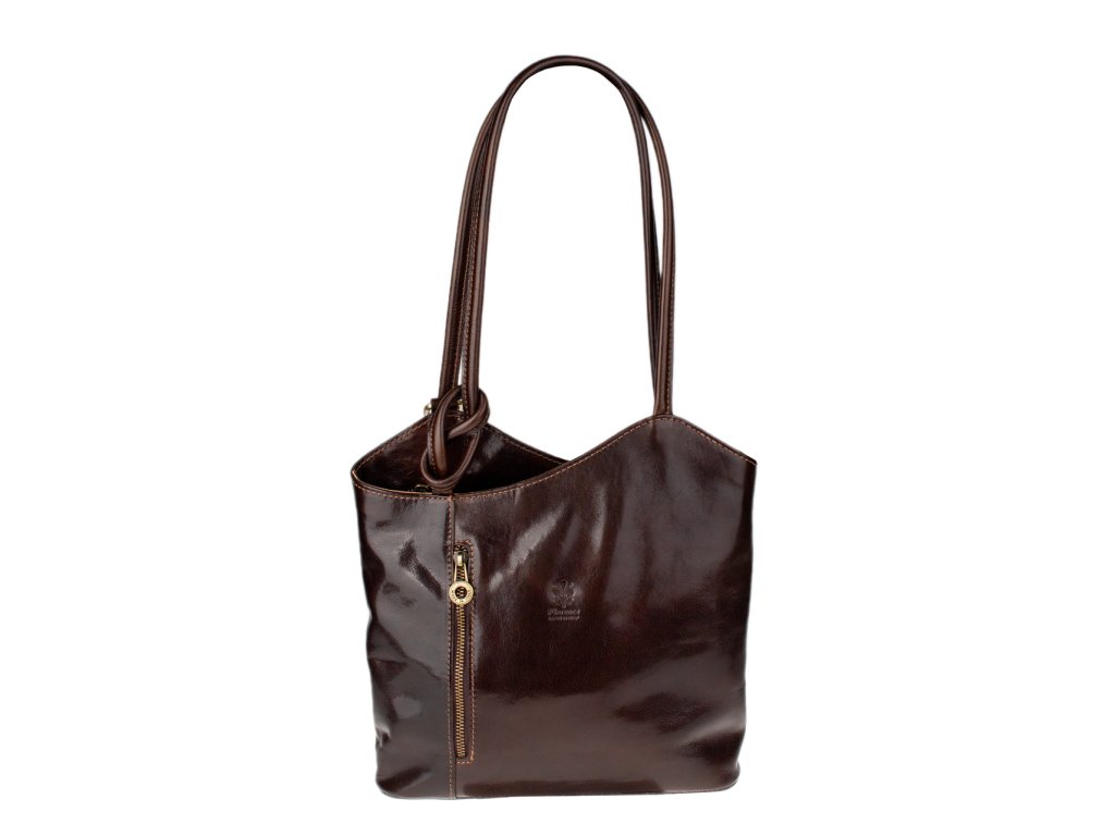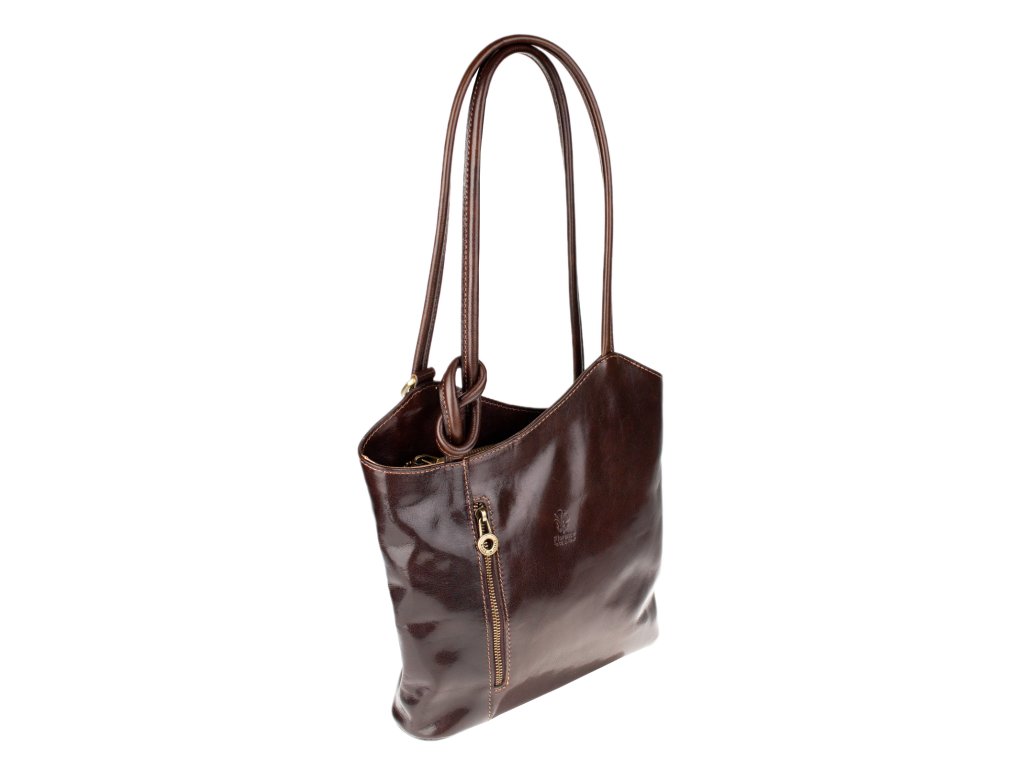 Krásná kožená kabelka v hnědé barvě. Výhodou této kabelky je, že ji lze nosit přes rameno, stejně tak jako batůžek. Je uzavíratelná na zip. Uvnitř má látkovou přepážku s kapsou, dále pak kapsičku na straně, obě také uzavíratelné na zip. Na druhé vnitřní straně jsou dvě otevřené kapsičky, například na telefon. Kabelka je vyrobena z hladké, pevné hovězí kůže. Hloubka dna je 8,5 cm.