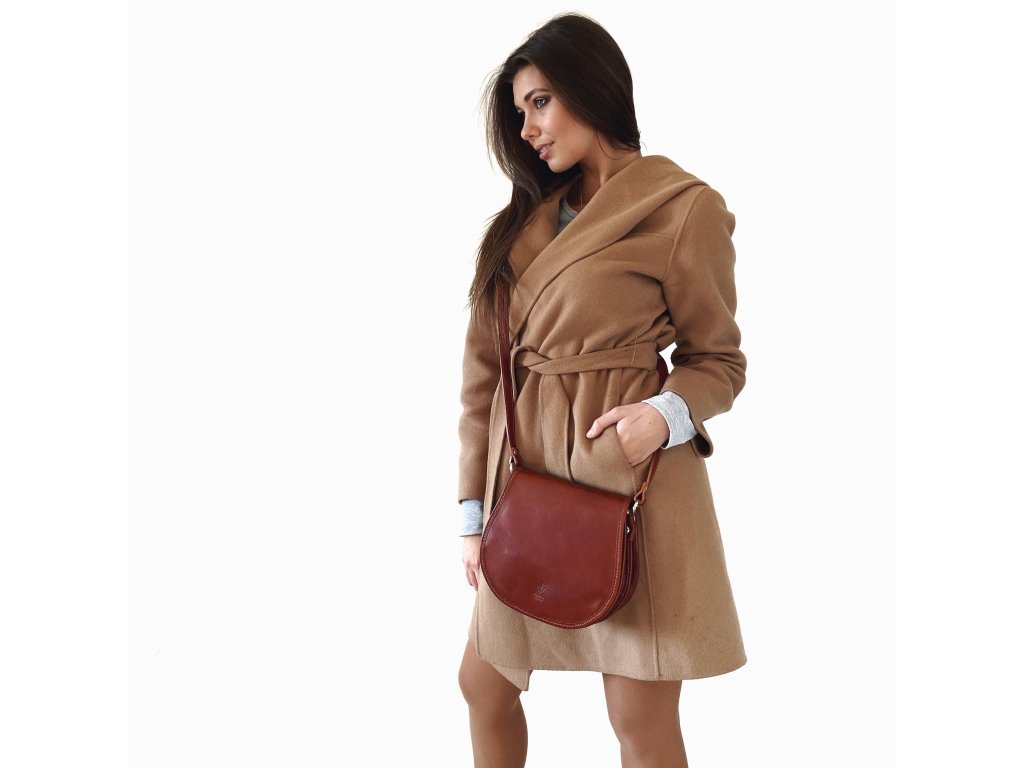Malá šikovná kabelka se zajímavým tvarem. Kabelka je vyrobená z pravé kůže, která velice dobře drží svůj tvar. Je vhodná na nošení přes rameno nebo cross-body (křížem).