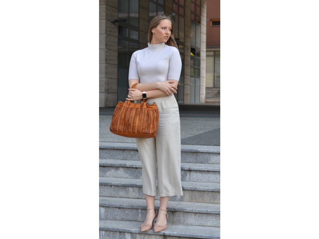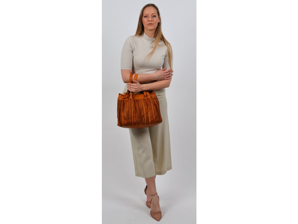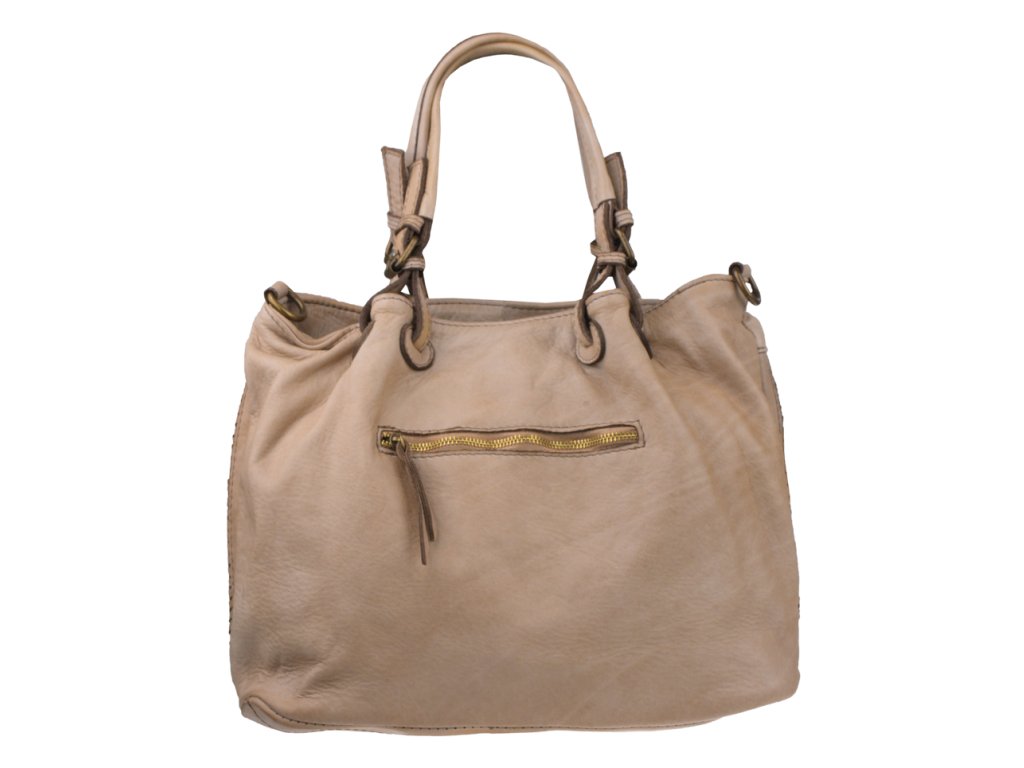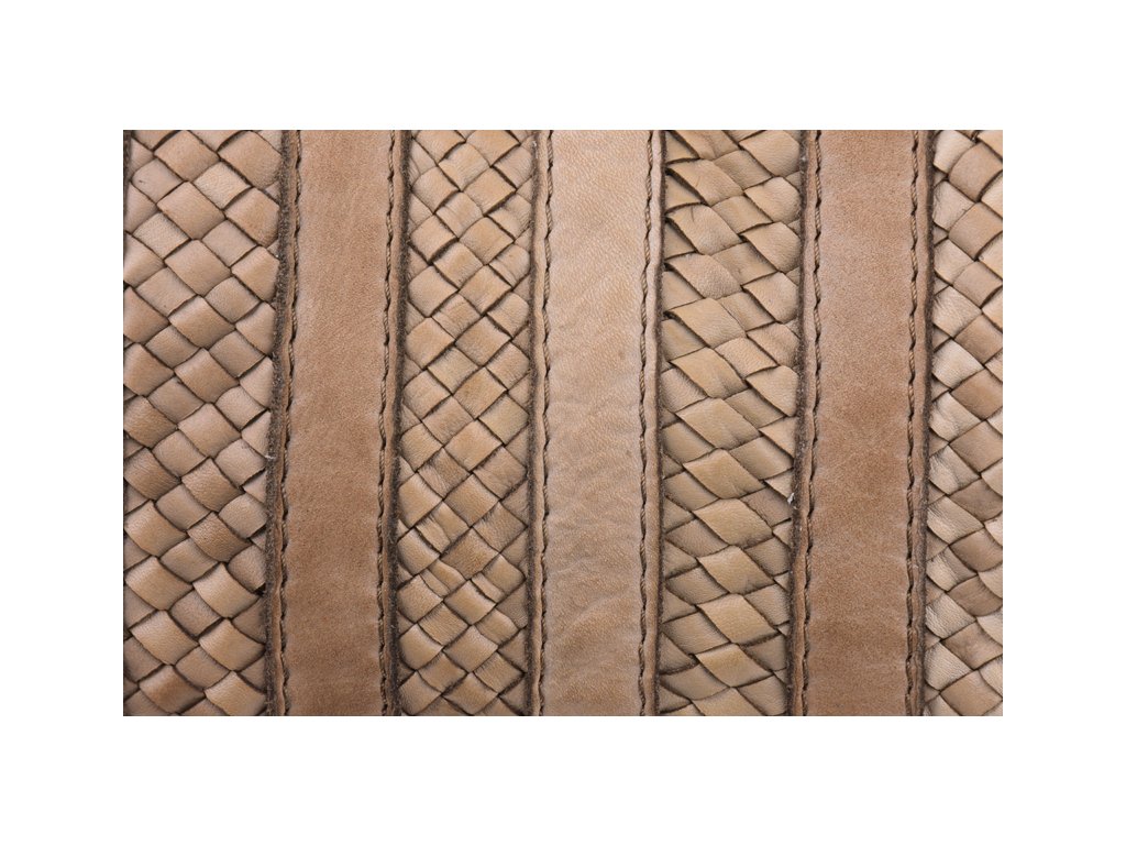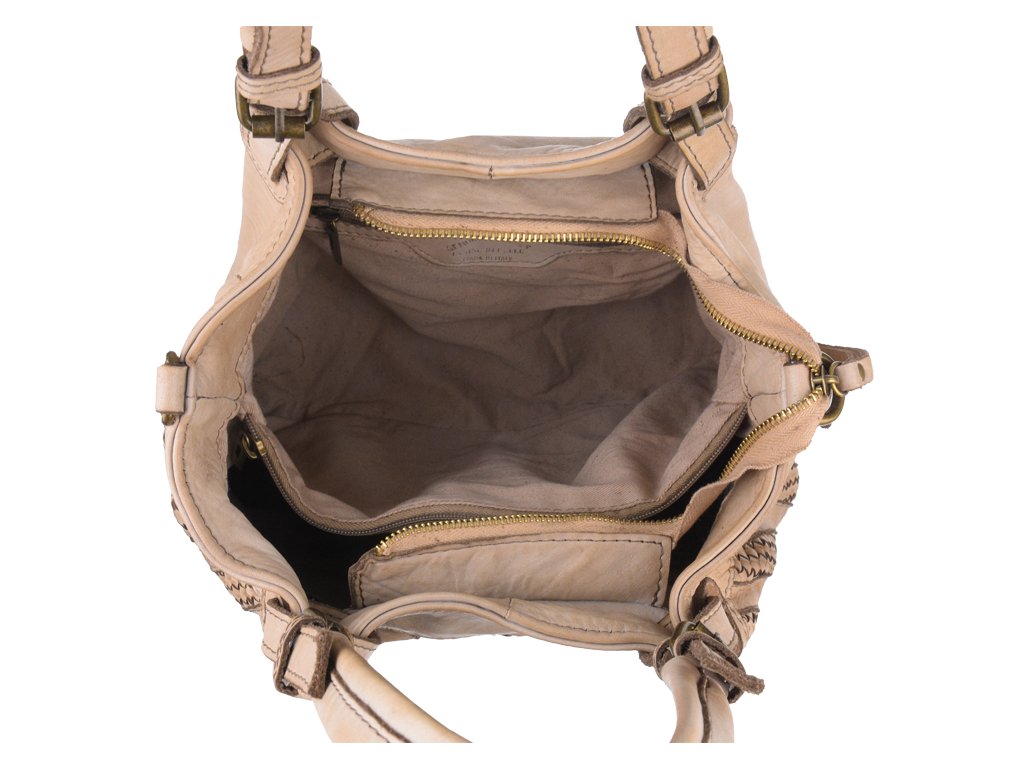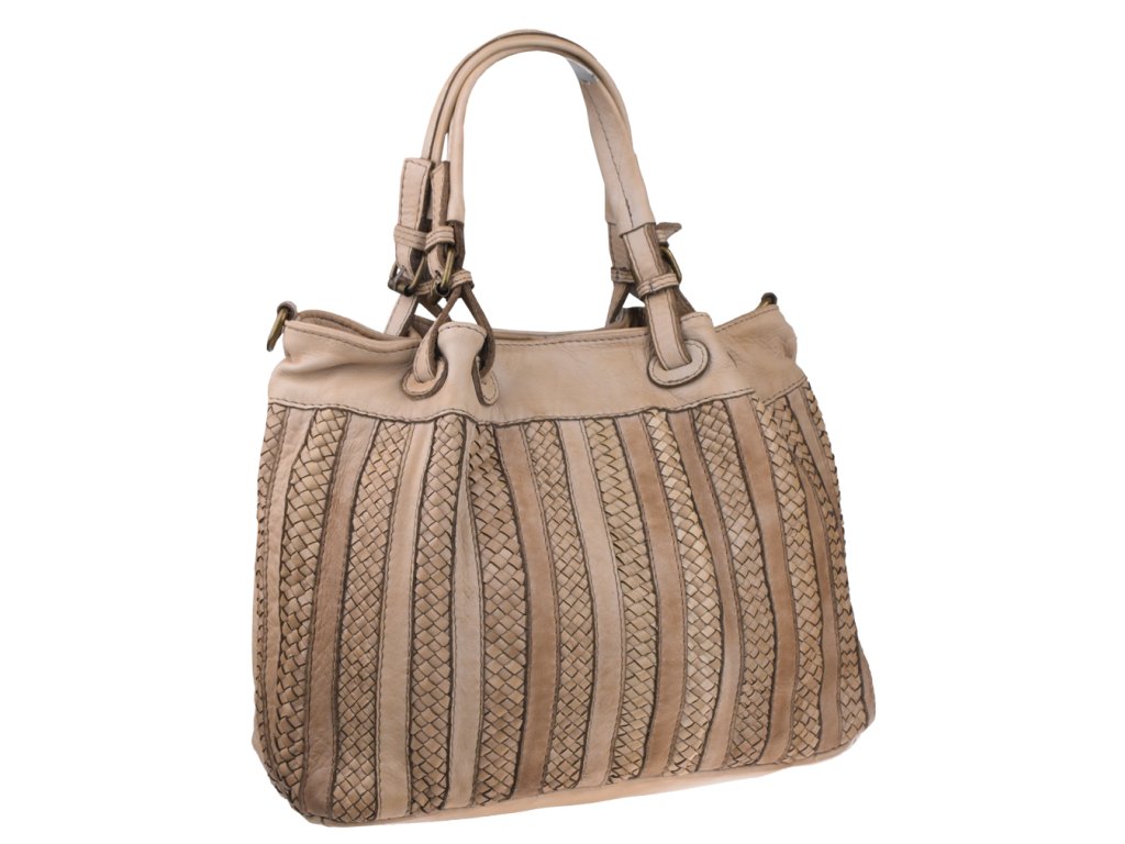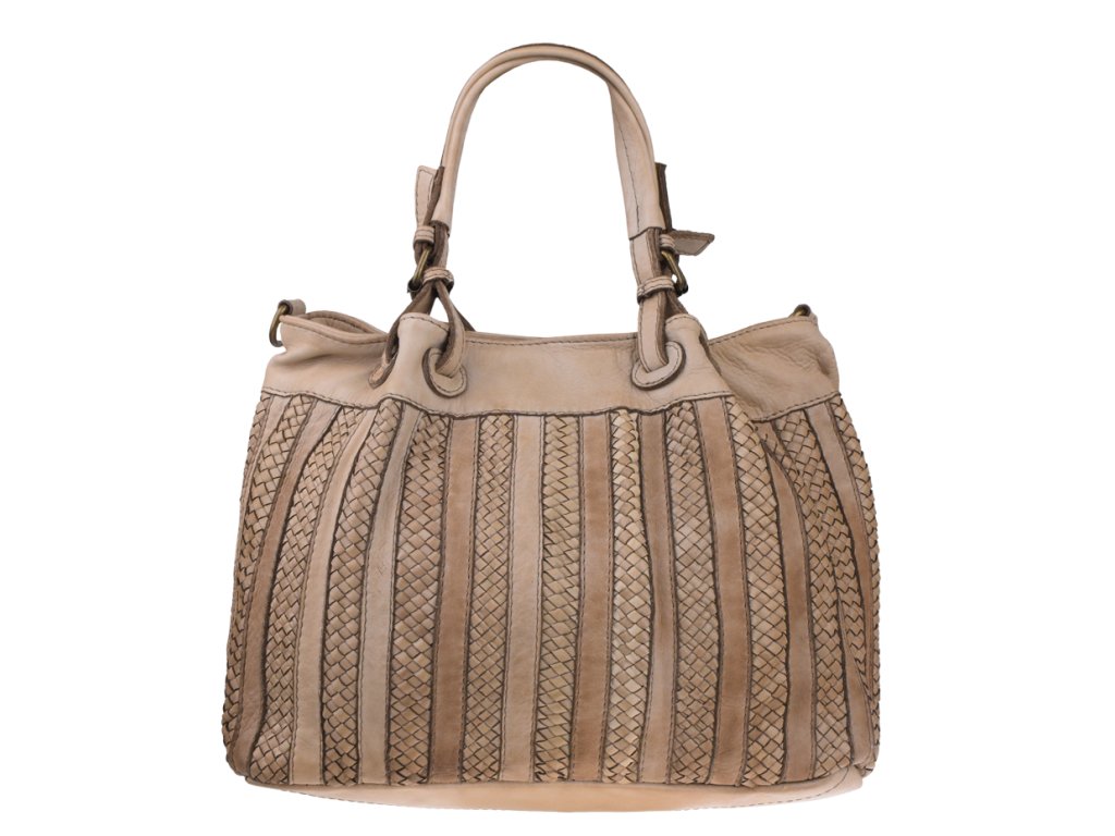 Praktická a prostorná kožená kabelka v béžovo-hnědé barvě. Důmyslné proplétané provedení dělá tuto kabelku neobyčejně praktickou pro denní nošení. Vnitřek kabelky je vybaven kapsou na zip.