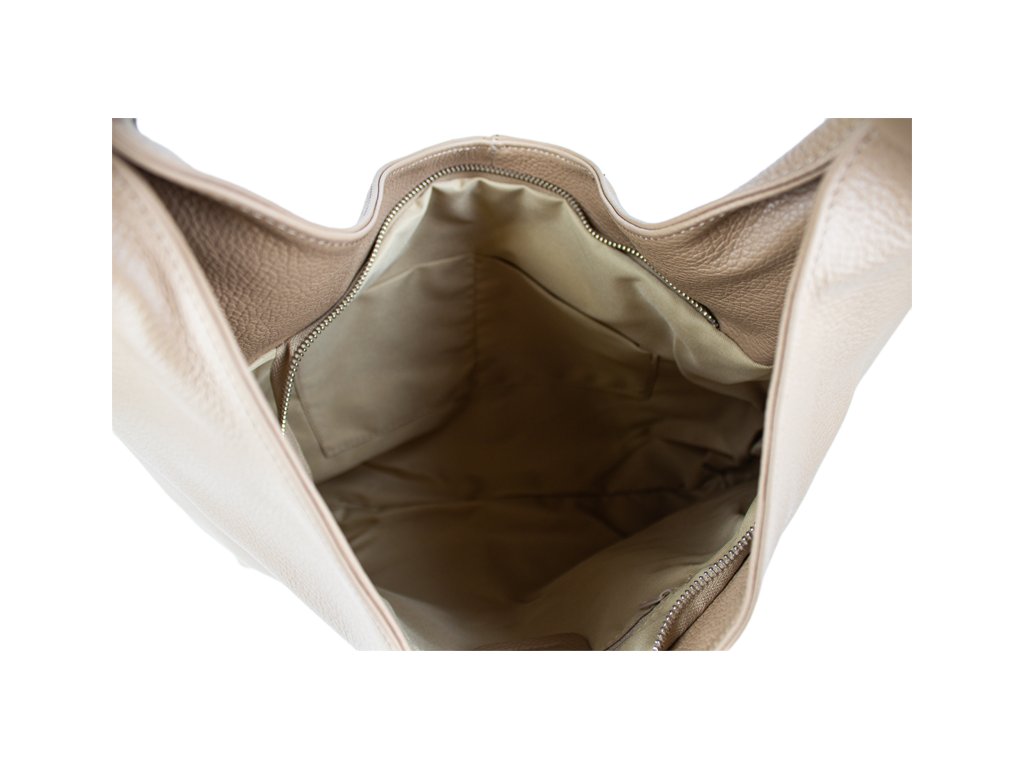 Tato stylová kabelka typu „shopping bag“ vás na první pohled zaujme svou krásnou tmavě-béžovou barvou a moderním, uvolněným střihem (tzv. hobo style). Je vyrobena z materiálu s jemnou zrnitou texturou, která jí dodává luxusní vzhled a je příjemná na dotek.