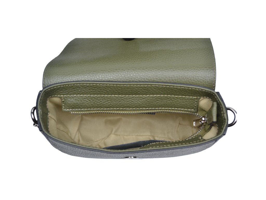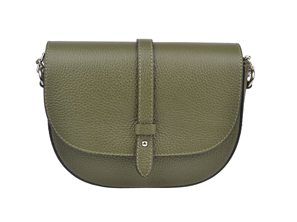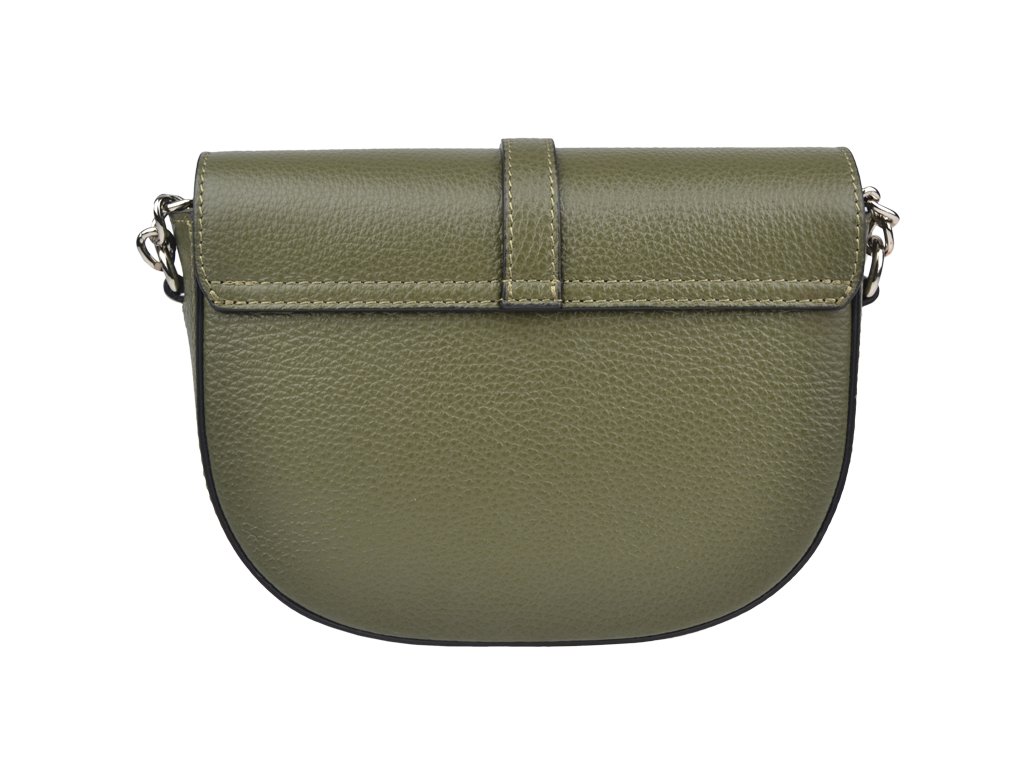 Zelená kabelka nositelná přes rameno či cross-body (křížem). Tato kožená kabelka je uzavíratelná na patentku a uvnitř nalezneme přihrádku na zip. Barva řetízku je stříbrná. Kabelka má nastavitelný popruh s maximální délkou cca 125 cm.