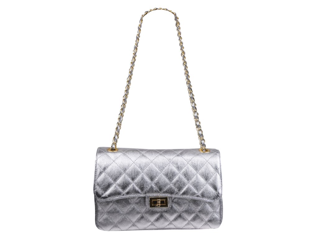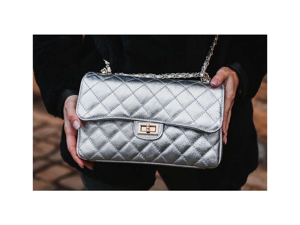 Krásná stříbrná kabelka z měkké kůže. Tato originální kabelka určená k nošení přes rameno je vhodným doplňkem pro pravidelné nošení. Kabelka je uzavíratelná důmyslnou patentkou, která zároveň slouží jako ozdobný prvek. Uvnitř kabelky nalezneme kapsu na zip. Délka řetízku přes rameno je 120 cm.