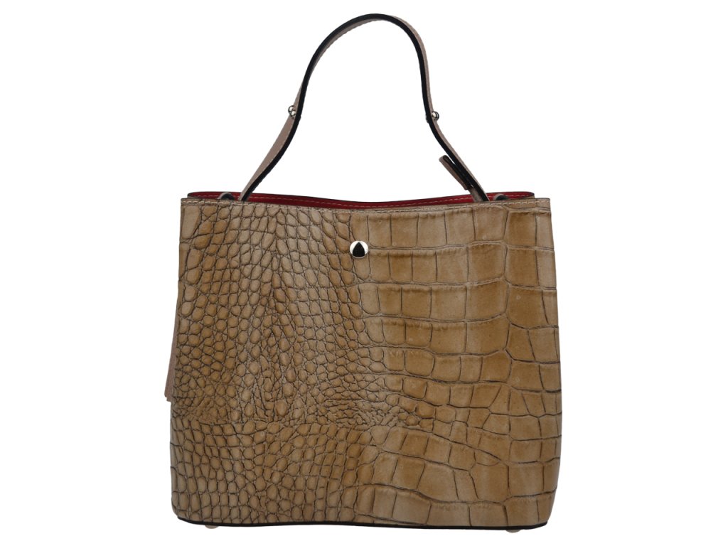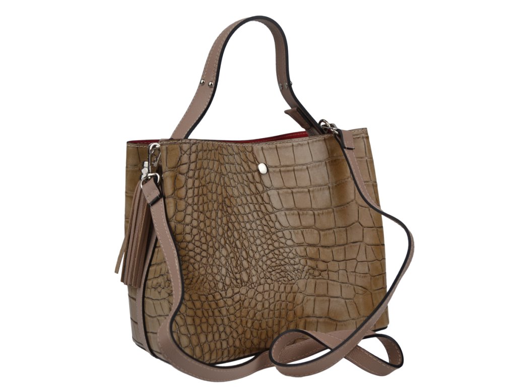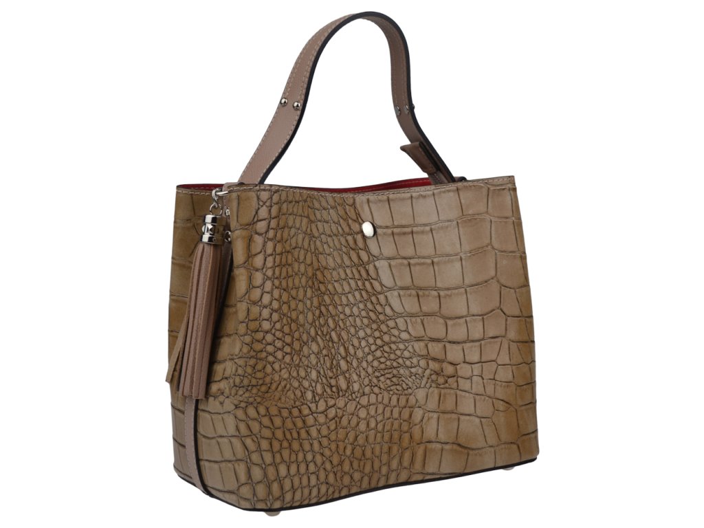Praktická kabelka v taupe provedení s krokodýlí texturou (barva kovových doplňků je stříbrná) pro každodenní nošení vyrobená z pevné pravé kůže. Nosí se v ruce nebo přes rameno. Kabelka je uzavíratelná na patentku. Uvnitř kabelky najdeme praktickou přihrádku na na zip. Kabelka má přídavný popruh délky 105 cm.