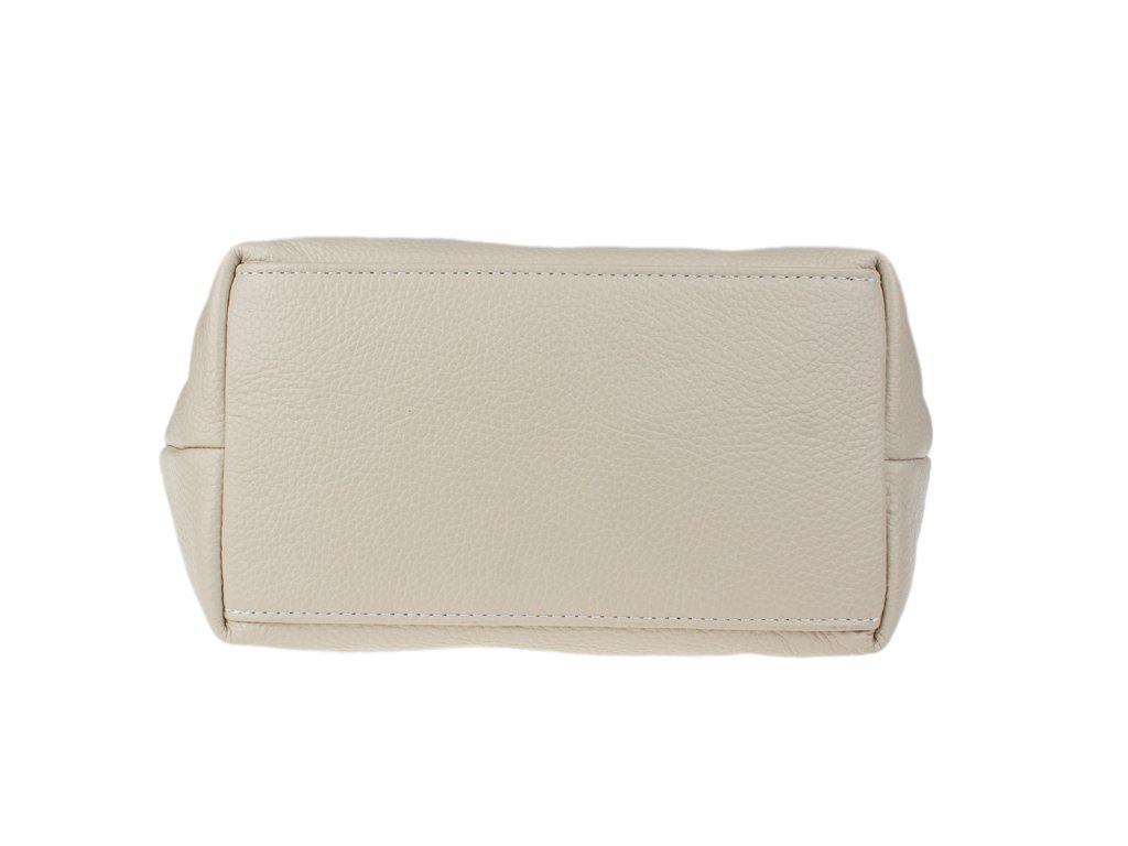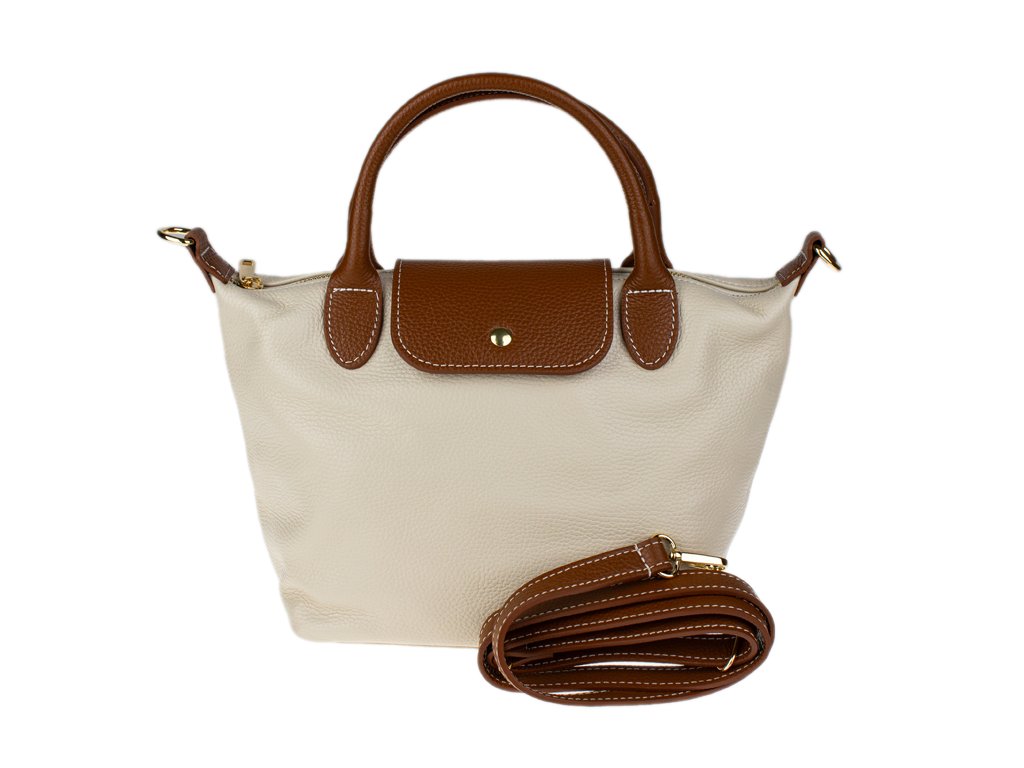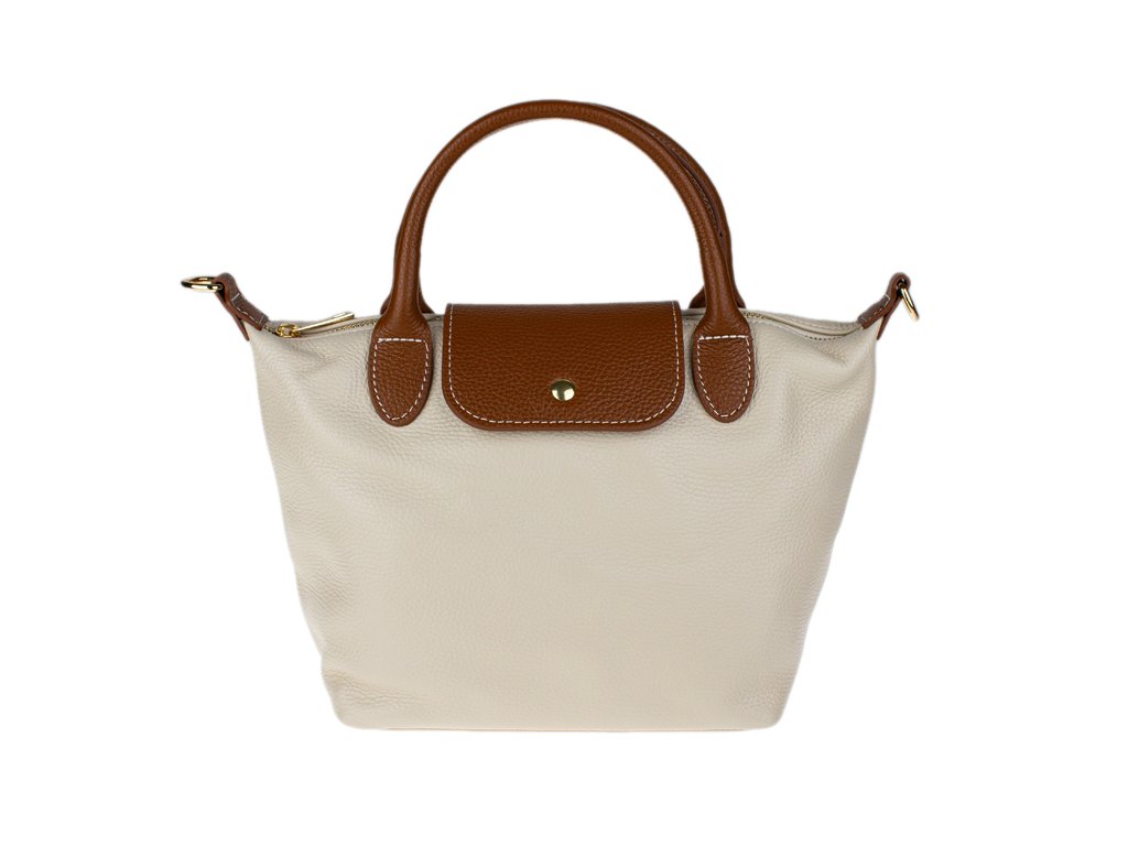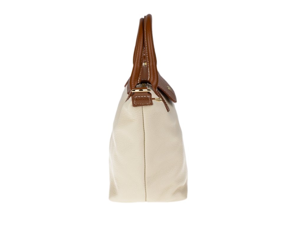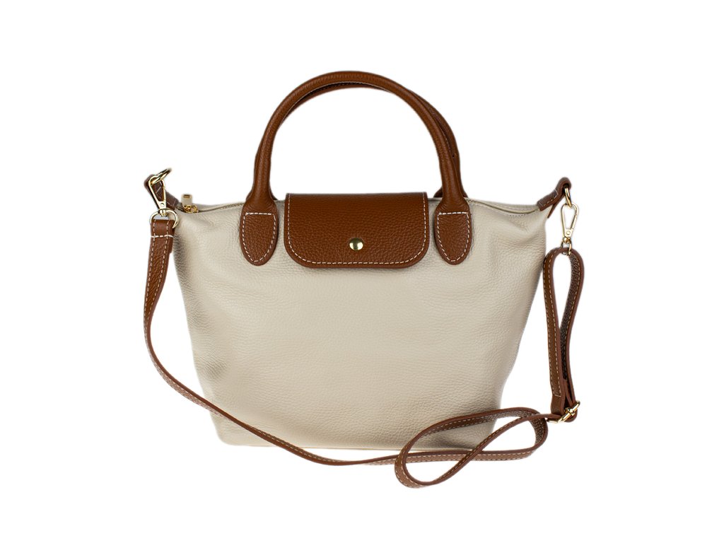 Kabelka je vyrobena z kvalitní pravé kůže s jemnou zrnitou strukturou, která je nejen příjemná na dotek, ale také odolná vůči poškrábání. Design sází na osvědčenou kombinaci béžové barvy těla kabelky s kontrastními detaily v koňakovém odstínu (ucha, klopa, popruh). Celkový luxusní dojem doplňuje decentní zlaté kování a precizní světlé prošívání.