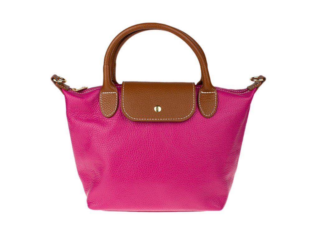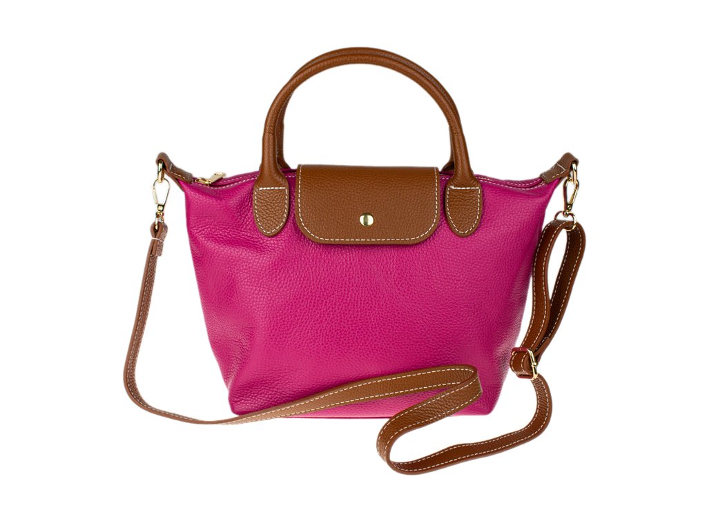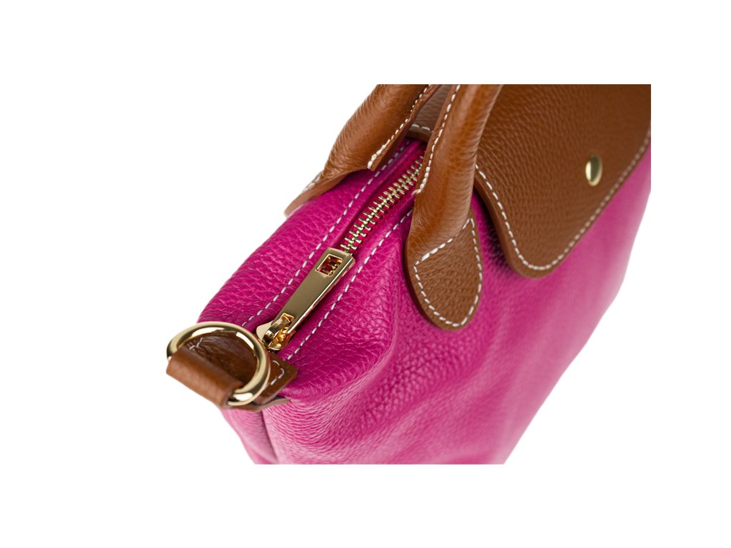 Kabelka je vyrobena z kvalitní pravé kůže s jemnou zrnitou strukturou, která je nejen příjemná na dotek, ale také odolná vůči poškrábání. Design sází na osvědčenou kombinaci fuxiové barvy těla kabelky s kontrastními detaily v koňakovém odstínu (ucha, klopa, popruh). Celkový luxusní dojem doplňuje decentní zlaté kování a precizní světlé prošívání.