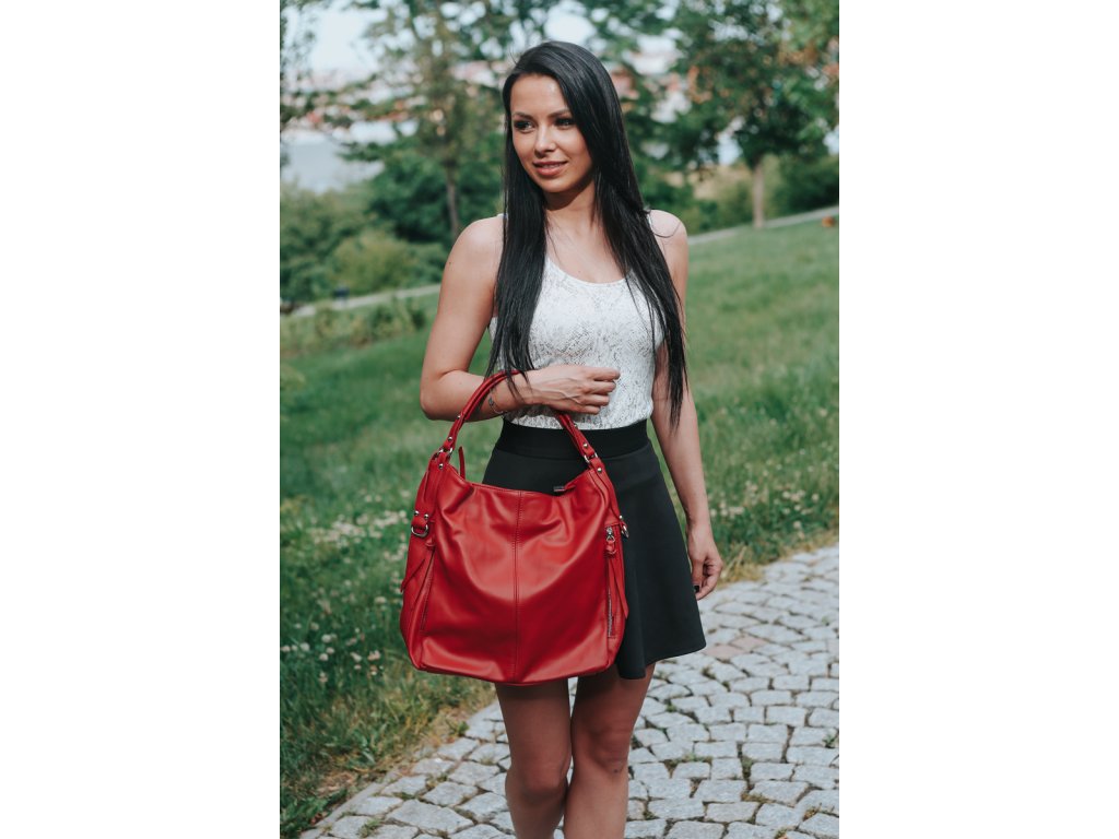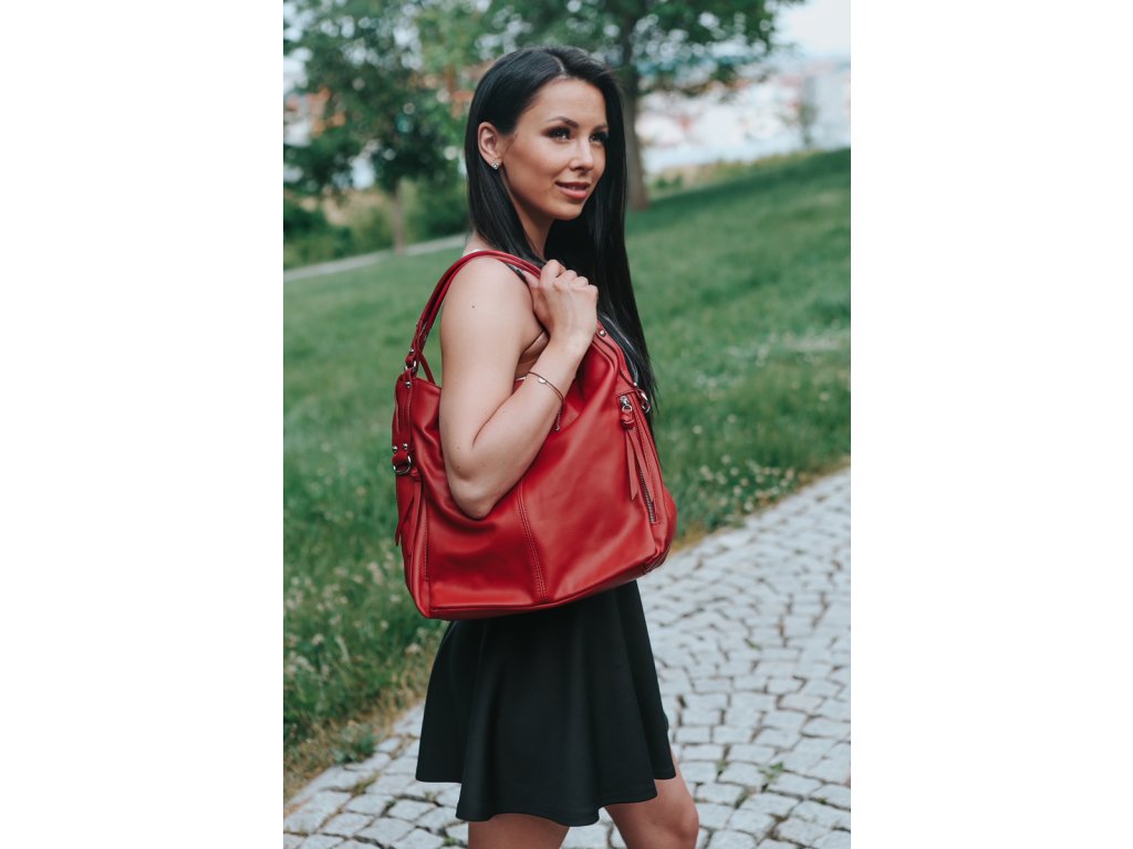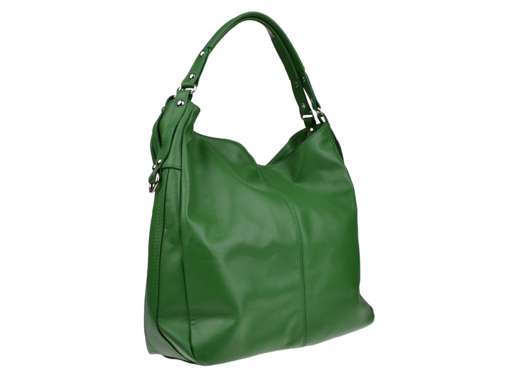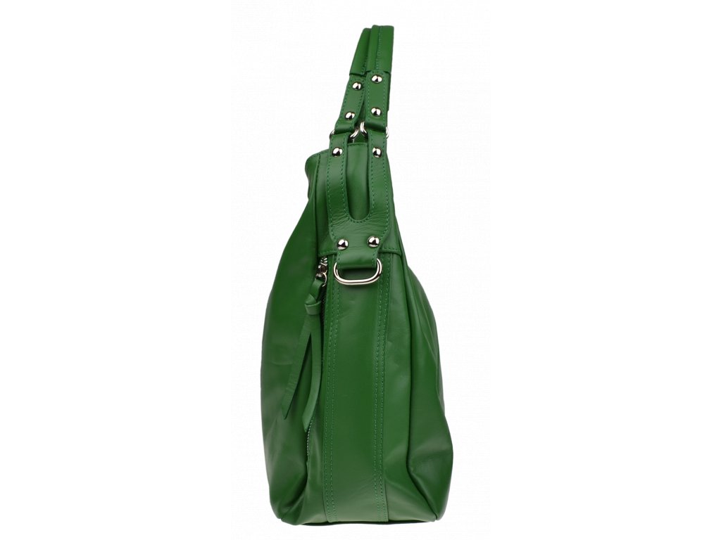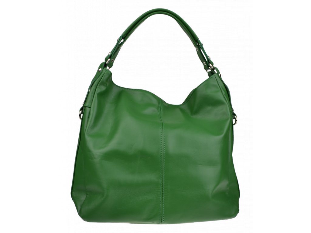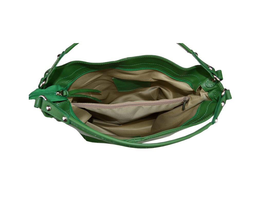 Kabelka se nosí přes rameno a je vhodná jak pro volný čas, tak i do práce. Dobře nám mohou posloužit dvě kapsy na zip, které můžeme nalézt z boku. Jinak je tato zelená kožená kabelka uzavíratelná na zip. Uvnitř disponuje kapsou na zip, přepážkou fungující jako další kapsa na zip a také malou kapsou. Hloubka jejího dna je 13,5 cm.